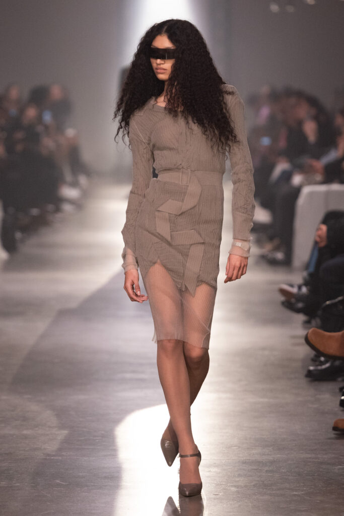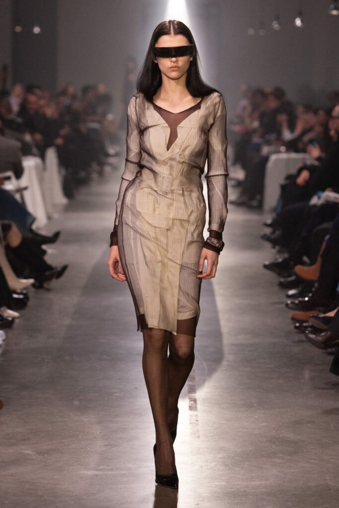 - Compression sculpturale : À l’inverse, certains modèles semblent forcés dans une dimension réduite, comme les robes seconde peau, où les matières comprimées simulent un mouvement figé, comme si un corps plus grand s’était infiltré dans une enveloppe trop petite.