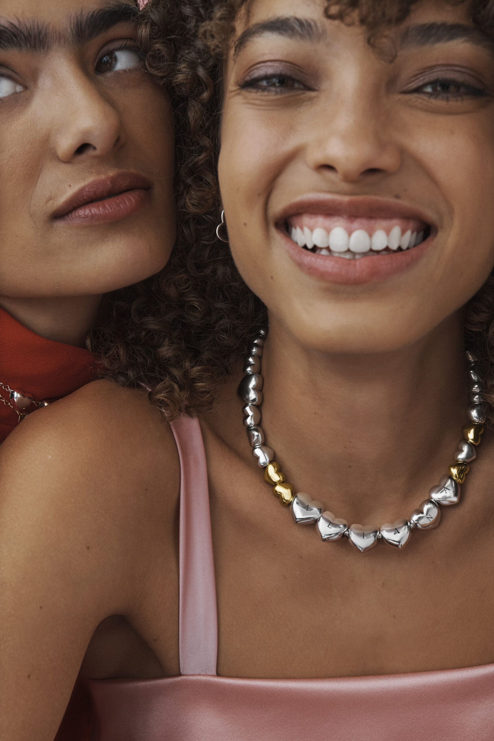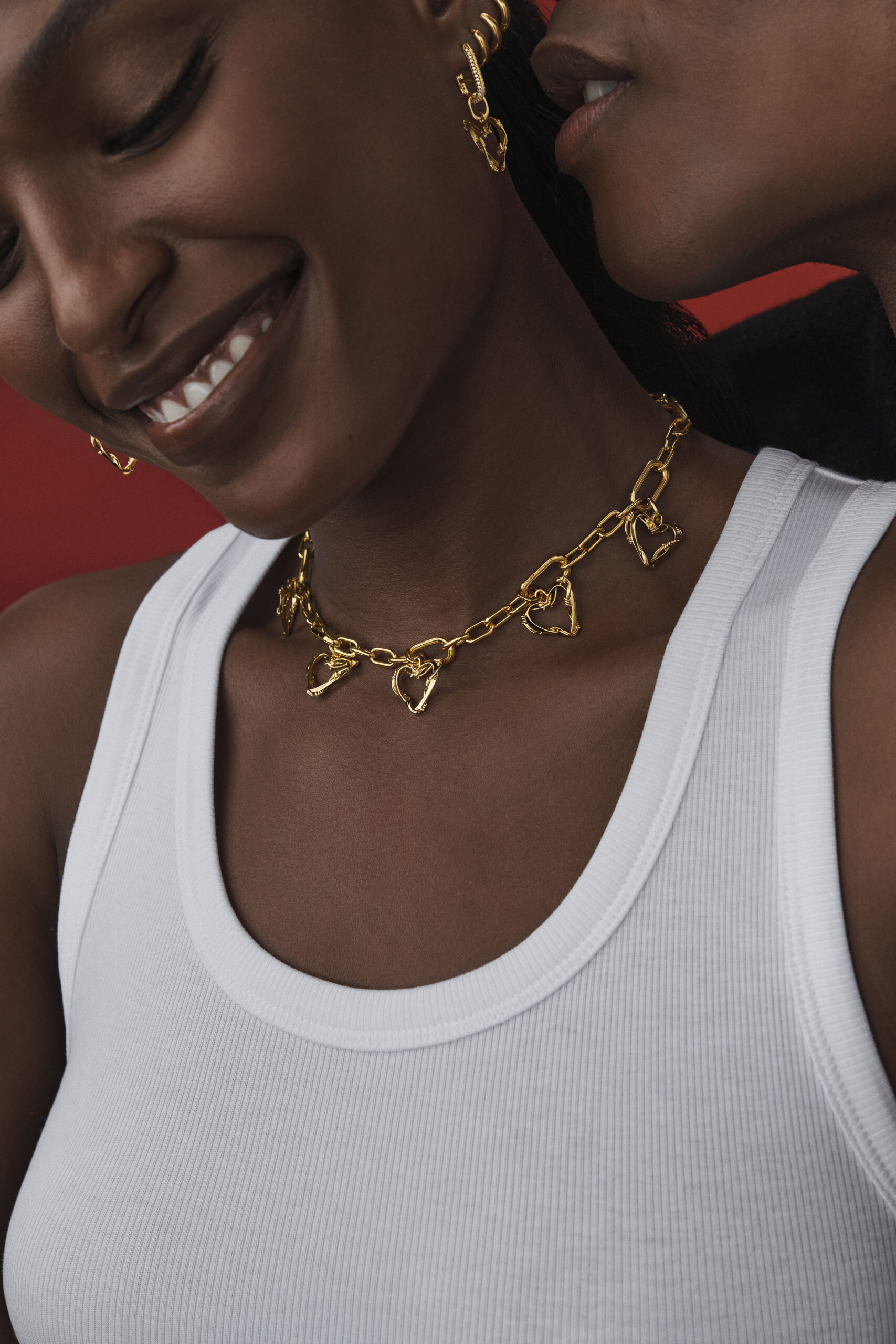 - Le Collier Maille Cubaine Pavée, véritable pièce maîtresse, revisite l’iconographie romantique avec une esthétique audacieuse et actuelle.