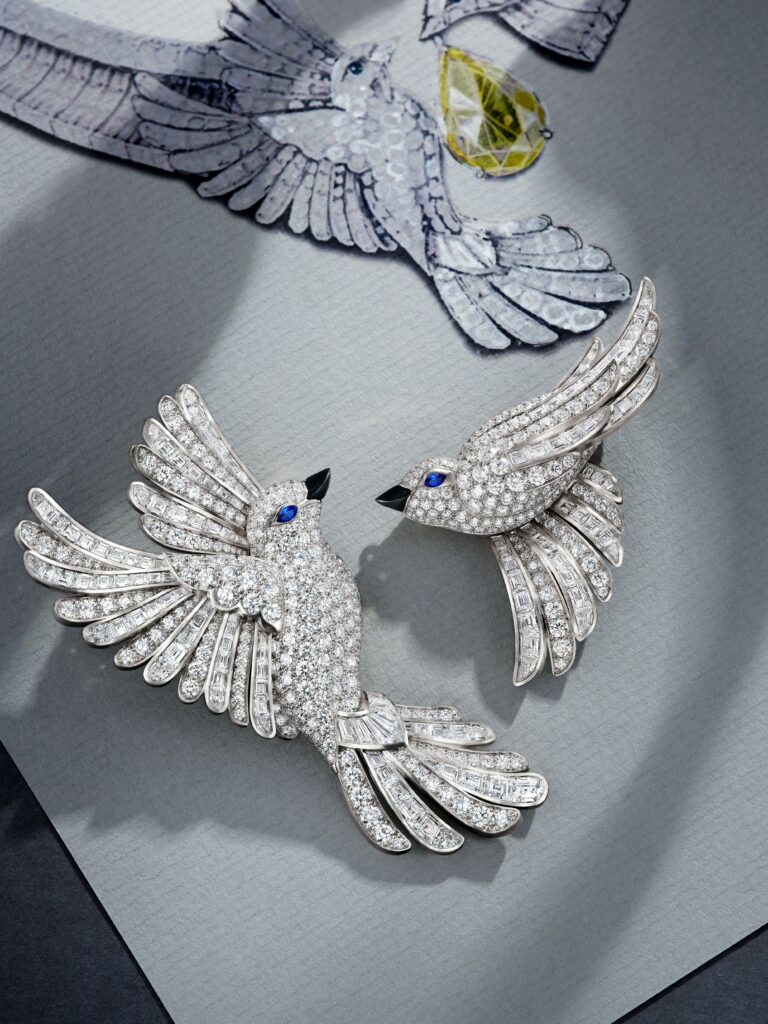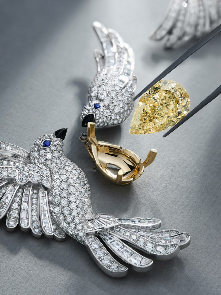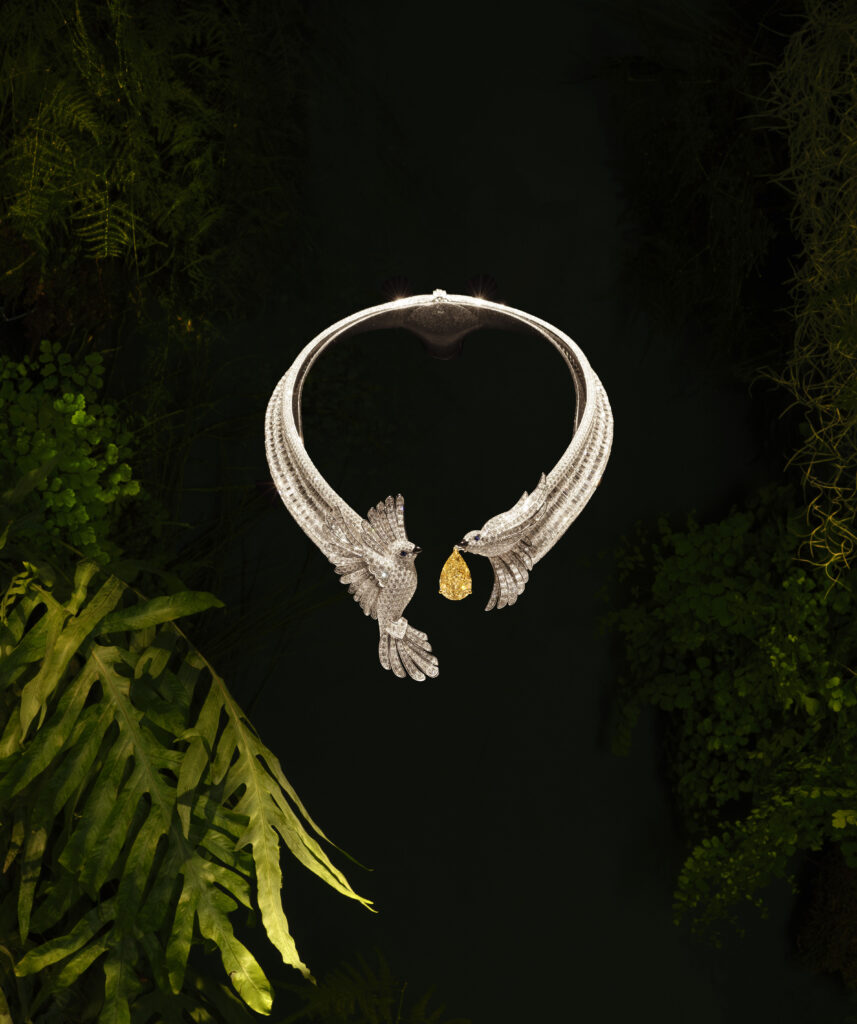 L’harmonie entre l’or blanc qui habille la monture et le diamant Fancy Intense jaune de 13,51 carats qui sépare les deux amoureux sublime cette création, tandis que leurs yeux sertis de saphirs d’un bleu profond et leurs becs en onyx noir confèrent au collier une intensité saisissante.