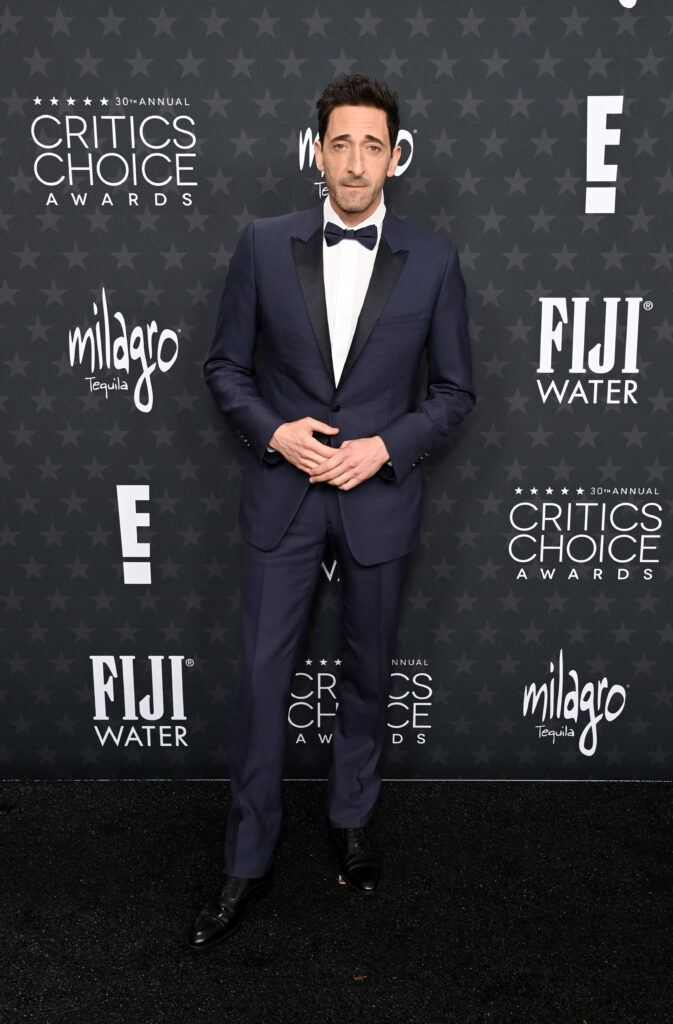 Adrien Brody, incarnation du chic effortless, a opté pour un smoking bleu marine à revers en pointe, accompagné d’un nœud papillon en soie et de derbies en cuir noir. Adam Brody, dans un classicisme absolu, a privilégié un smoking noir à revers en pointe, sans fioritures mais d’une élégance irréprochable.