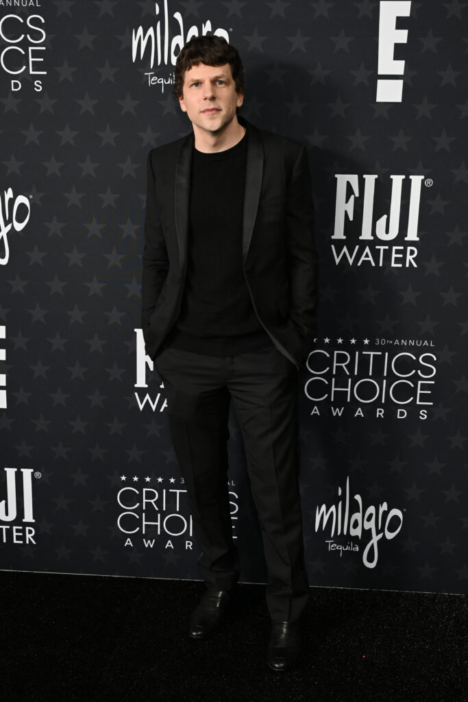 Enfin, Jesse Eisenberg a préféré l’épure d’un smoking noir à col châle, modernisé par un pull en laine noir, une alternative subtile aux codes du tapis rouge.