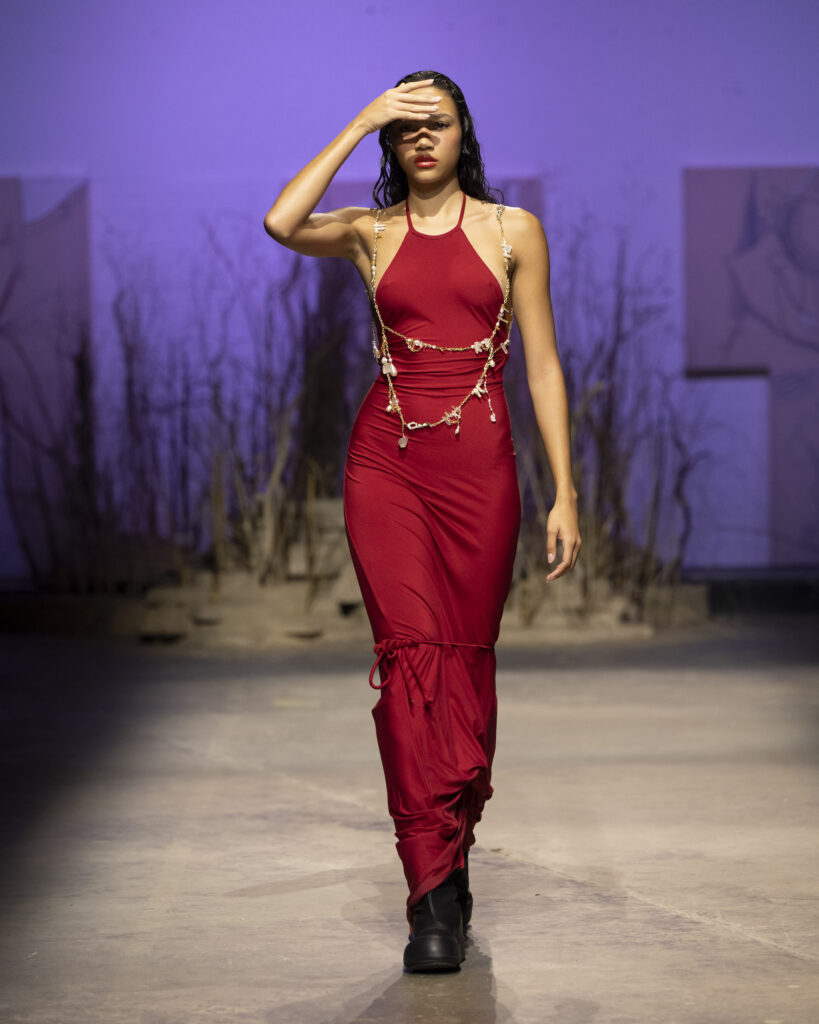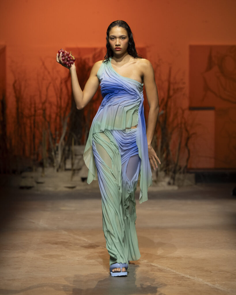 La collection est imprégnée d’une atmosphère de réalisme magique, où chaque pièce transforme le quotidien en mythique. Les silhouettes longues et fluides brouillent les frontières entre rêve et réalité, et les décors du défilé comprennent des peintures de trois mètres de long, réalisées par la designer elle-même. Ces œuvres d’art racontent ses expériences personnelles — la quête et la perte de l’amour, la douleur et le plaisir, la divinité et le désir. La collection DI PETSA Printemps-Été 2025 est une audacieuse exploration de la vulnérabilité, du désir et du chemin labyrinthique de la connaissance de soi, nous invitant à accepter les parties cachées de nous-mêmes, permettant ainsi de ressentir à la fois la libération et la rédemption.