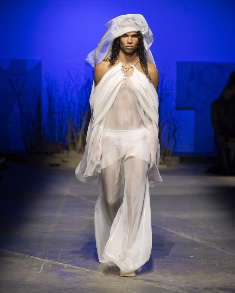 Pour cette saison, DI PETSA introduit également des vêtements masculins genrés. Le célèbre Wetlook a été retravaillé pour la silhouette masculine, se transformant en teintes dégradées pastel, et a également évolué en éléments du quotidien, tels que des sweats à capuche en coton blanc drapés et des pantalons.