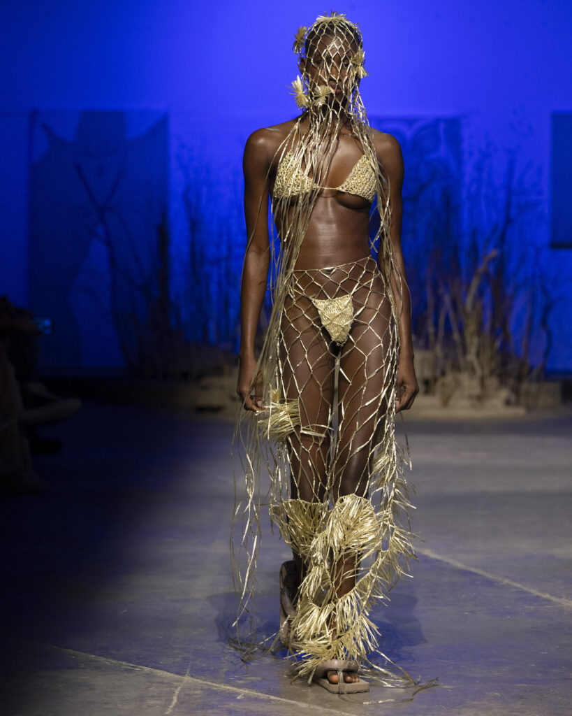 Un des accents les plus audacieux de la saison est le motif du sang menstruel, symbolisant la force féminine et la cyclicité de la vie. Des imprimés de taches sanguines décorent plusieurs modèles, dont les célèbres jeans « Blood Masturbation Denim », défiant les idées traditionnelles sur les fluides corporels féminins et célébrant les rythmes naturels du corps. Les mannequins sur le podium sont représentées avec des taches de sang sur les mains, tandis que leurs cheveux s’entrelacent avec du sable, créant une sensualité éphémère, comme si elles venaient tout juste de sortir de moments intimes laissant une trace sur leur corps.