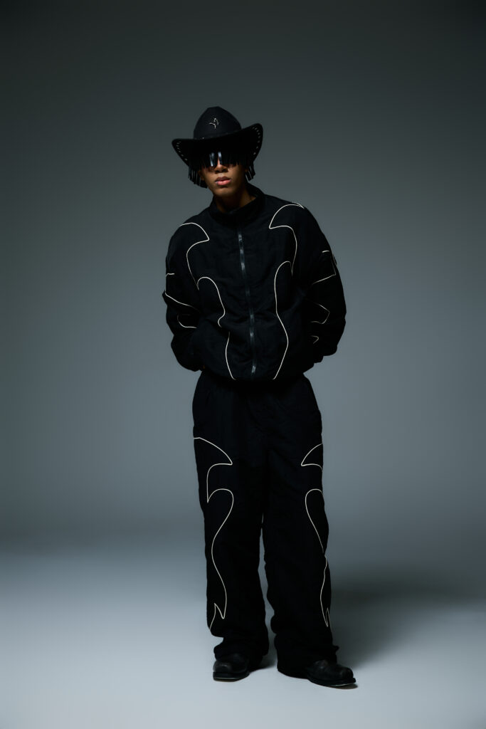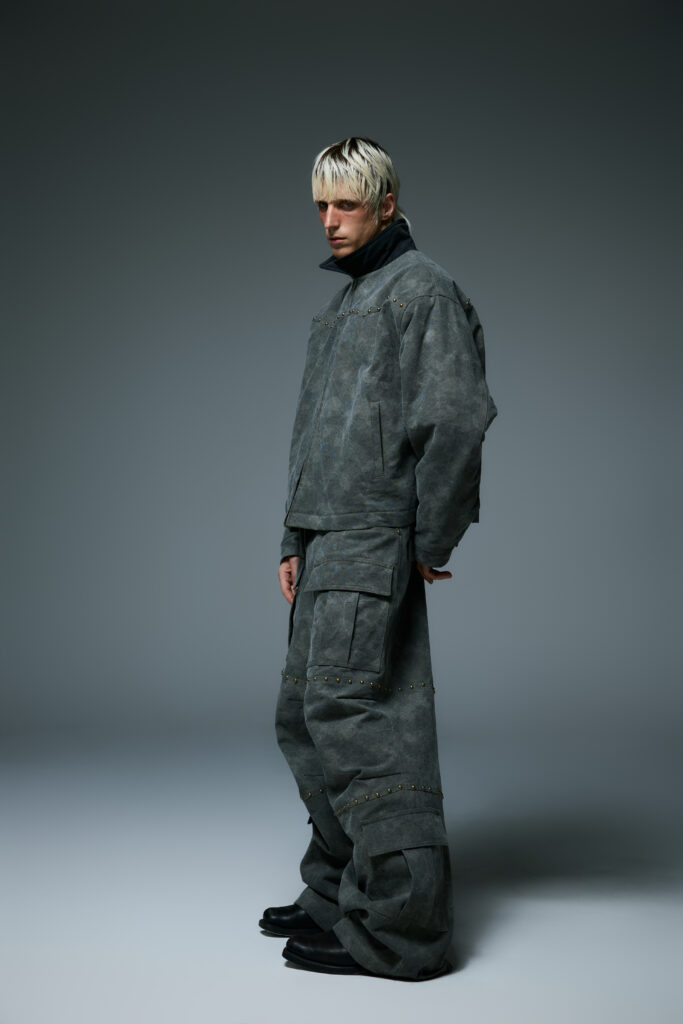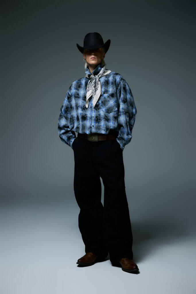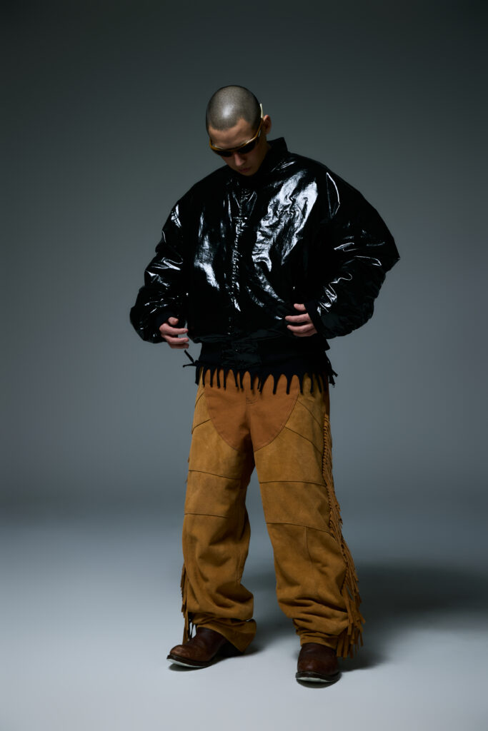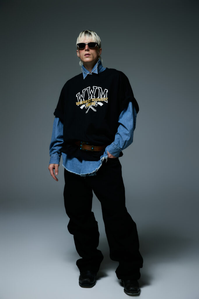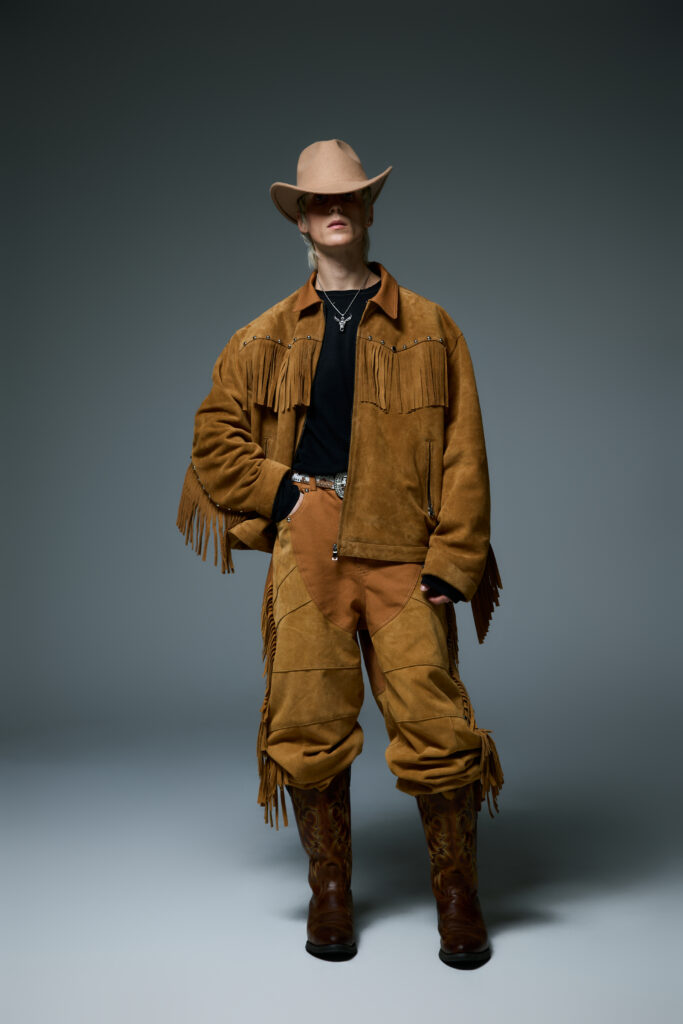 Pour souligner l’atmosphère mystérieuse de « Wild West Midnight », LIBERE intègre des éléments tels que des bijoux et des clous dans ses créations. Ces accessoires, minutieusement intégrés, ajoutent une touche de sophistication brute et ancrent davantage la collection dans cet univers hybride entre western et modernité urbaine.