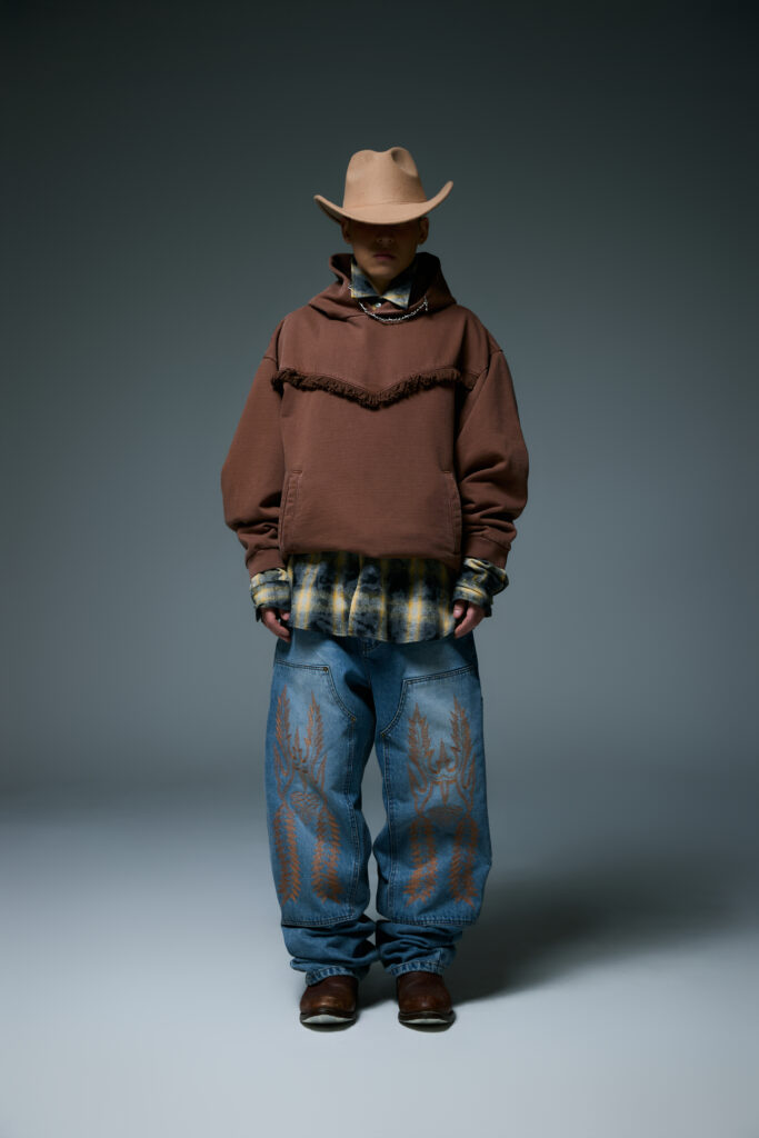 LIBERE exprime cette dualité dans son streetwear signature. Les coupes oversized, traitées avec un effet vintage, s’élargissent cette saison avec des silhouettes larges et crops, sublimées par des motifs travaillés et des détails raffinés. Ces pièces traduisent une énergie robuste tout en conservant une sensibilité délicate, propre à l’esprit western.