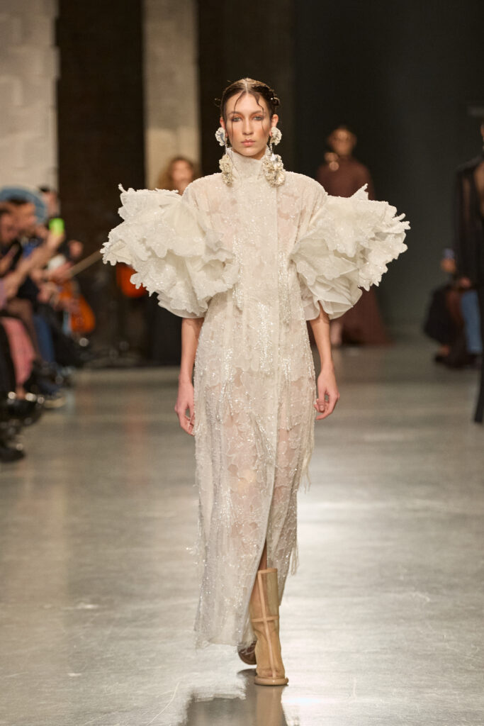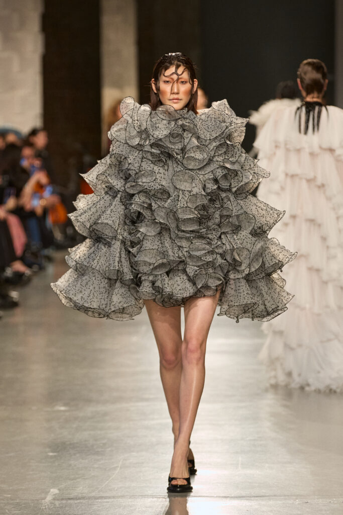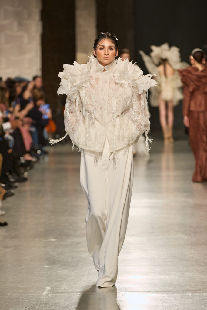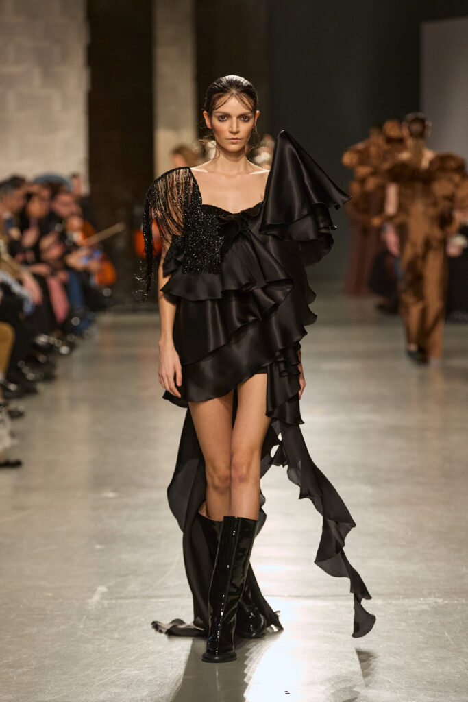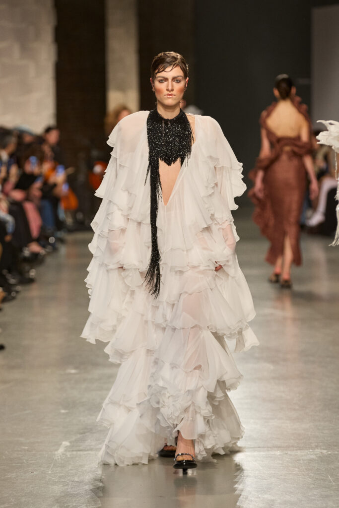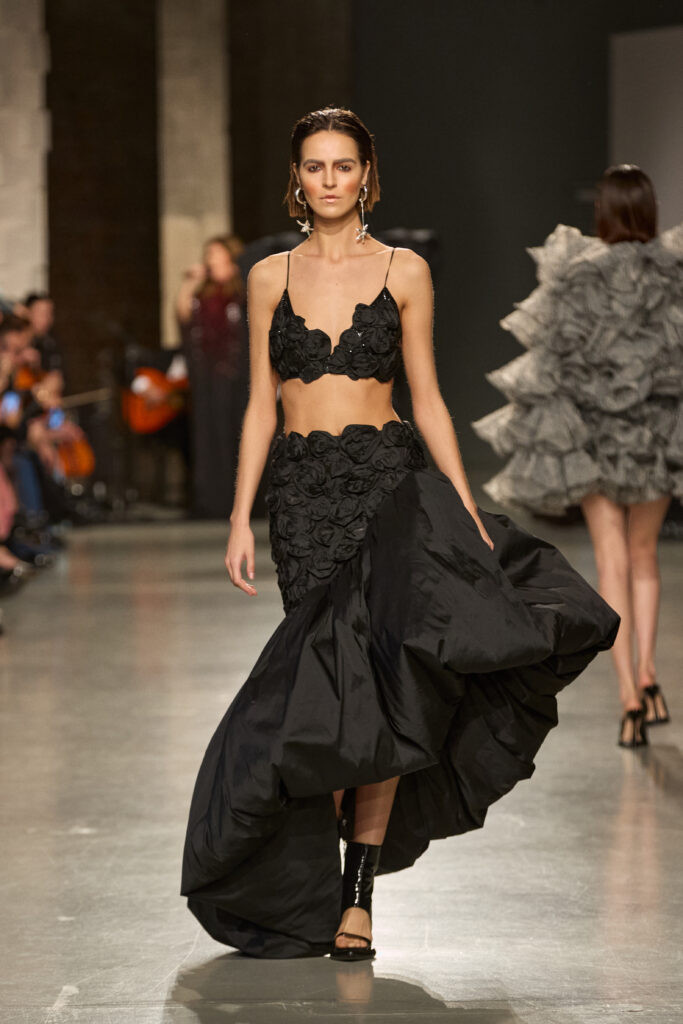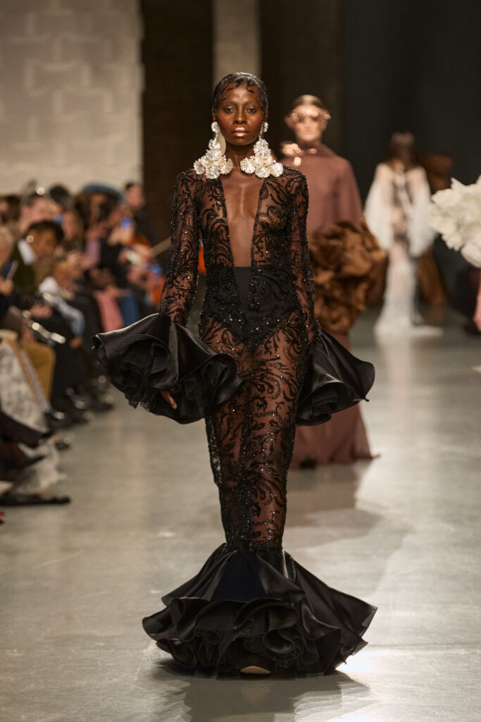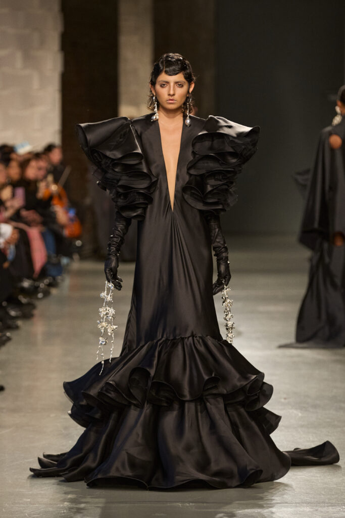 C’est au Saut du Loup du Palais de Tokyo que la créatrice andalouse Juana Martin, première créatrice espagnole à intégrer le calendrier officiel de la Haute Couture Paris depuis 2022, a dévoilé sa collection Identitad, un hommage à ses racines et au flamenco, réinterprété avec une modernité éclatante.