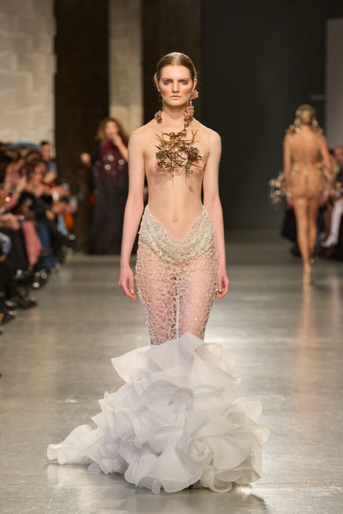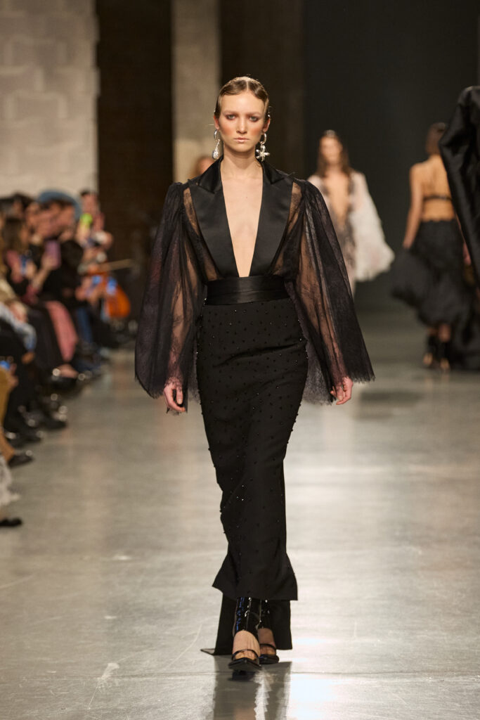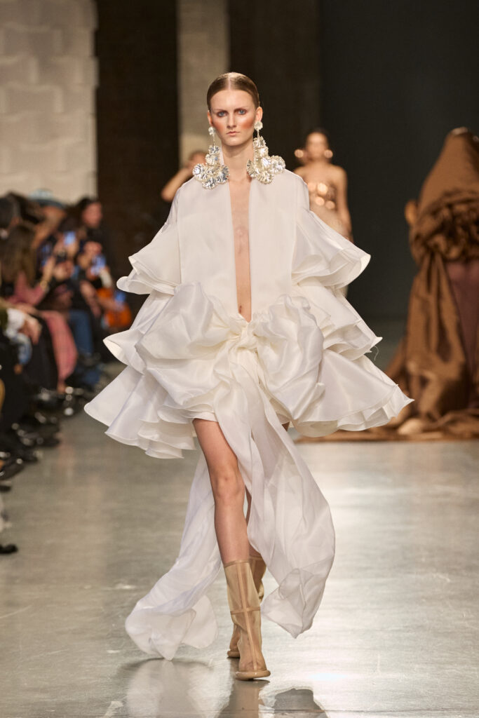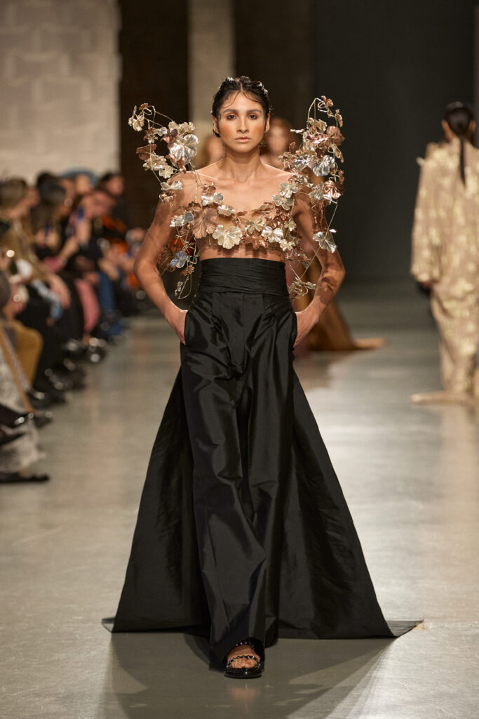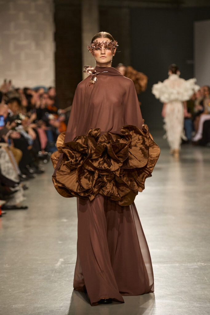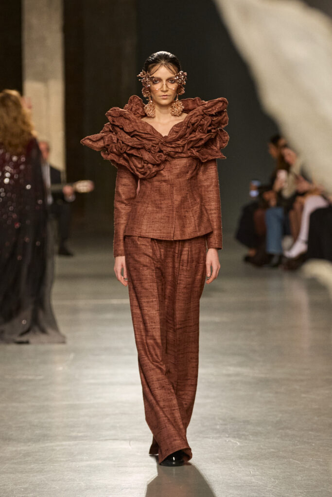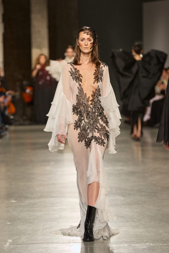 C’est au Saut du Loup du Palais de Tokyo que la créatrice andalouse Juana Martin, première créatrice espagnole à intégrer le calendrier officiel de la Haute Couture Paris depuis 2022, a dévoilé sa collection Identitad, un hommage à ses racines et au flamenco, réinterprété avec une modernité éclatante.