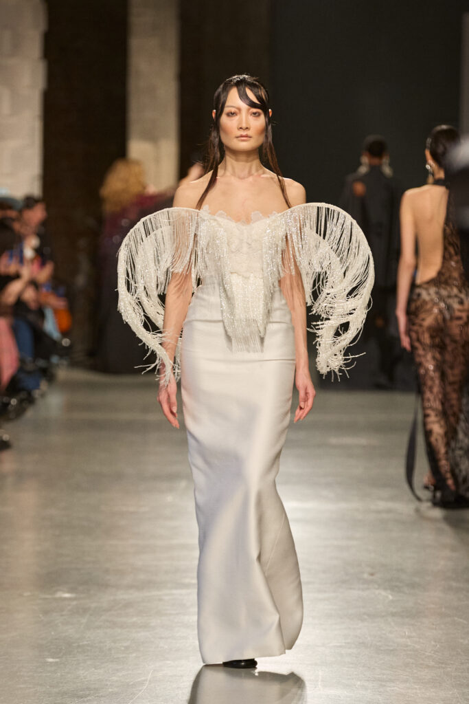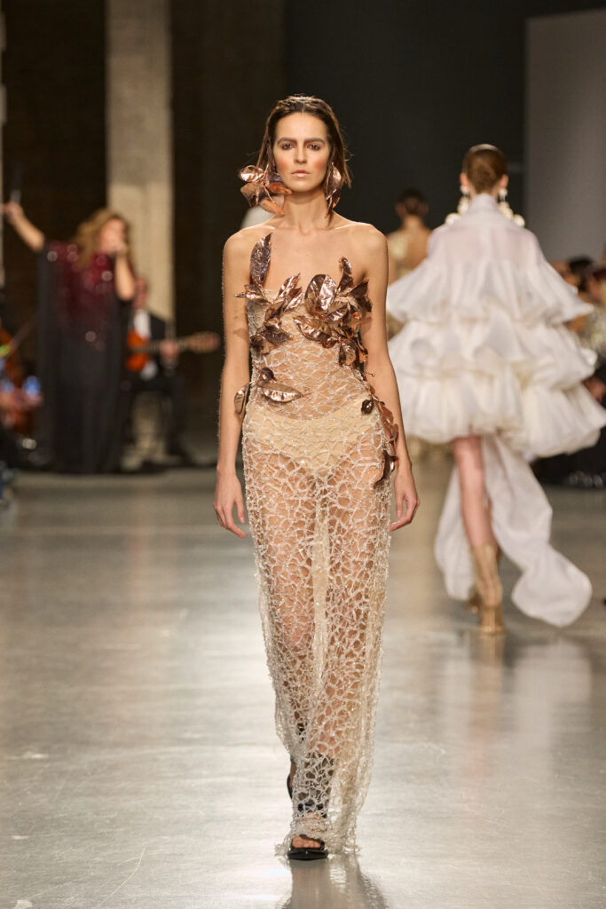 Sous l’envoûtante mélodie de la voix d’Estrella Morente, chanteuse de flamenco qui a prêté son âme à ce défilé unique, les créations prennent vie, incarnant la puissance et la passion féminine à travers des sequins éclatants, des franges aériennes et des coupes raffinées évoquant l’esprit des années 20.