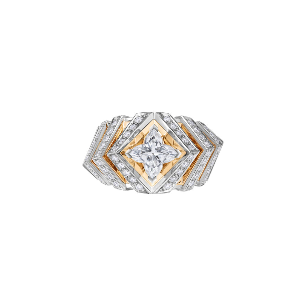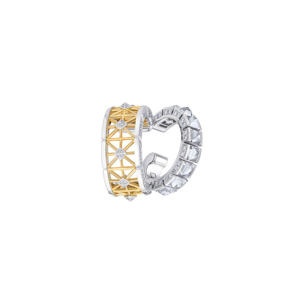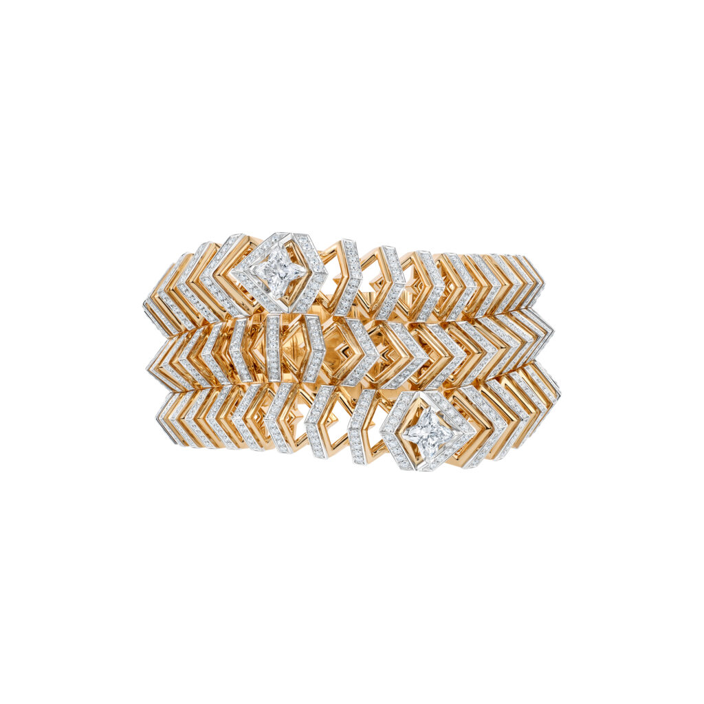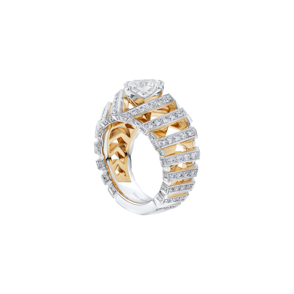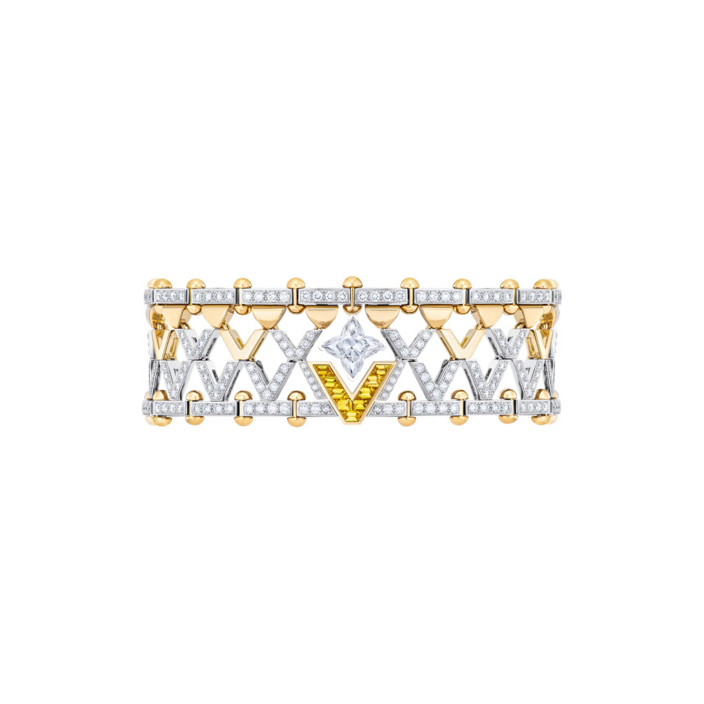 - Dynamisme : une suite de créations où l’emmaillement bicolore électrise le motif chevron, ponctué de diamants LV Monogram Star.