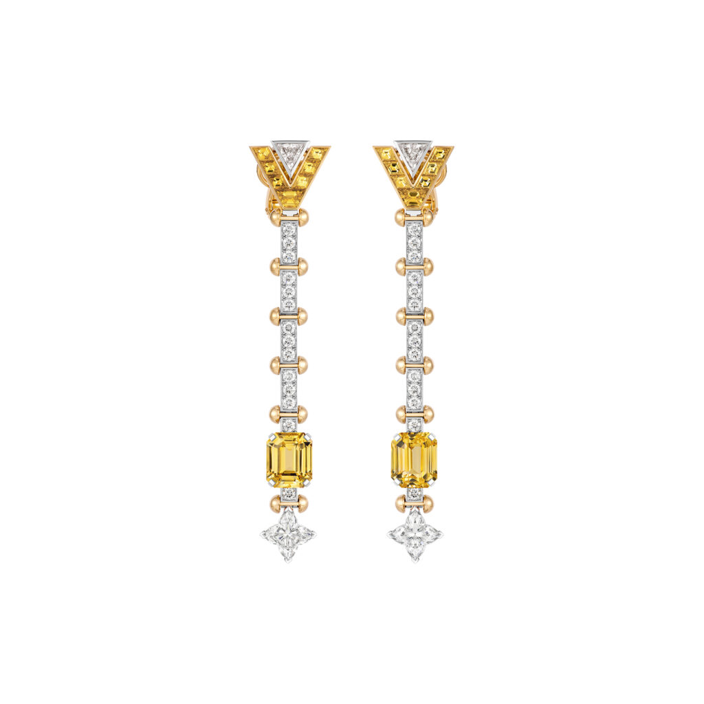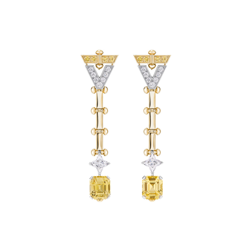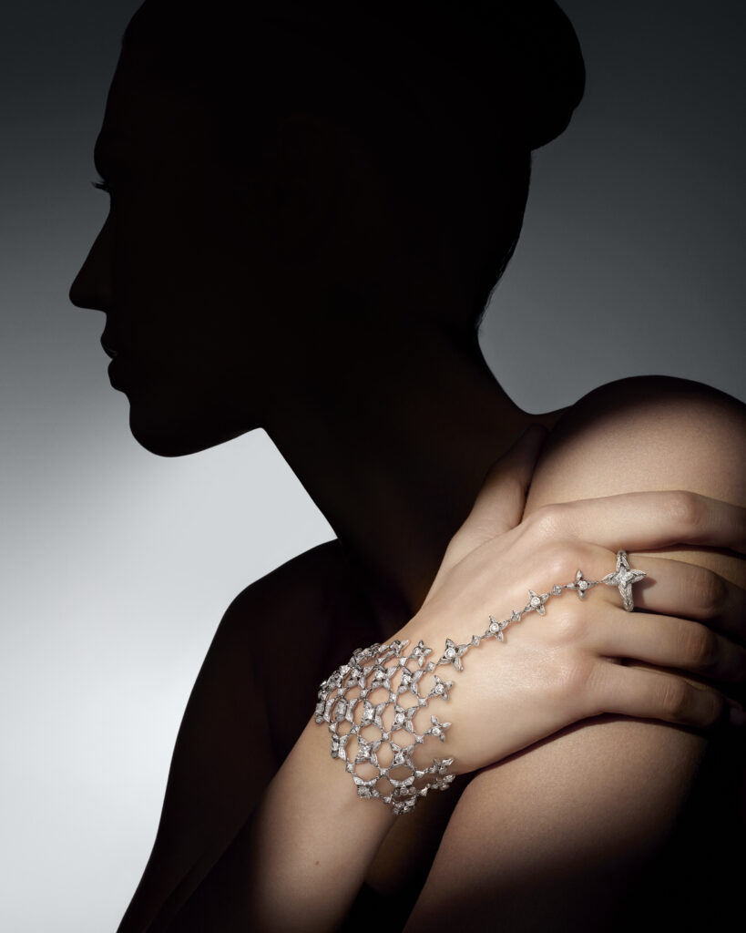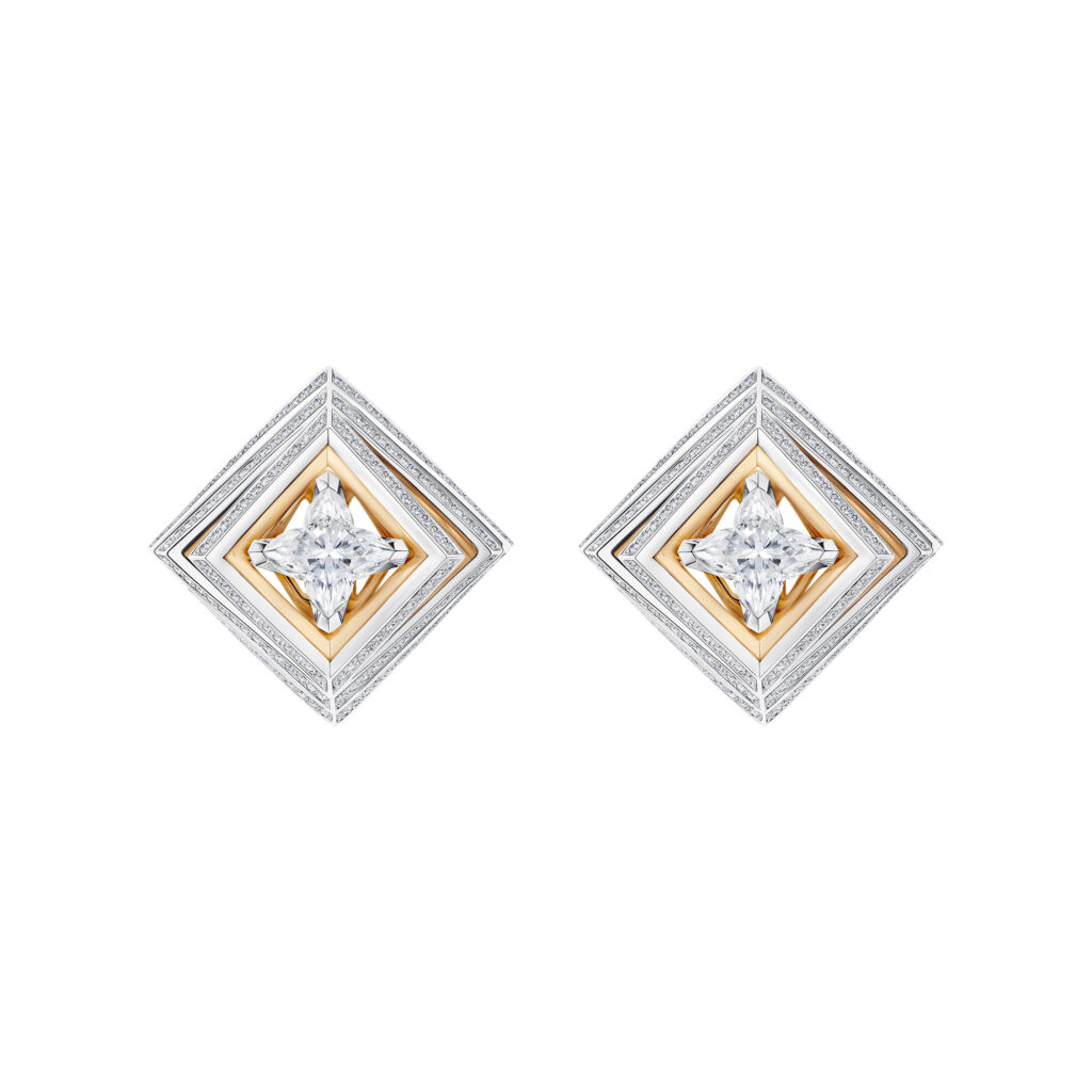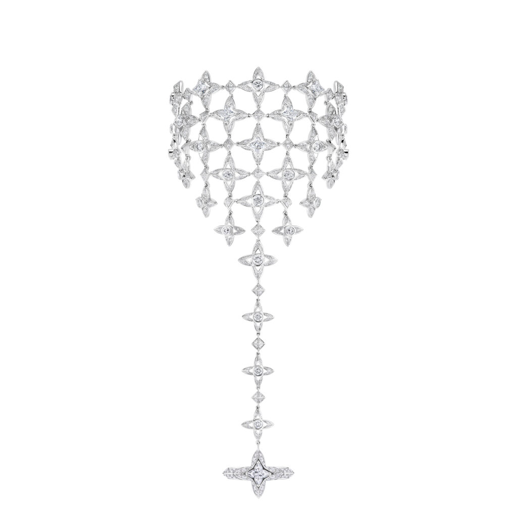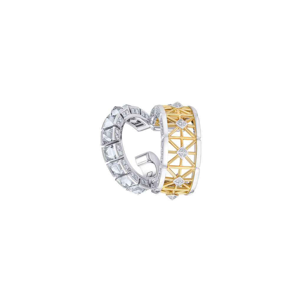 - Dynamisme : une suite de créations où l’emmaillement bicolore électrise le motif chevron, ponctué de diamants LV Monogram Star.