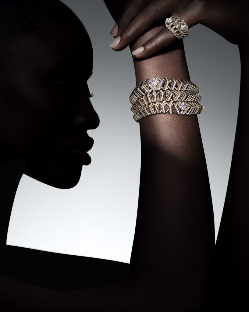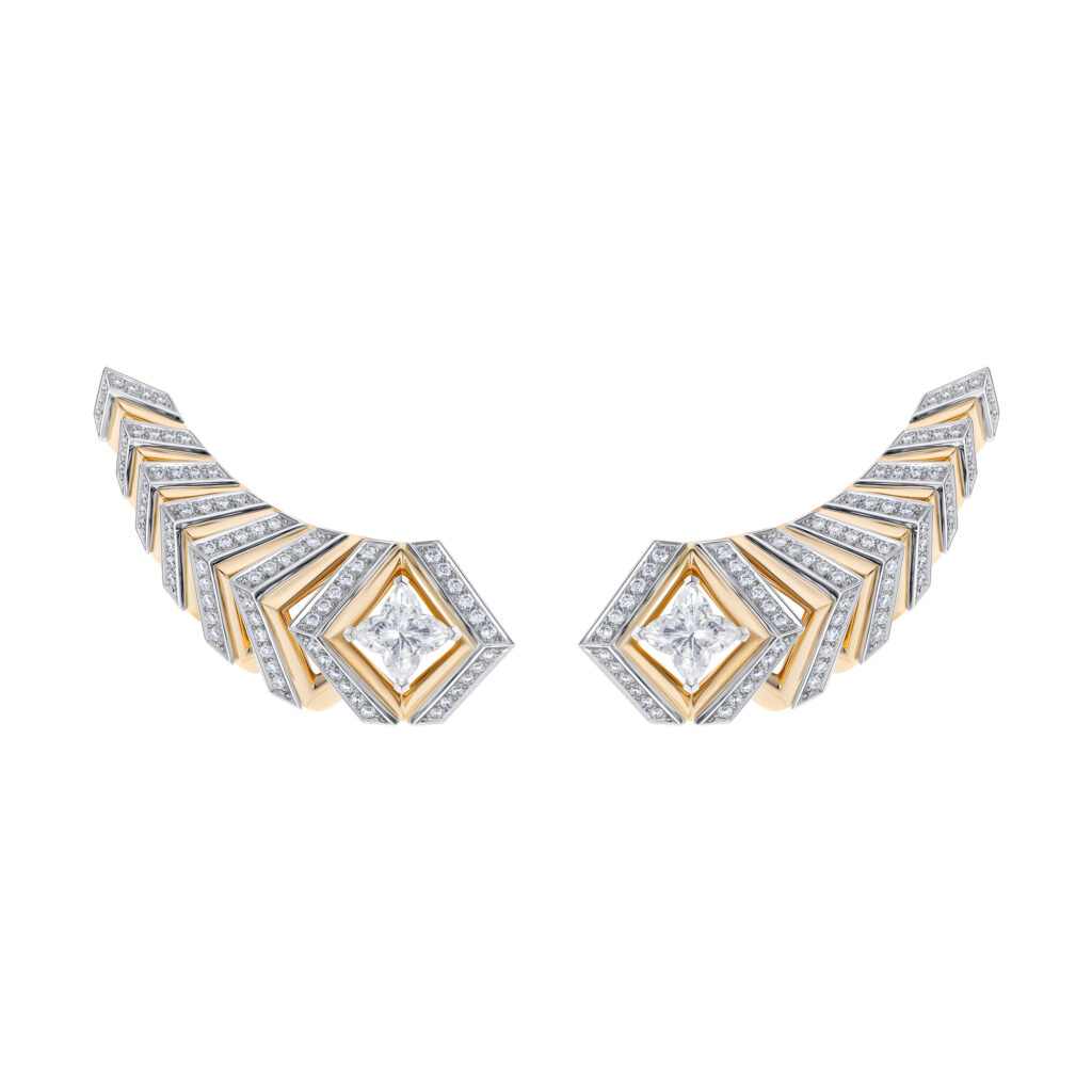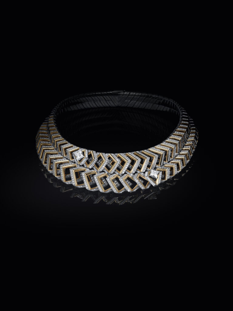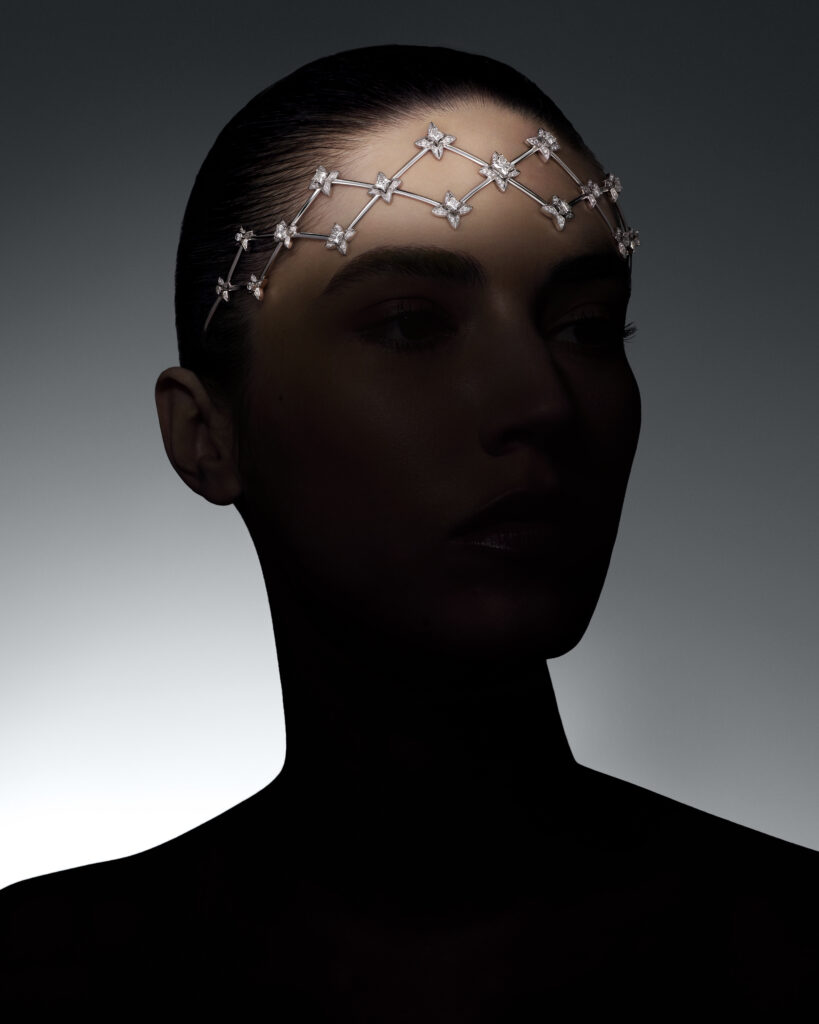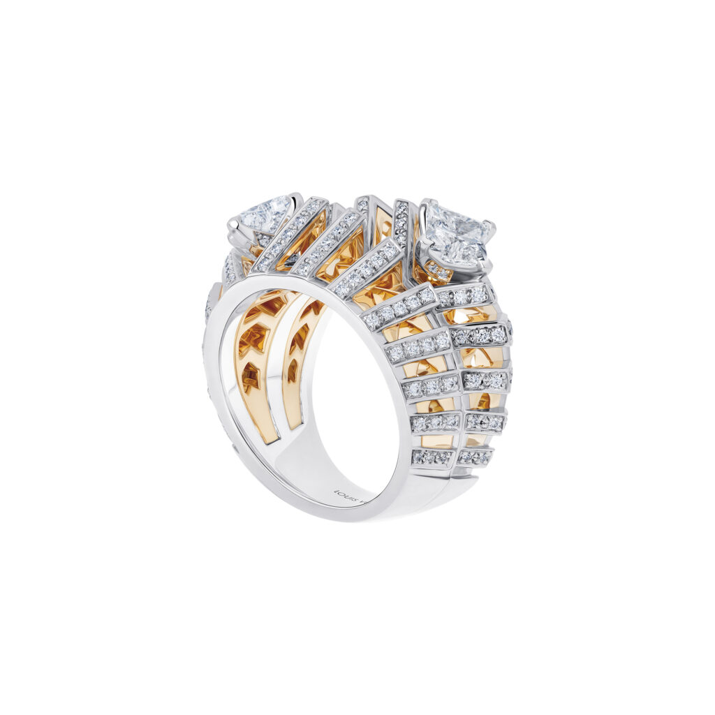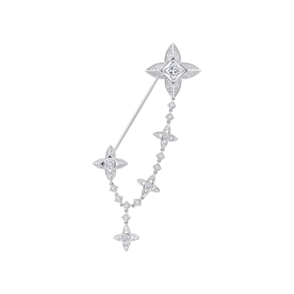 - Dynamisme : une suite de créations où l’emmaillement bicolore électrise le motif chevron, ponctué de diamants LV Monogram Star.
