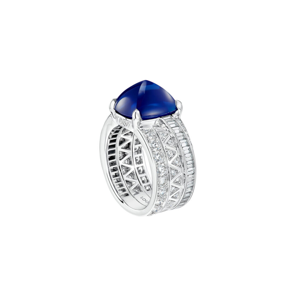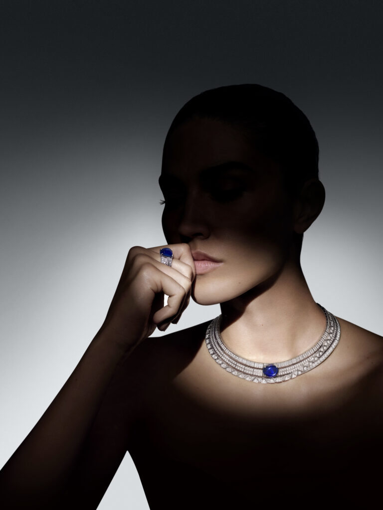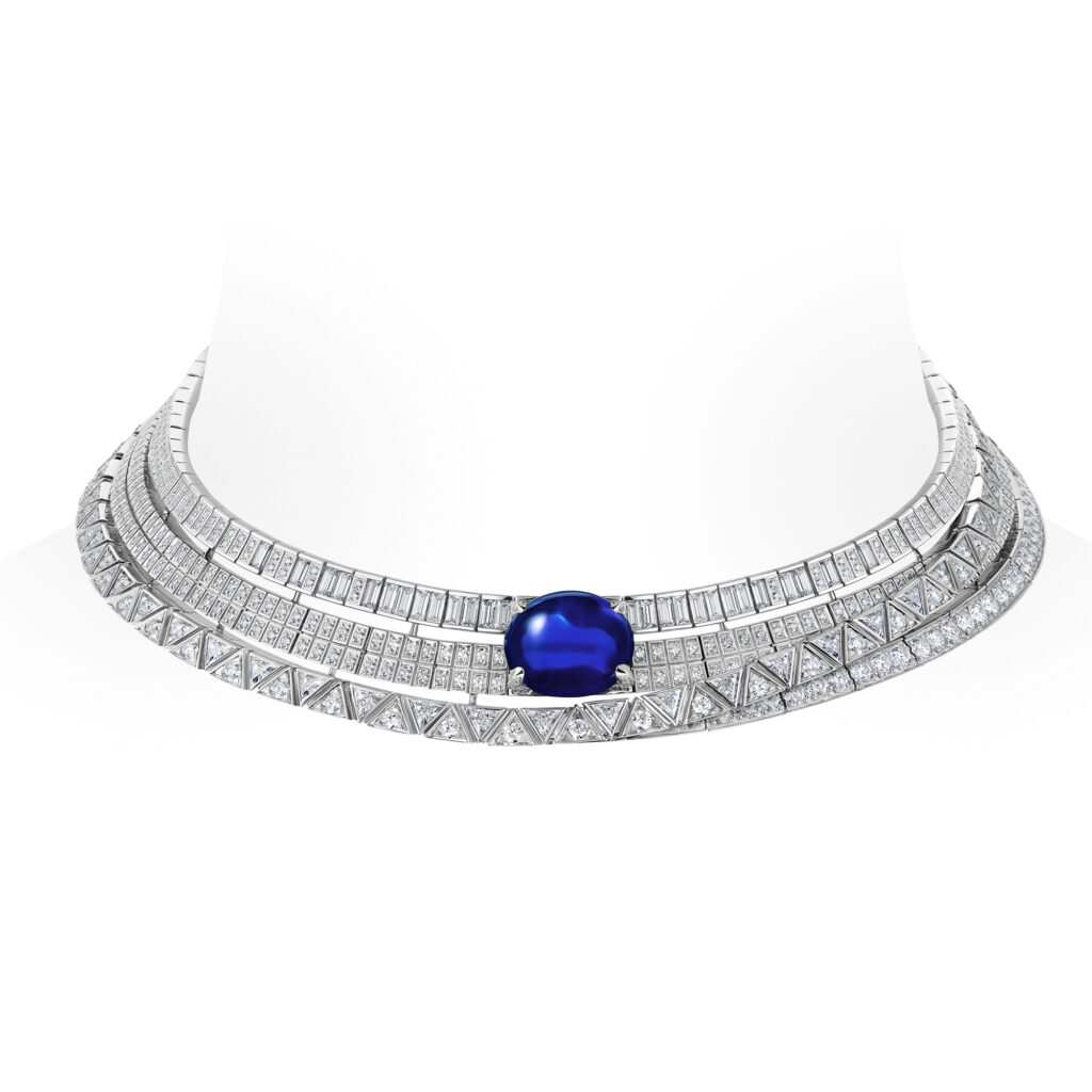 - Gravité : un collier en or blanc et diamants, inspiré du Pendule de Foucault, mettant en vedette un saphir du Cachemire de 6,48 carats.