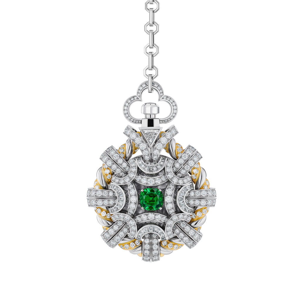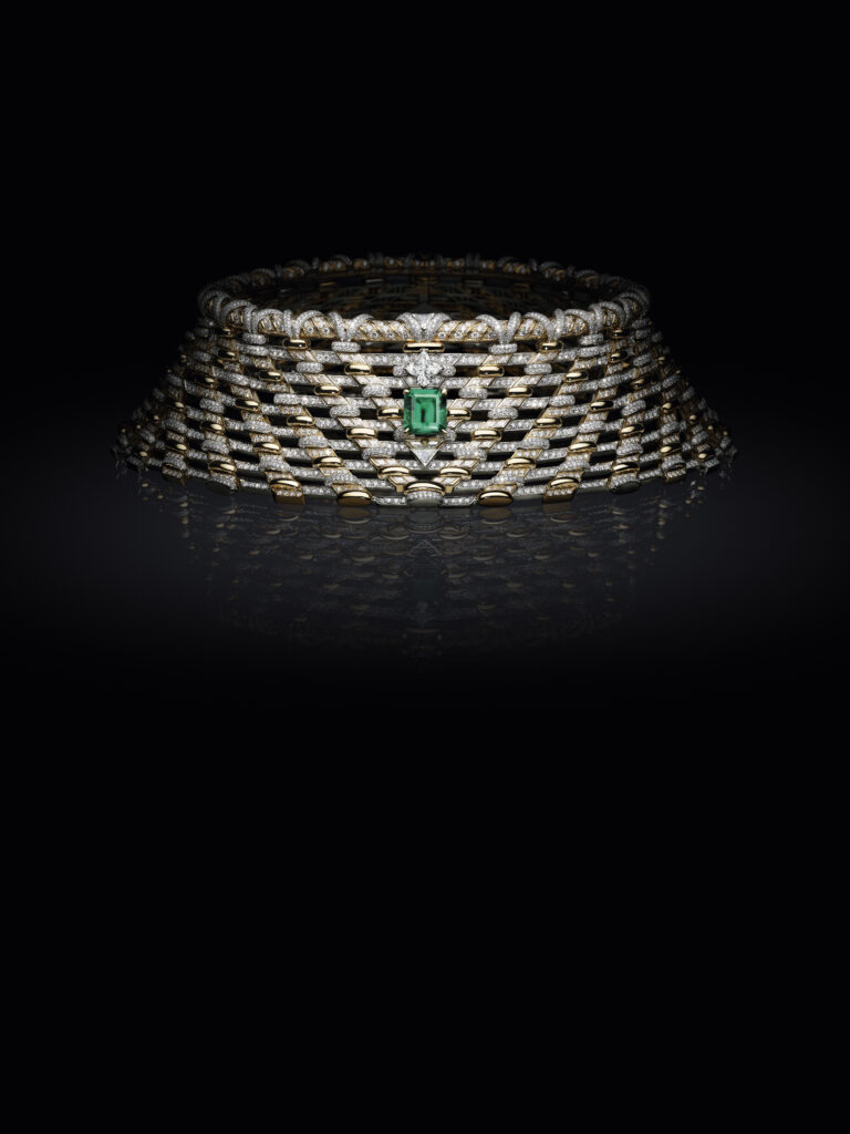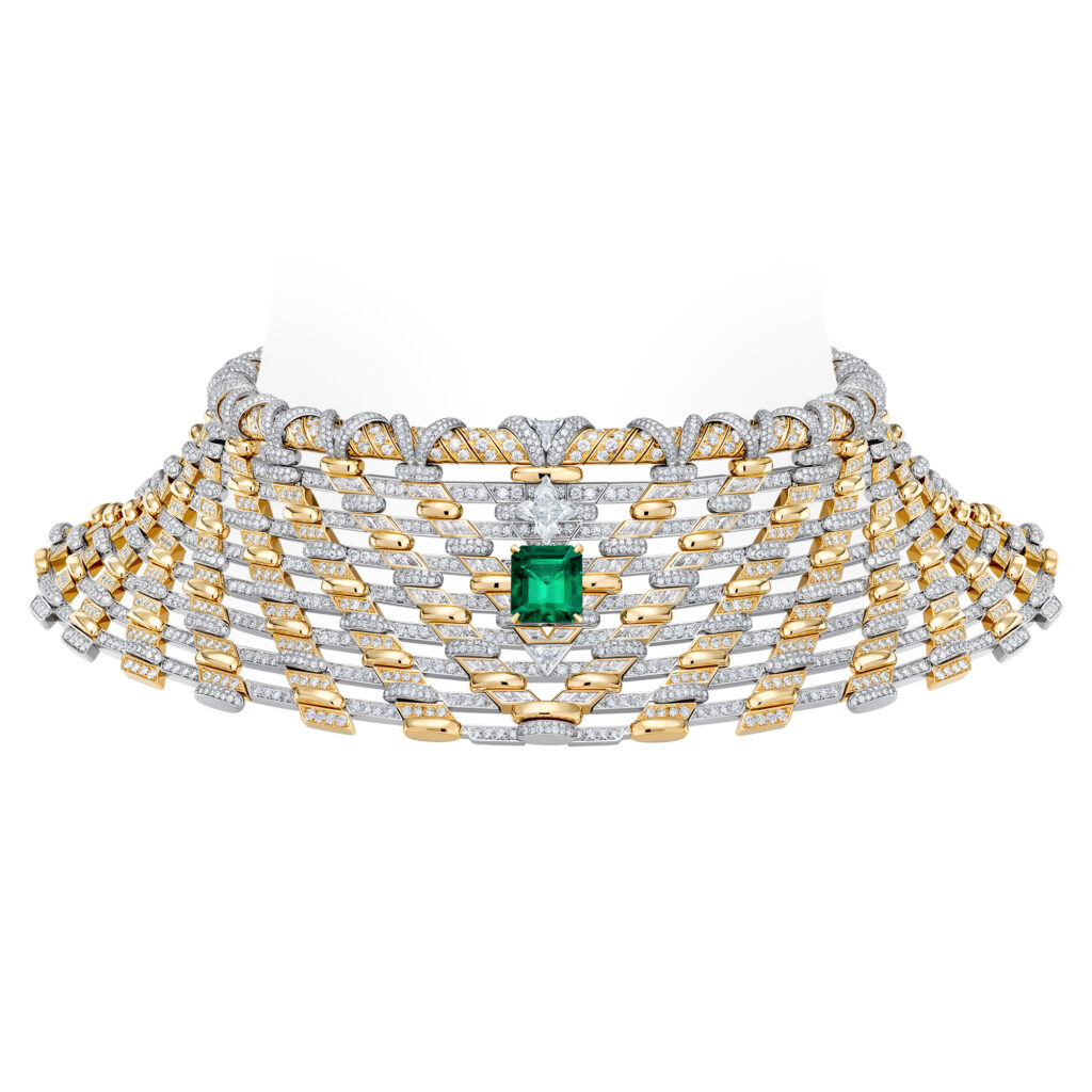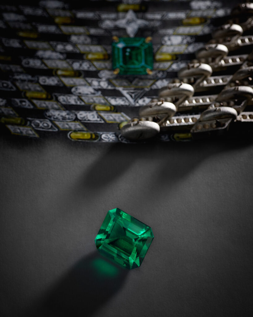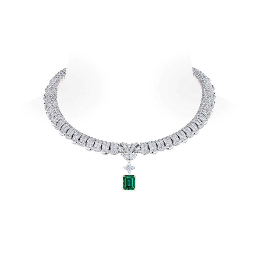 - Phénoménal : un hommage à l’art de la porcelaine avec un collier en maillage ajouré, sublimé d’une émeraude colombienne de 7,44 carats et d’un diamant LV Monogram Star.
