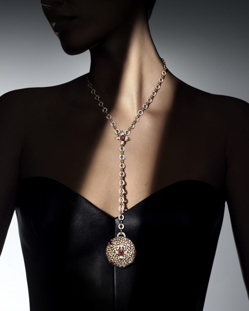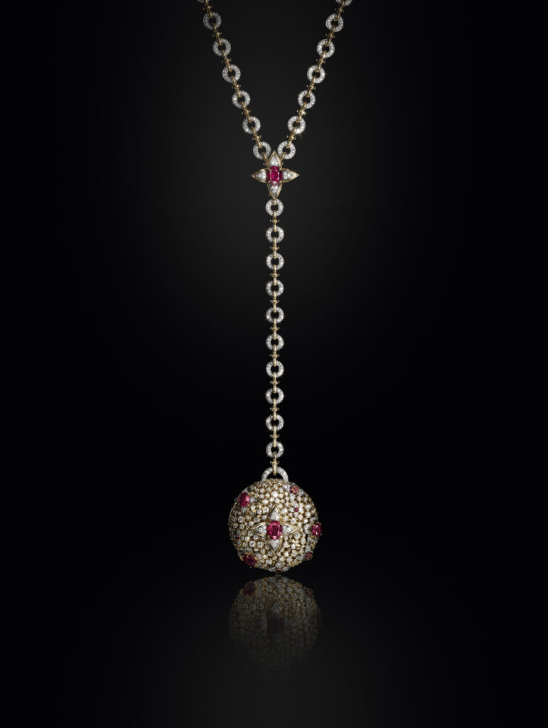 - Splendeur : un collier somptueux en or jaune et platine, illuminé de rubis du Mozambique et de motifs inspirés des décors impériaux.