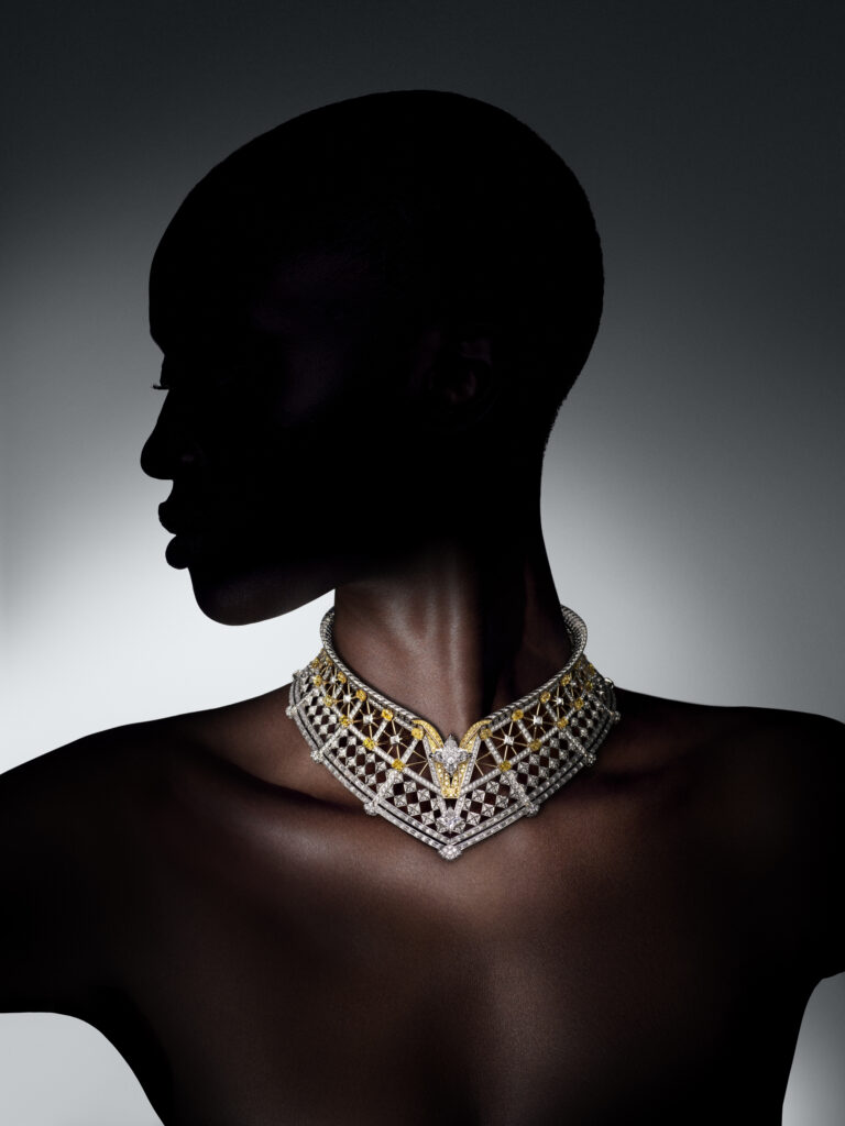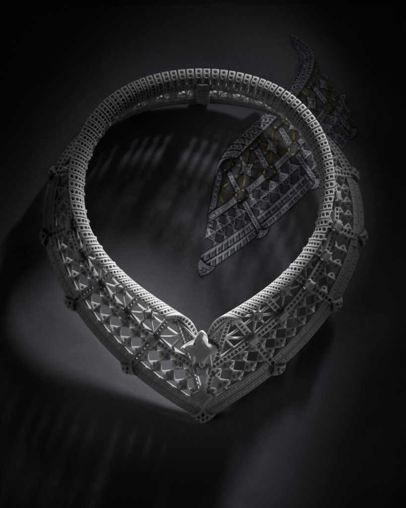 - Victoire : l’apogée de la collection, avec un collier architectural en hommage à la Tour Eiffel, nécessitant plus de 3 923 heures de travail et mettant en scène deux diamants LV Monogram Star de 10,43 et 3,08 carats.