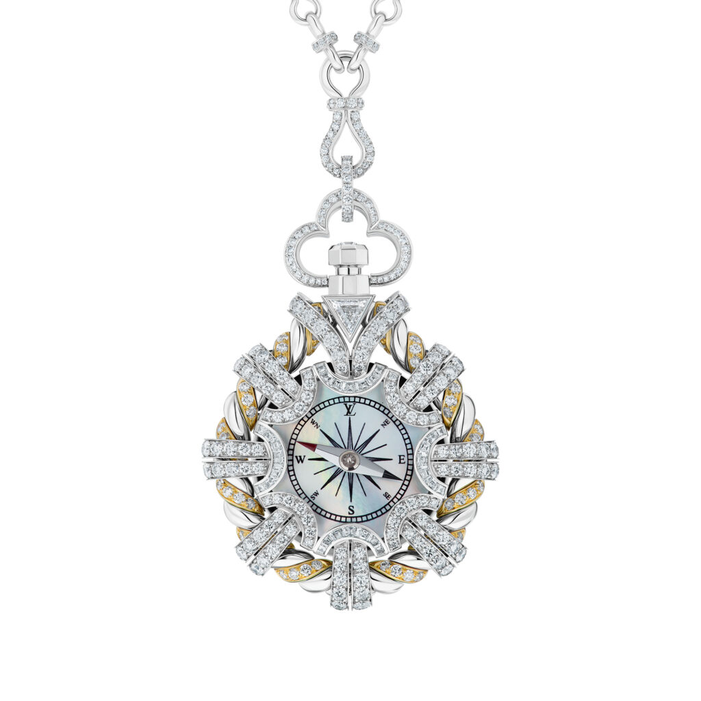 Pour la première fois, Louis Vuitton introduit une capsule dédiée aux hommes, comprenant une boussole sculptée à la main, une montre de poche ornée de tsavorites et deux broches inspirées de l’élégance du XIXᵉ siècle.
