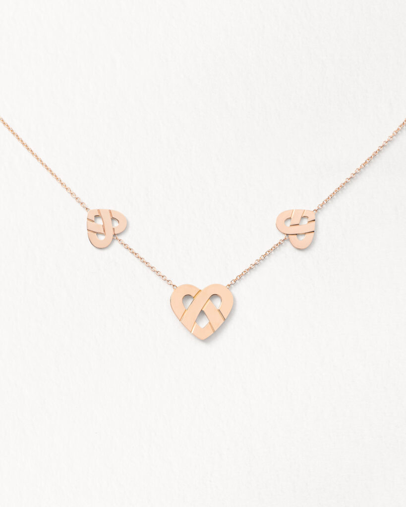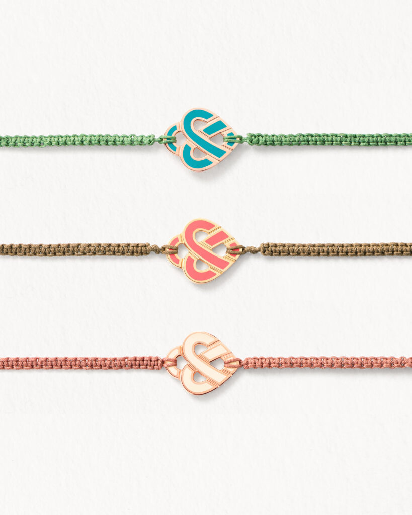 Le Cœur Entrelacé, pièce phare de cette collection, se décline en pendentifs, bagues et boucles d’oreilles dans les trois ors. En version classique ou pavée de diamants, il incarne la romance éternelle. Les modèles en émail ivoire, corail ou bleu céladon apportent une touche moderne et fraîche, sublimée par des cordons assortis pour un look ludique et raffiné.