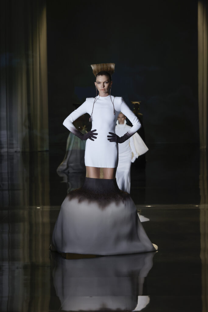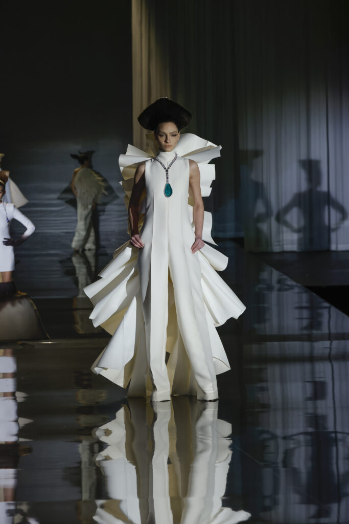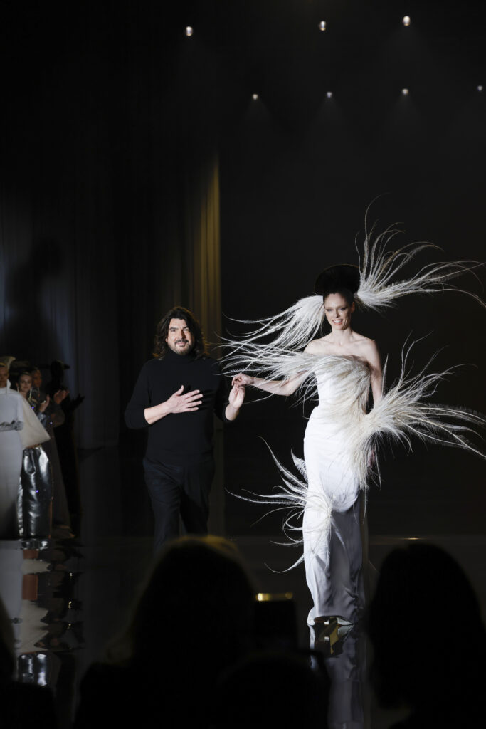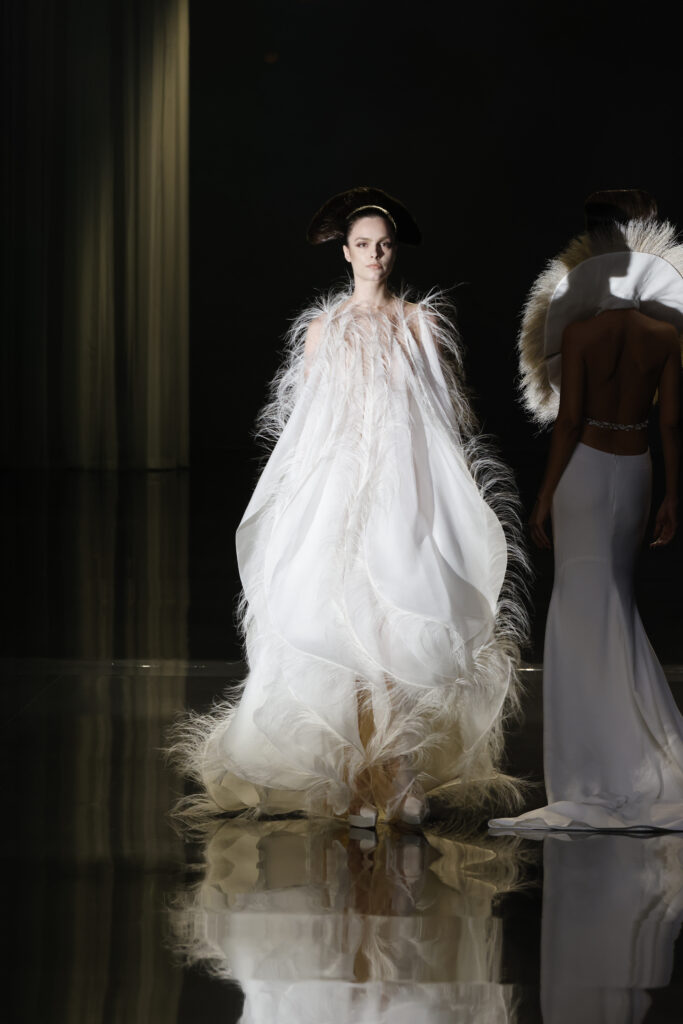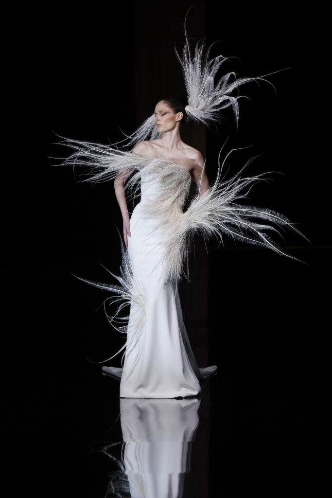 Le défilé s’achève sur une robe de mariée en crêpe blanc, ponctuée de vasques de gazar brodées de plumes. Une silhouette qui incarne la liberté, la grâce et l’avant-garde.