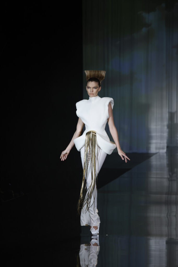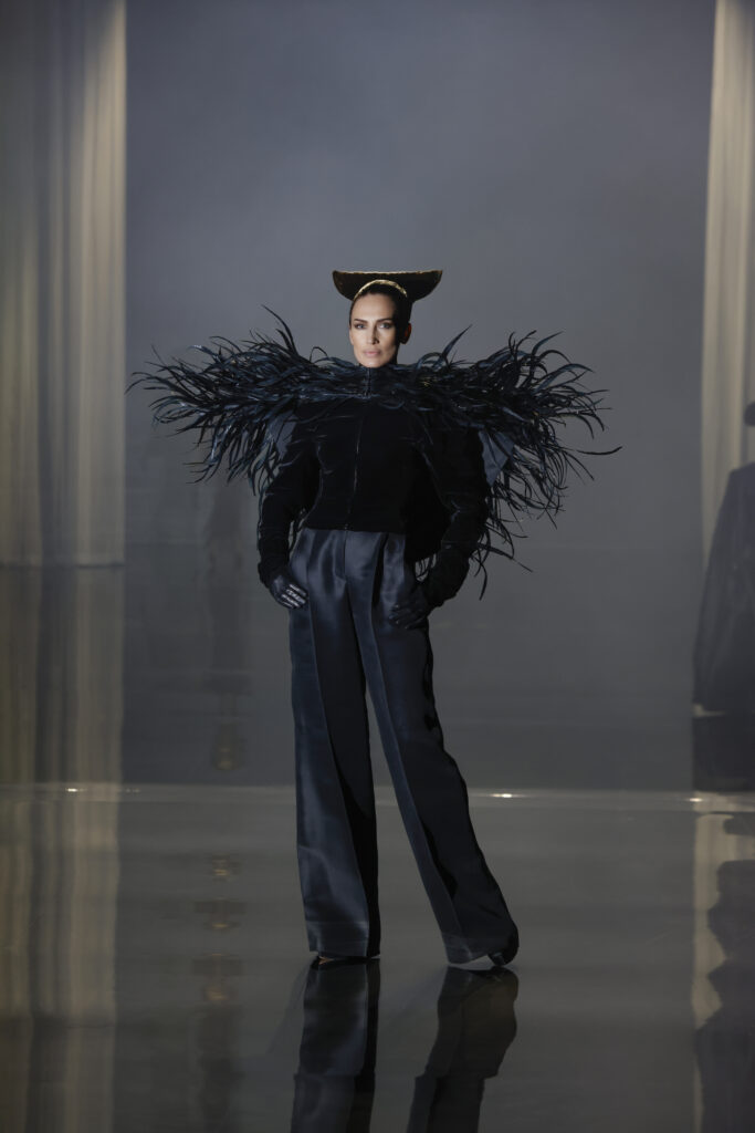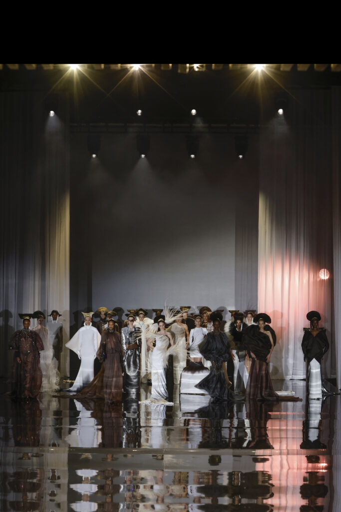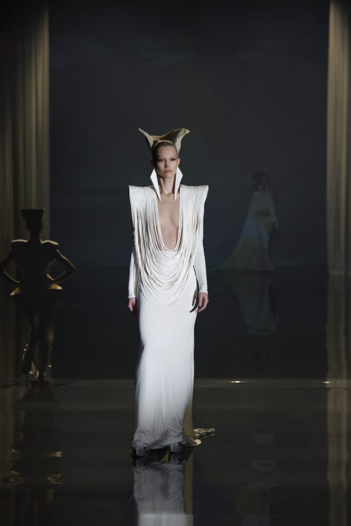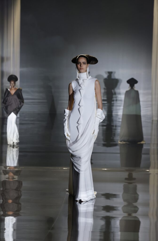 Le défilé s’achève sur une robe de mariée en crêpe blanc, ponctuée de vasques de gazar brodées de plumes. Une silhouette qui incarne la liberté, la grâce et l’avant-garde.