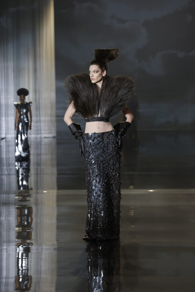Les textures se confrontent : cuir scarifié sur jupe d’organza brun, vestes brodées de longues franges de silicone, mousseline écorce parsemée de topazes et d’ébène. Les plumes brûlées habillent un gilet de satin, le bois s’invite sur du velours lamé argent, et l’or brillant des bijoux plastron évoque L’Oiseau de Brancusi.