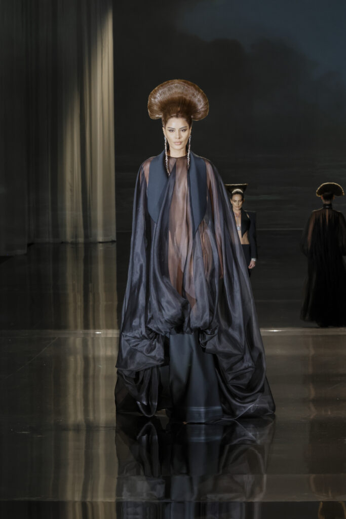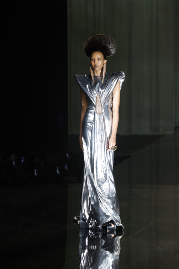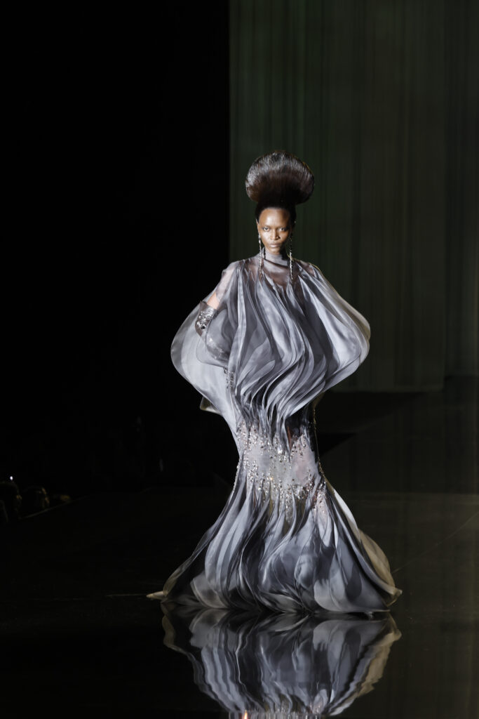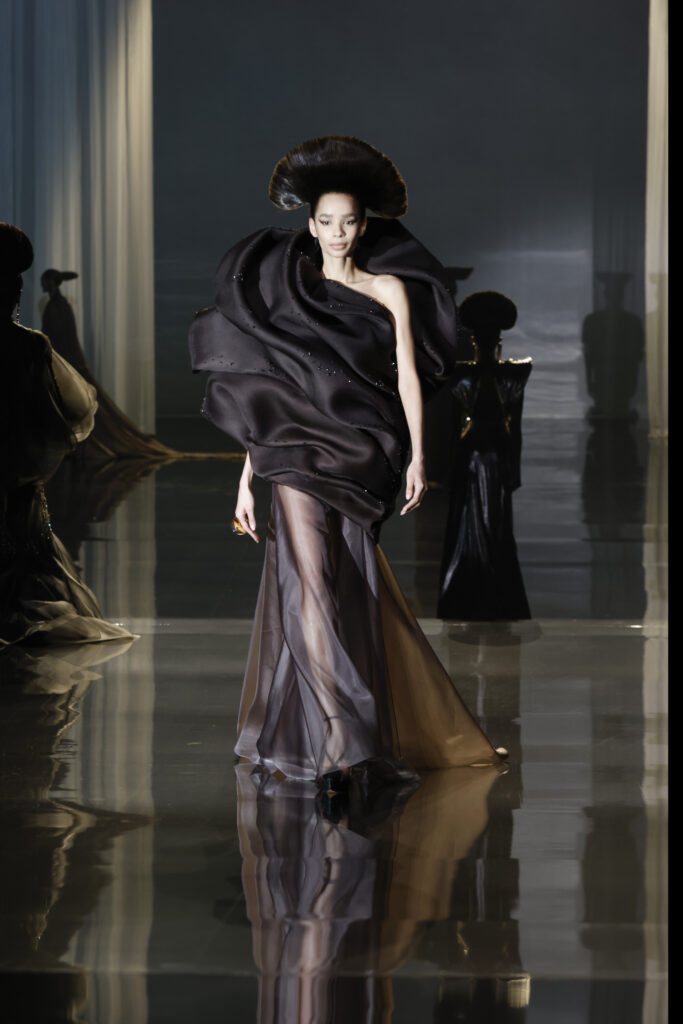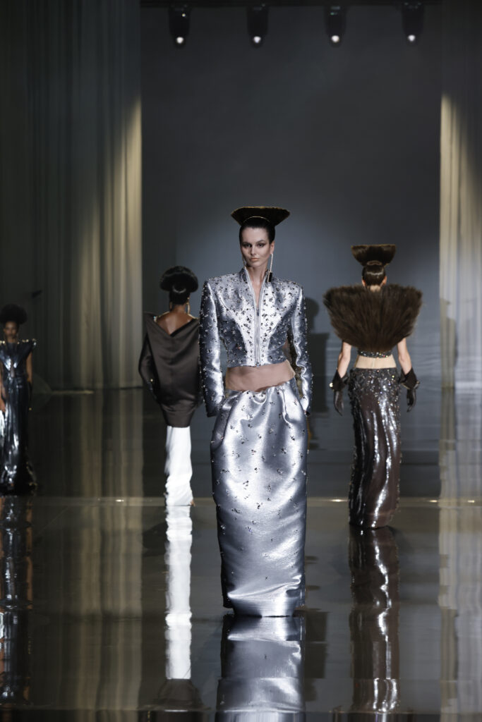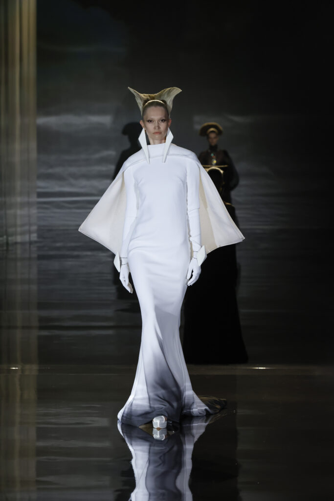 Rolland redéfinit le tailleur : smoking revisité en gazar noir, veste basculée en gabardine de soie ébène, tailleur spencer en gazar lamé argent brodé de morceaux de oud et de cristal. Chaque pièce dialogue avec le minimalisme organique du sculpteur, comme la robe cape en crêpe blanc brodée « Brancusi » en porcelaine.