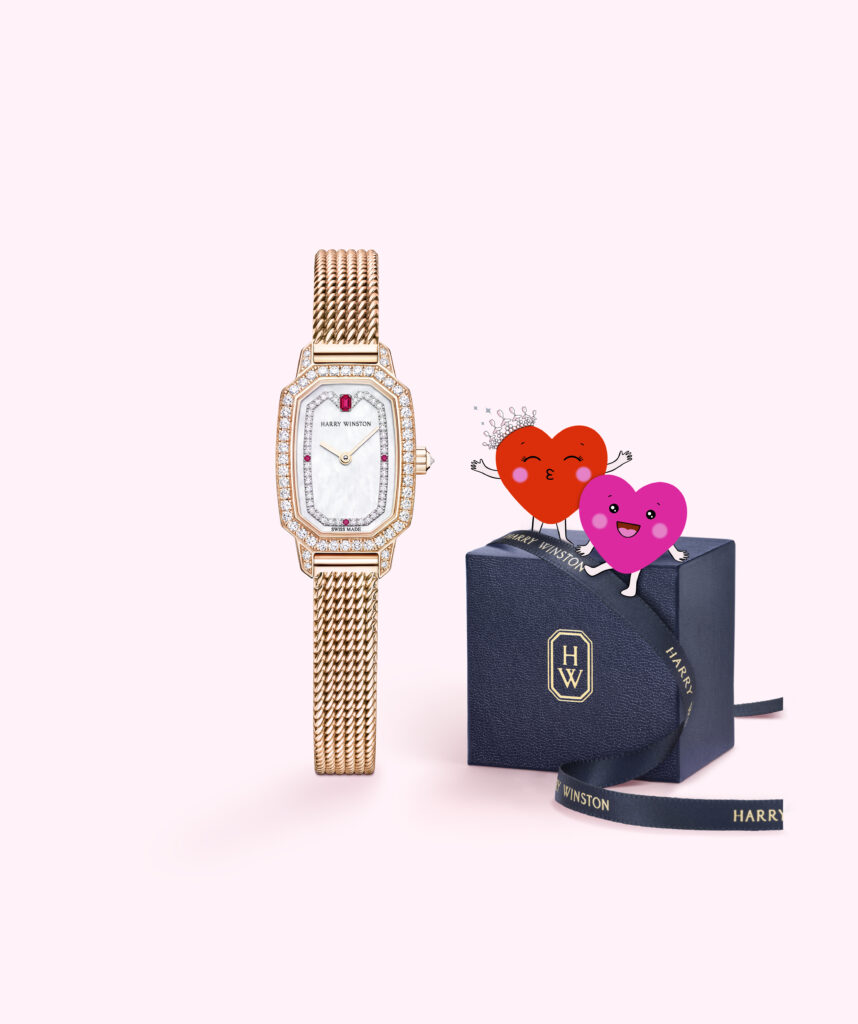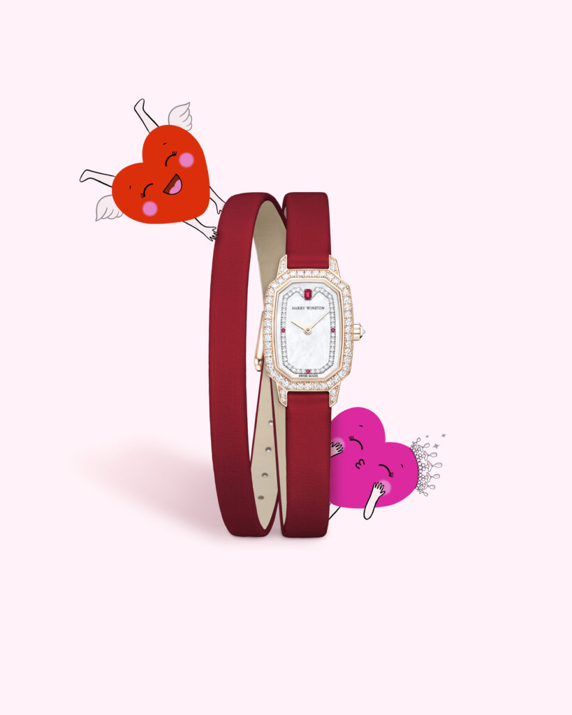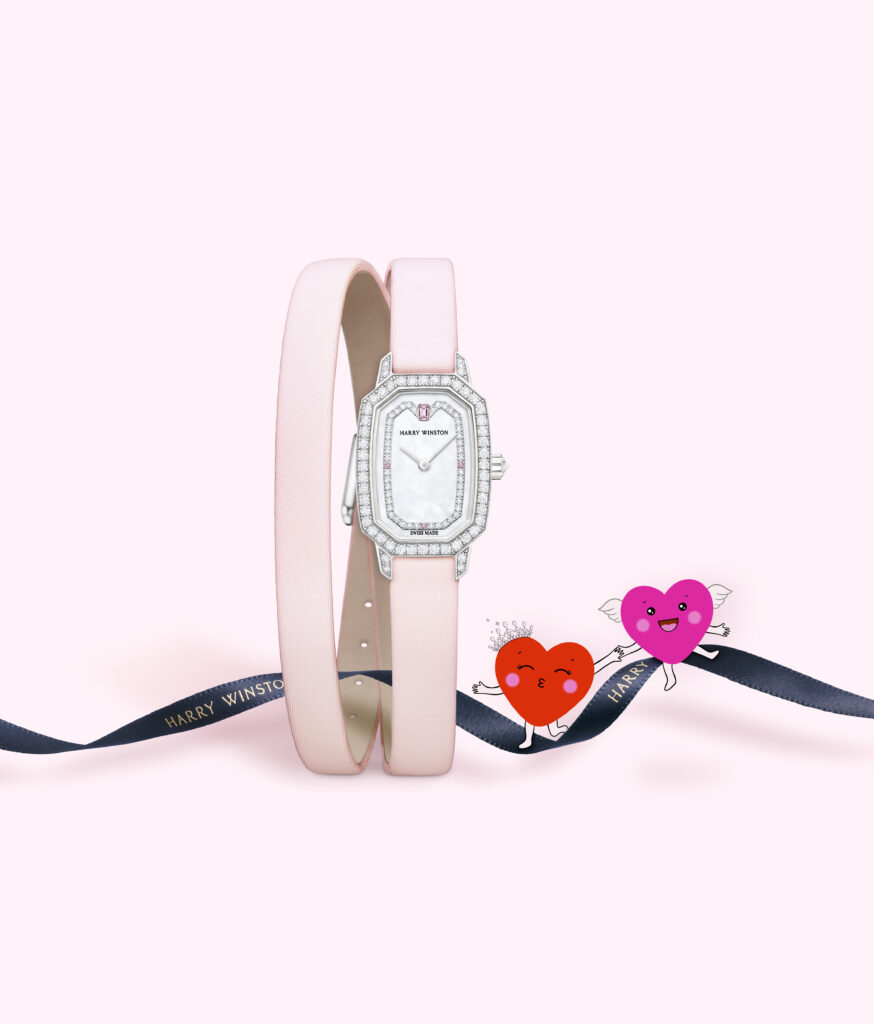 Le boîtier, inspiré des arches iconiques du salon Harry Winston de la Cinquième Avenue, est sublimé par 57 diamants taille brillant, reflétant l’héritage joaillier de la Maison. Animée par un mouvement mécanique automatique suisse de haute facture, elle offre une réserve de marche de 68 heures. Montée sur un bracelet en cuir d’alligator blanc, elle est livrée dans un écrin exclusif, immaculé et orné de cœurs rouges.