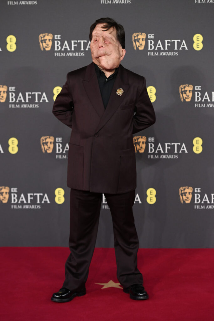 - Adam Pearson a surpris dans un costume bordeaux aux revers en pointe, assorti d’une chemise noire et d’une broche en laiton doré, insufflant une touche d’originalité dans cette mer de smokings sombres. Ses loafers en cuir noir complétaient cette silhouette sophistiquée avec une pointe de décontraction assumée.