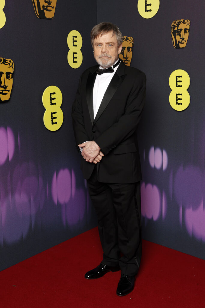 - Mark Hamill, fidèle à son style sobre et chic, a quant à lui choisi un smoking noir en laine et soie, accompagné d’une chemise à col cassé blanche et d’un nœud papillon noir, une silhouette qui traverse les époques avec distinction.