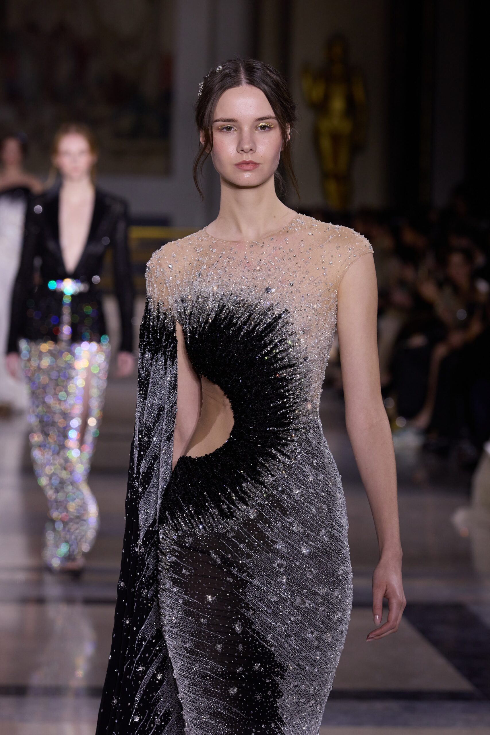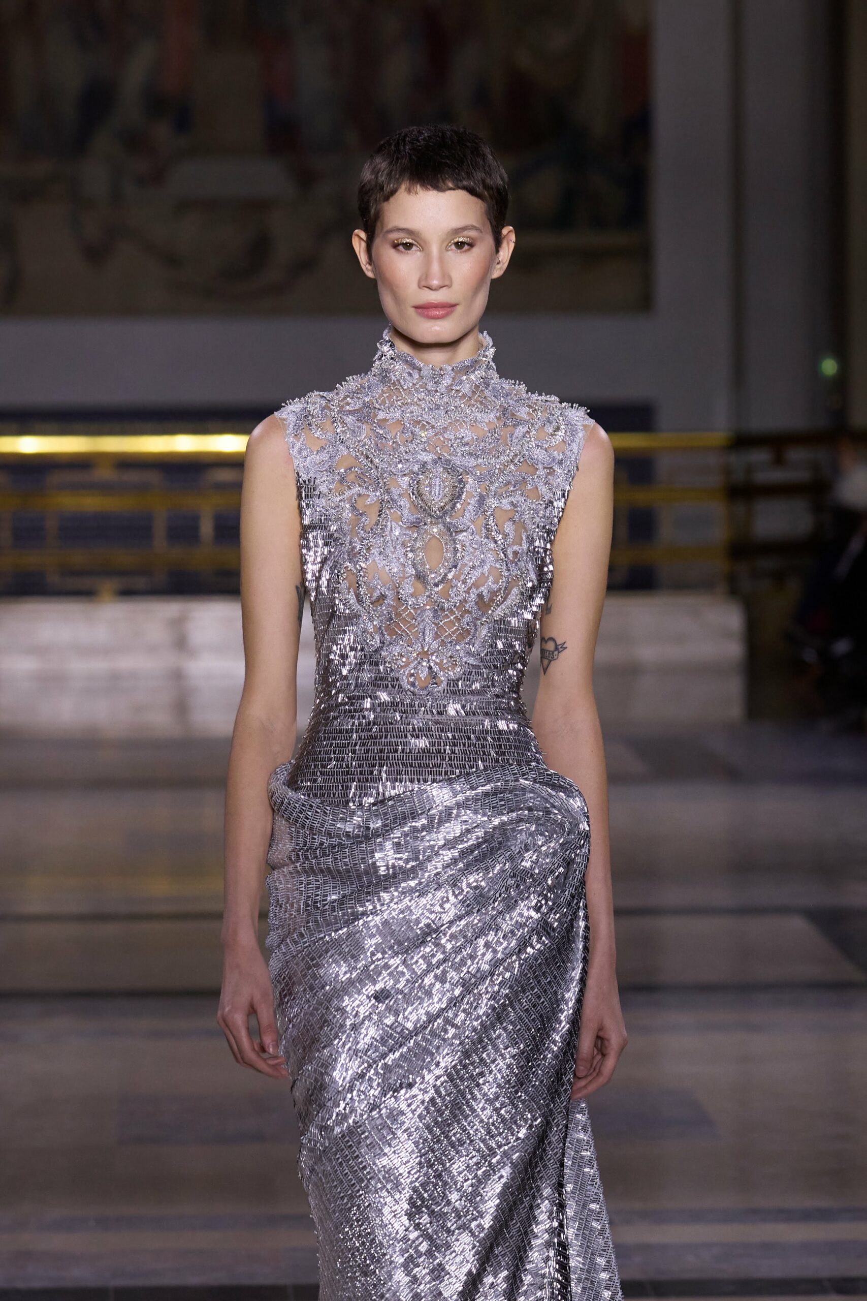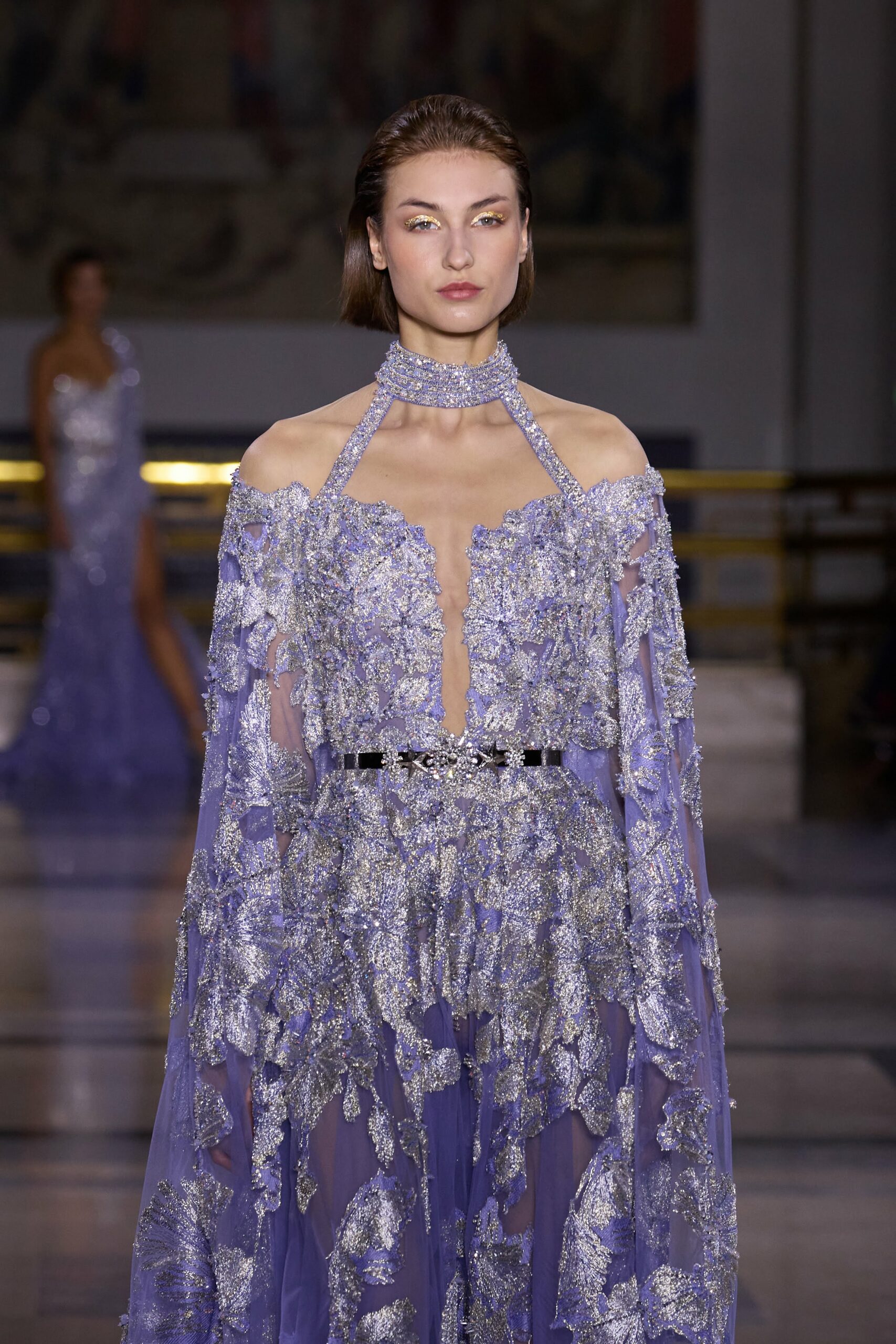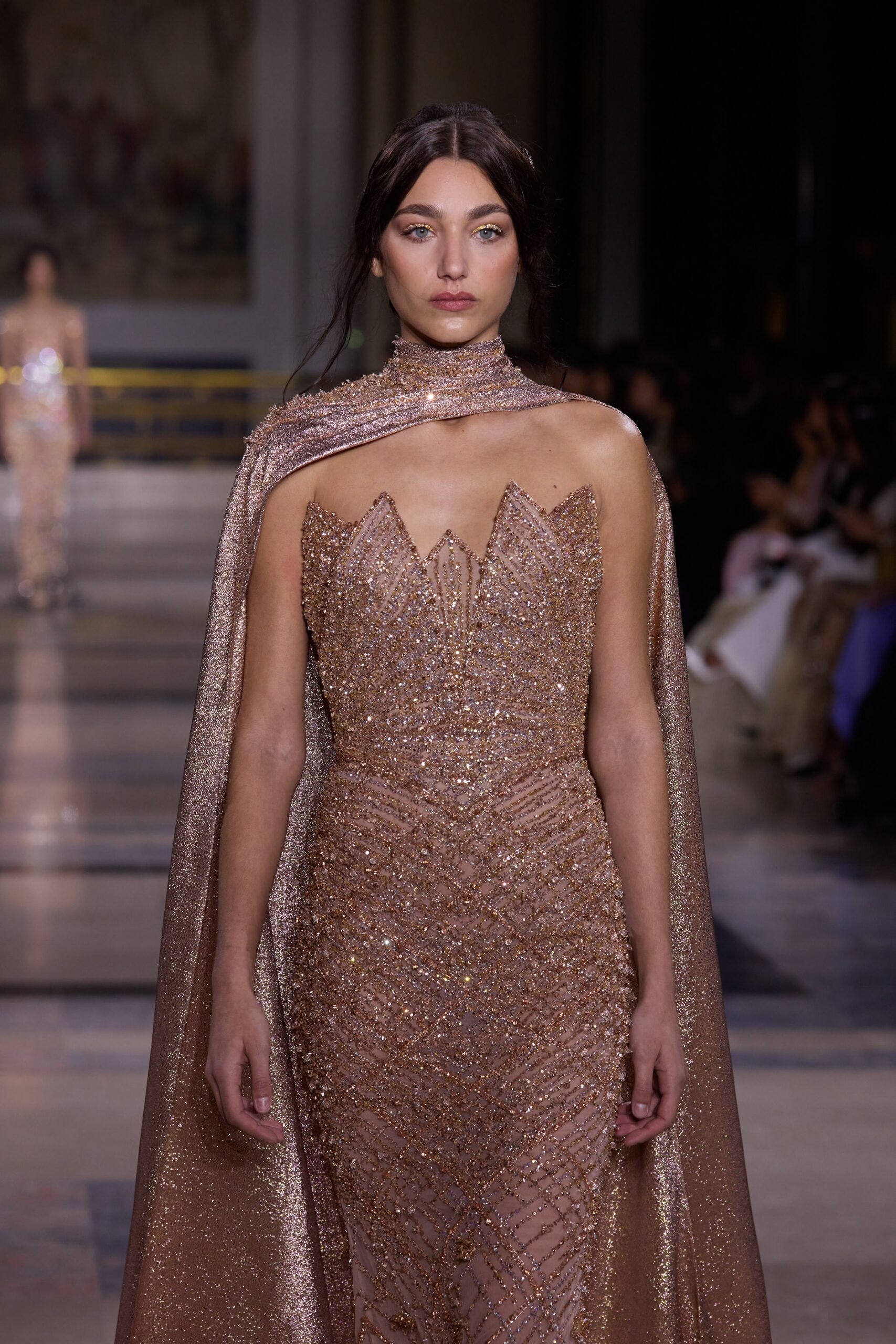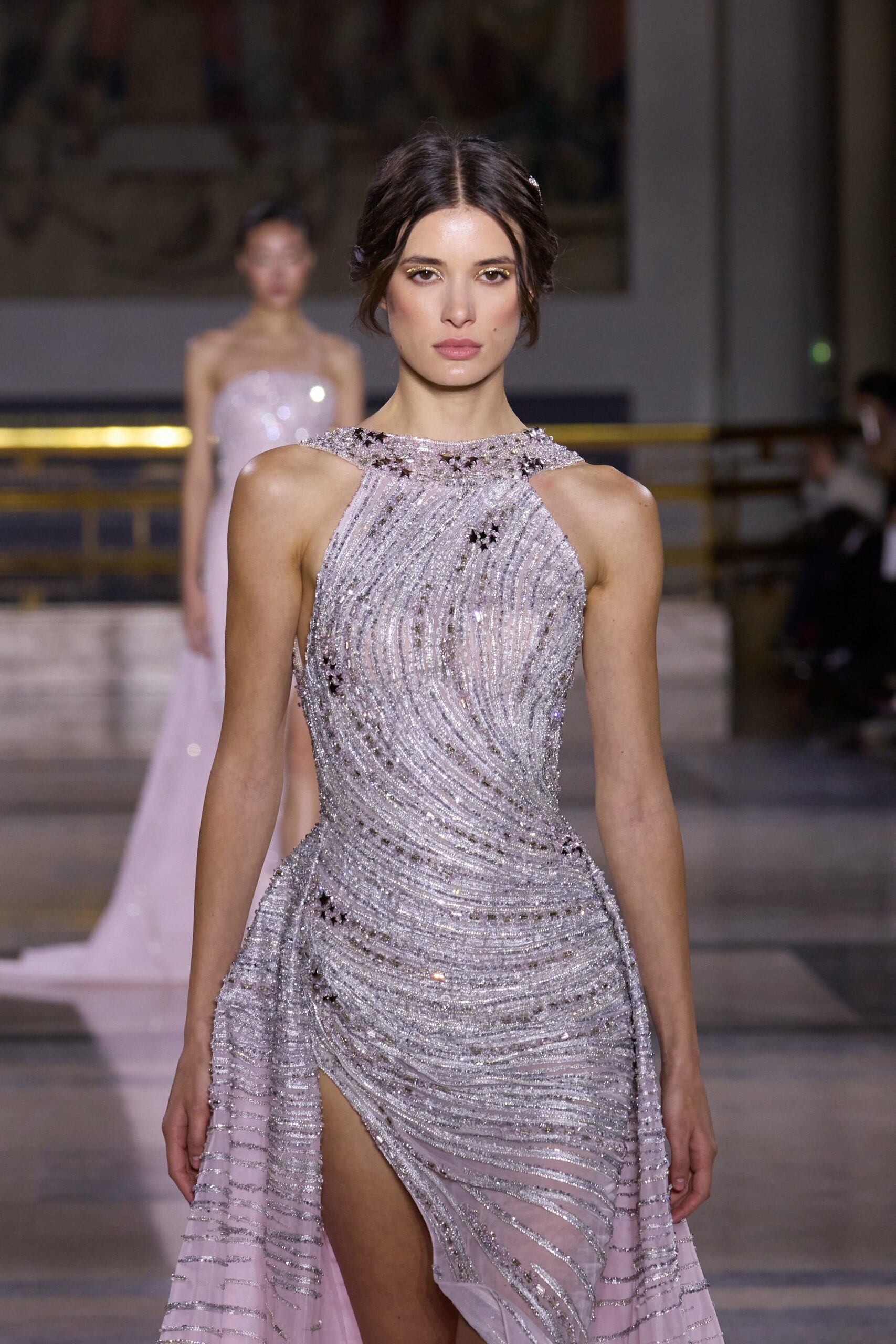 Les couleurs puisent leur inspiration dans les nuances du crépuscule. Des tonalités argentées, vertes, roses et bleues se mêlent aux reflets métalliques, capturant le jeu subtil de l’ombre et de la lumière. La silhouette s’affirme, structurée et flatteuse, oscillant entre majesté et sensualité.