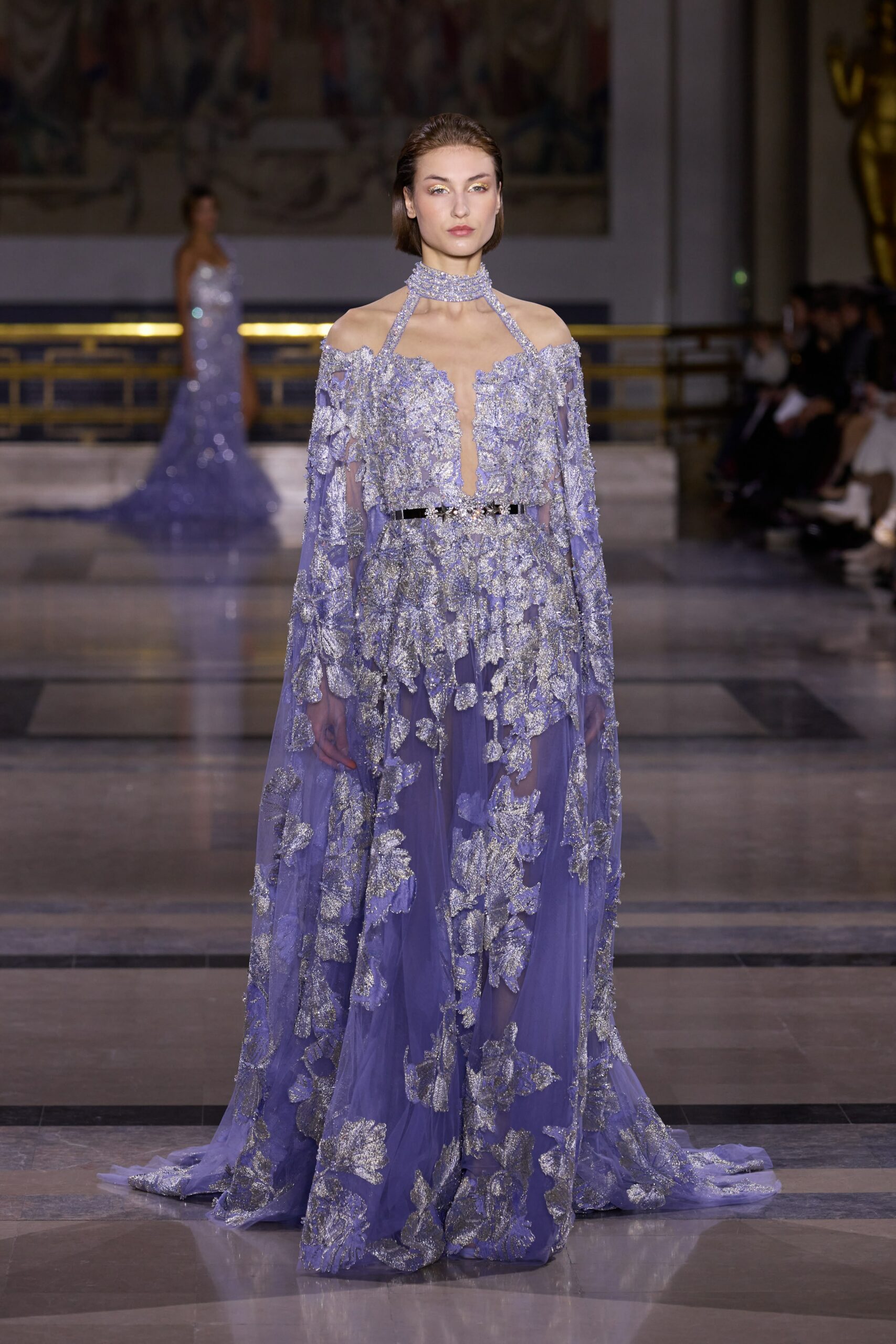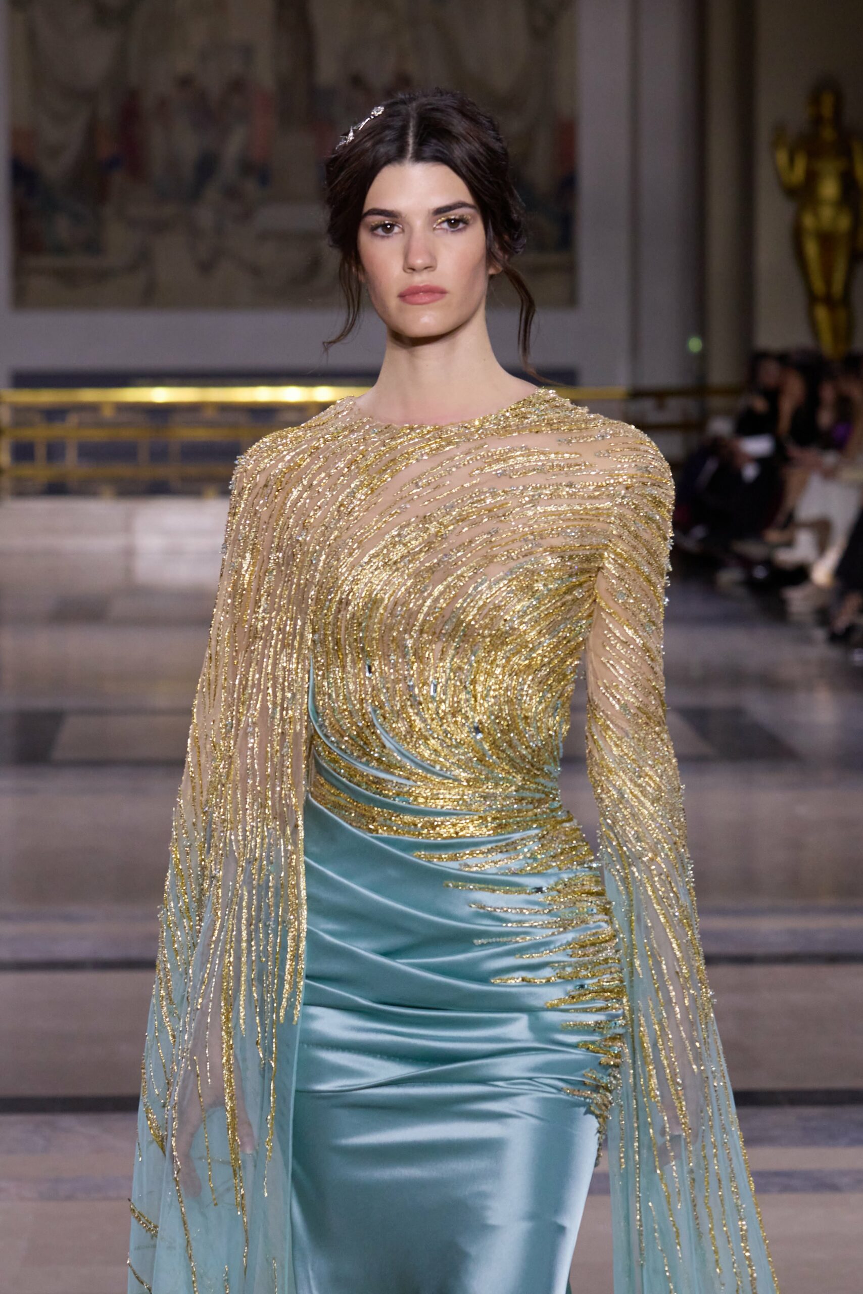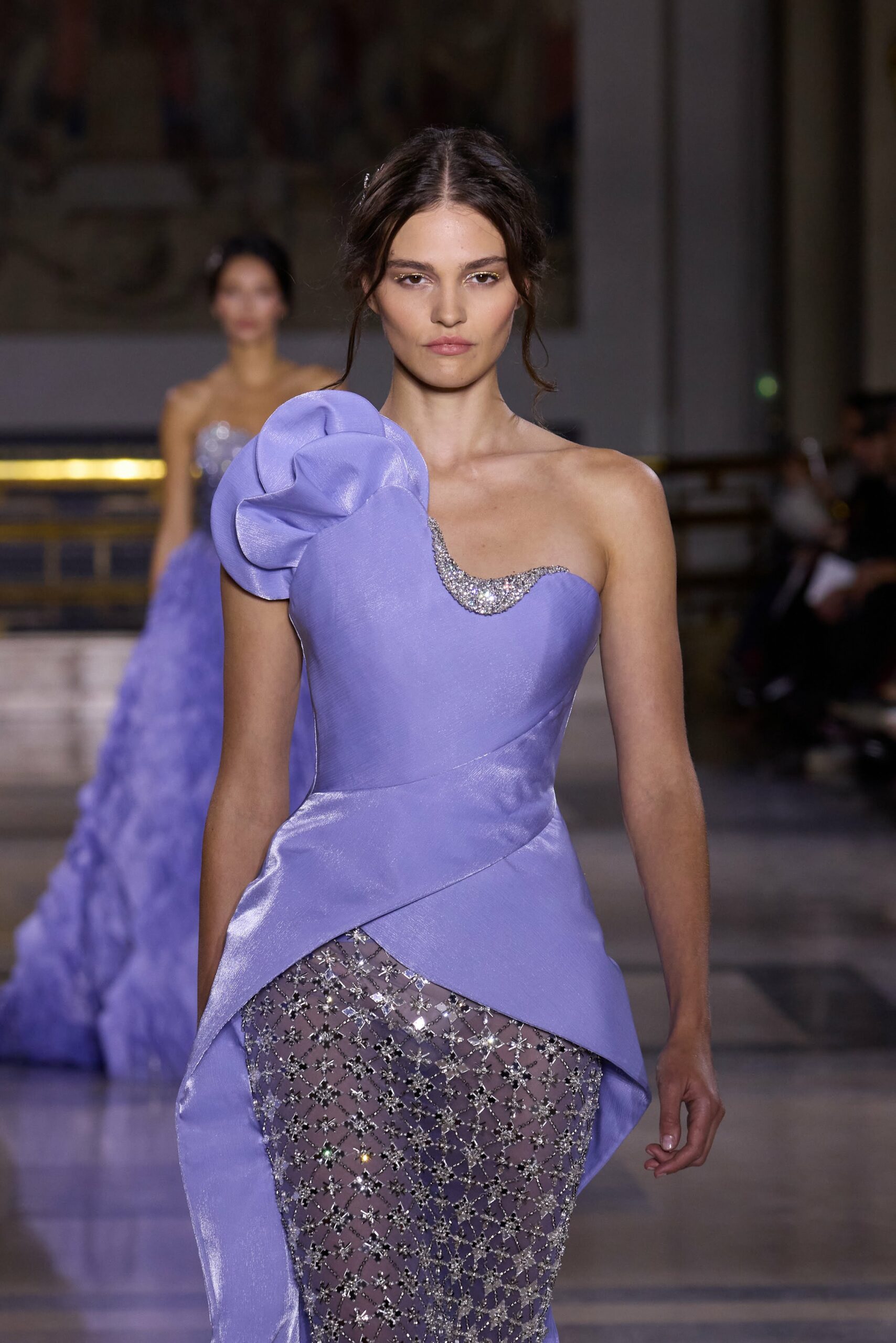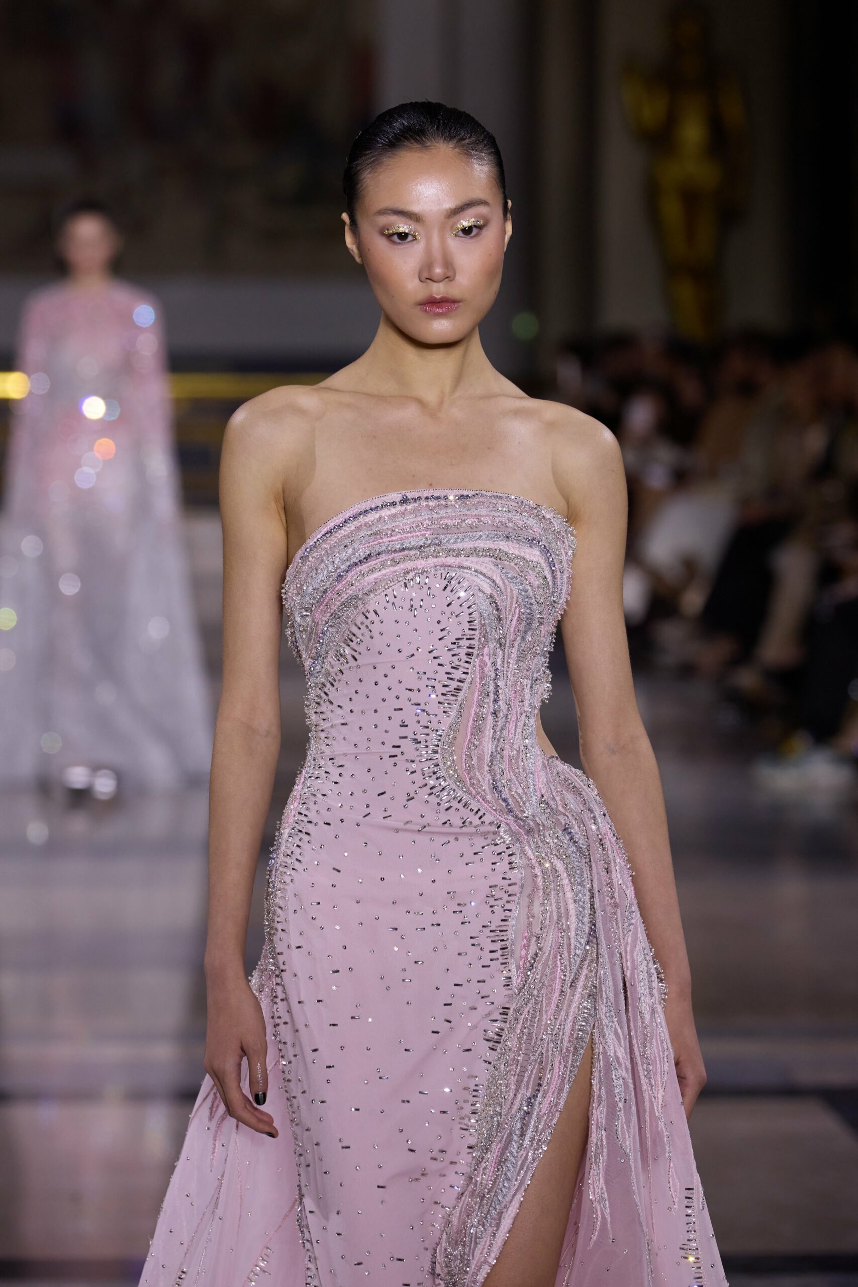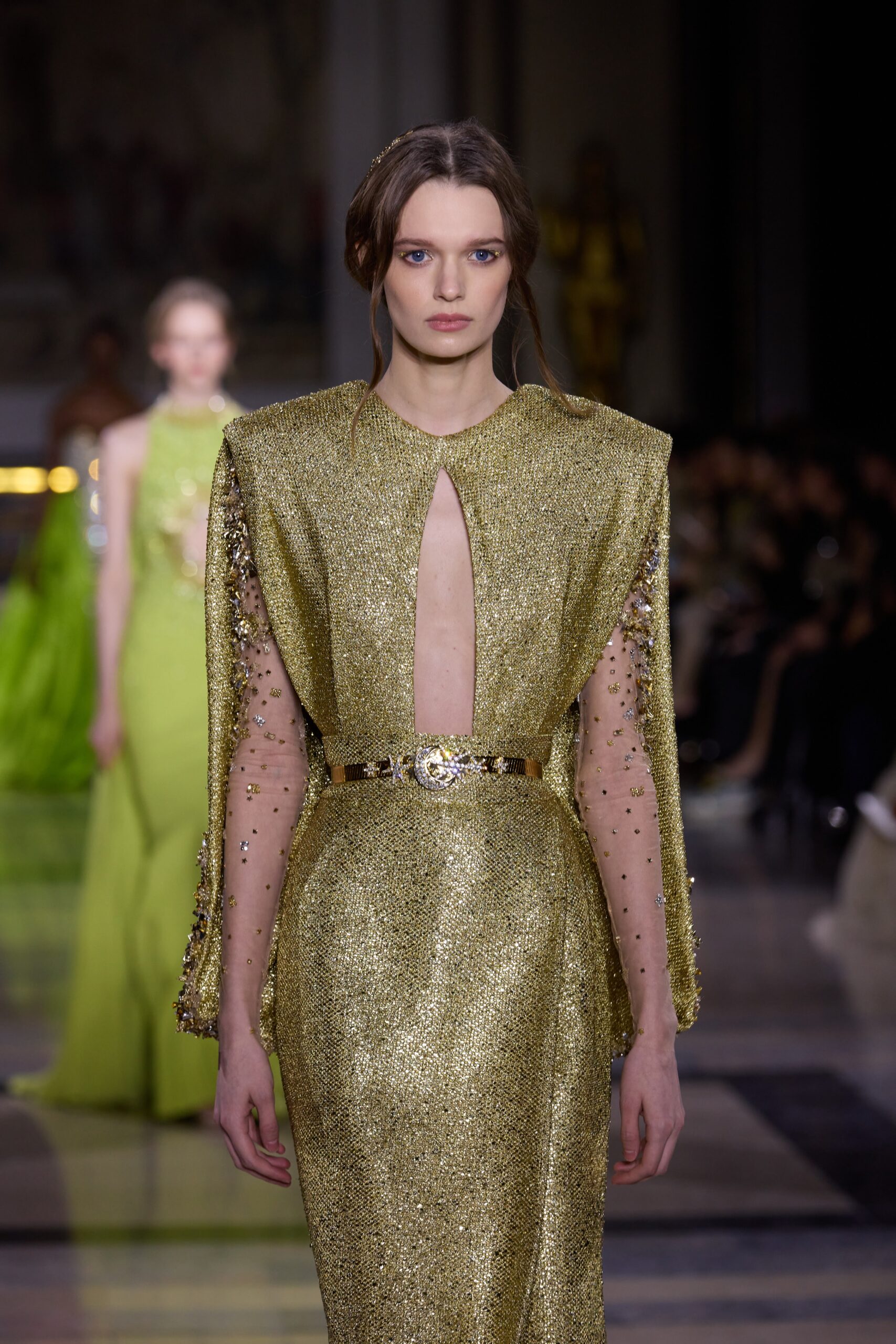 Les couleurs puisent leur inspiration dans les nuances du crépuscule. Des tonalités argentées, vertes, roses et bleues se mêlent aux reflets métalliques, capturant le jeu subtil de l’ombre et de la lumière. La silhouette s’affirme, structurée et flatteuse, oscillant entre majesté et sensualité.