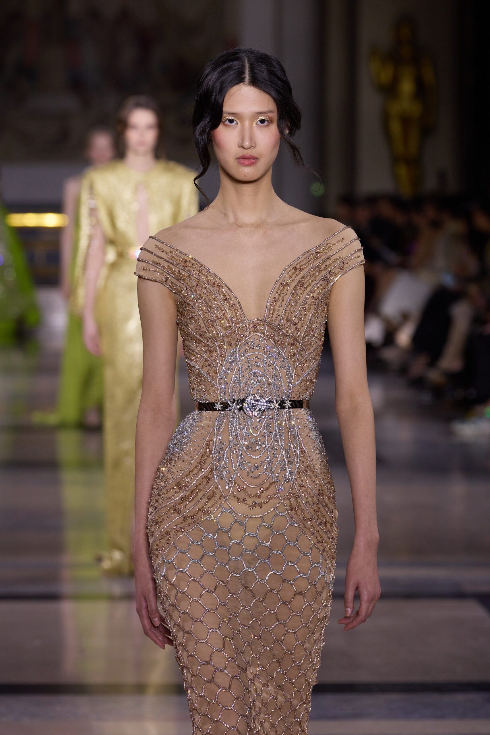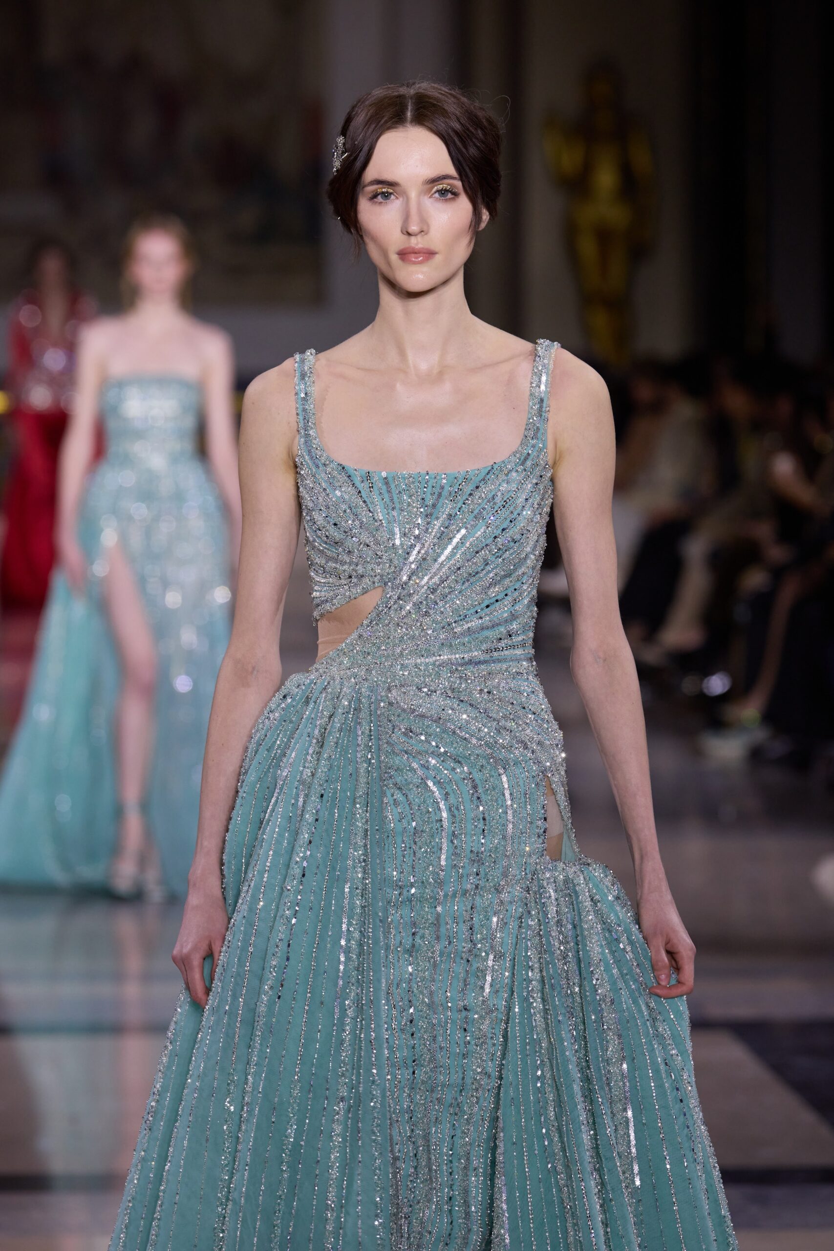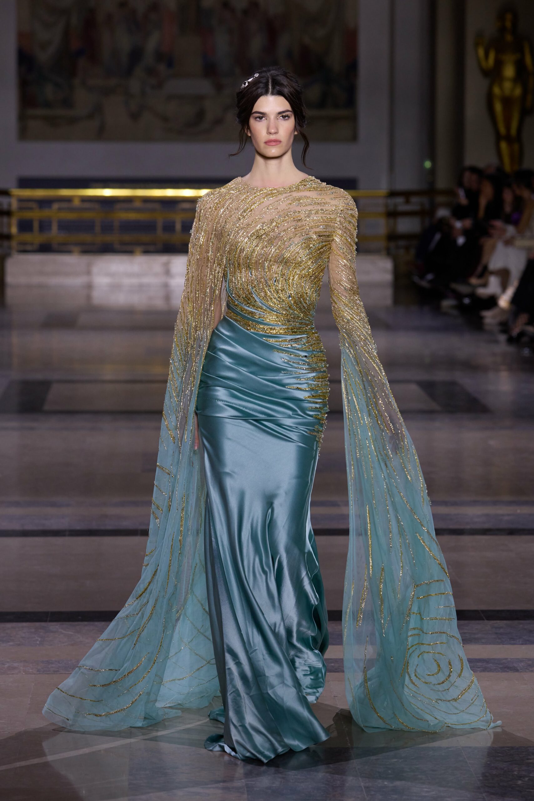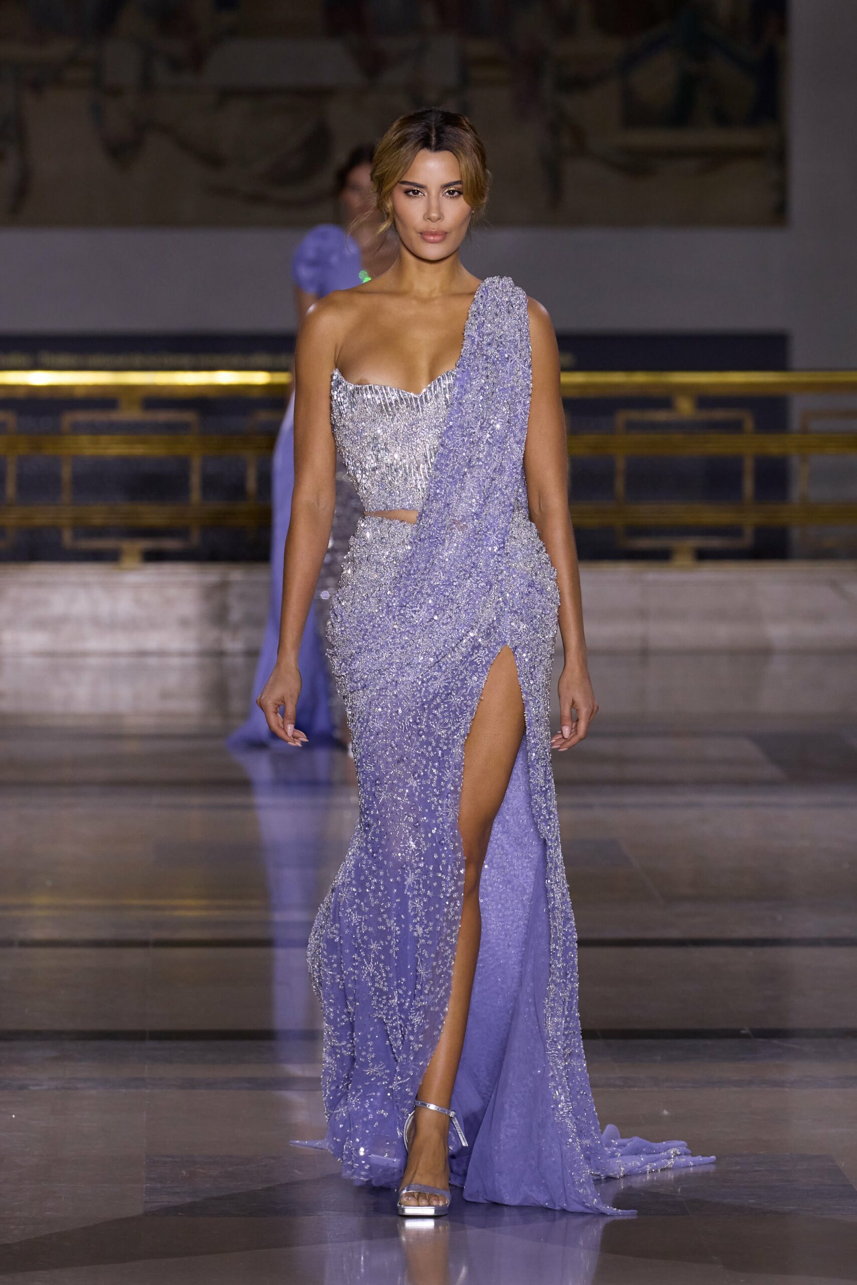 Les couleurs puisent leur inspiration dans les nuances du crépuscule. Des tonalités argentées, vertes, roses et bleues se mêlent aux reflets métalliques, capturant le jeu subtil de l’ombre et de la lumière. La silhouette s’affirme, structurée et flatteuse, oscillant entre majesté et sensualité.