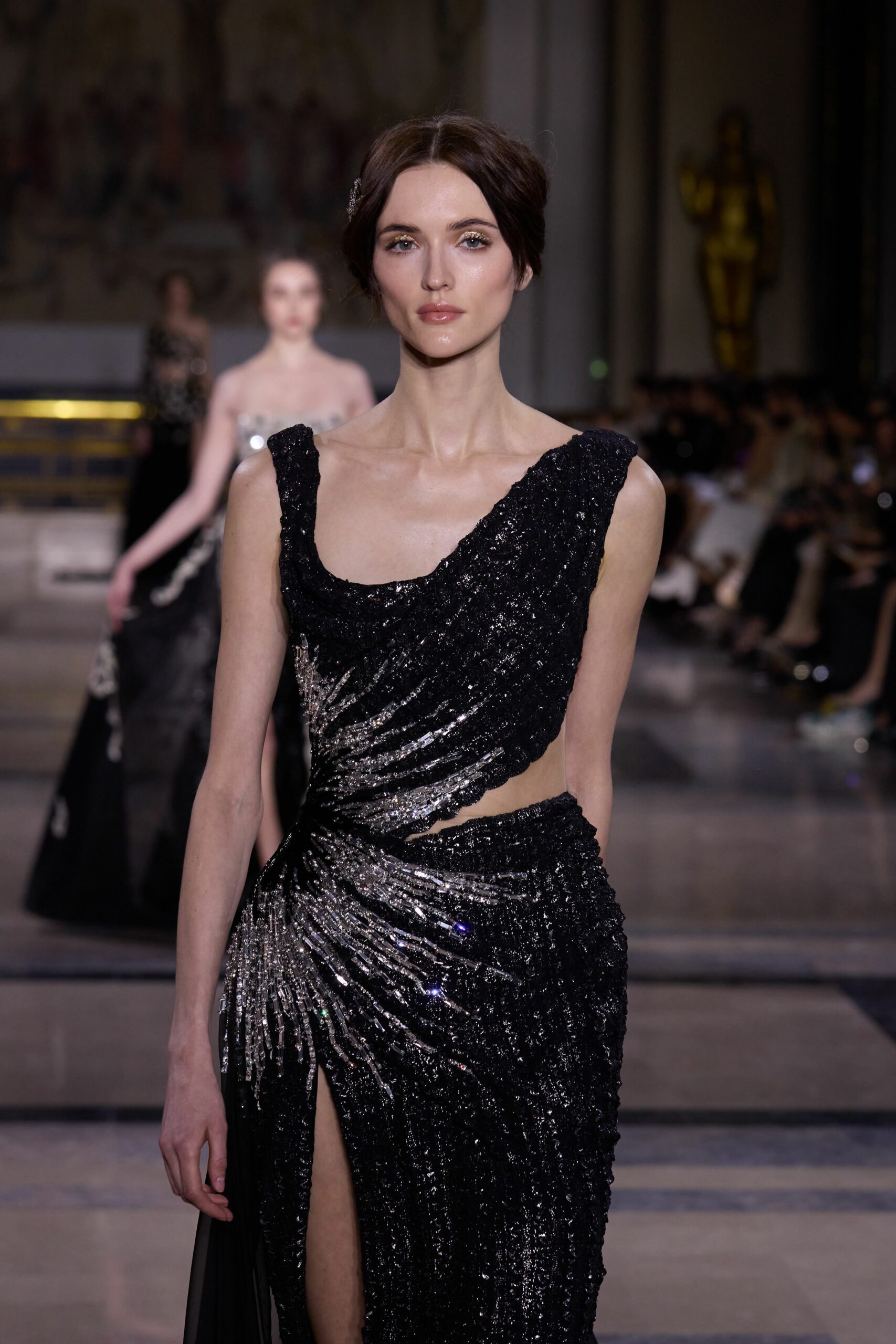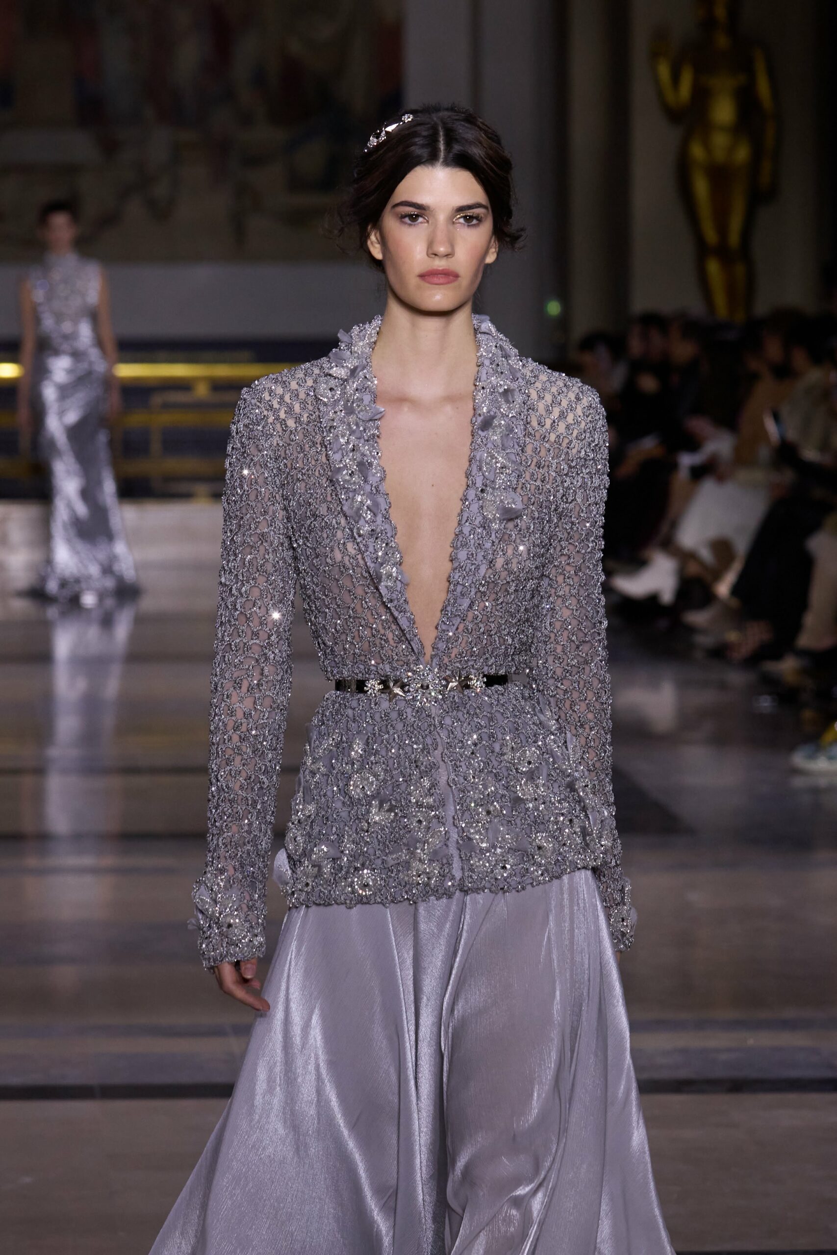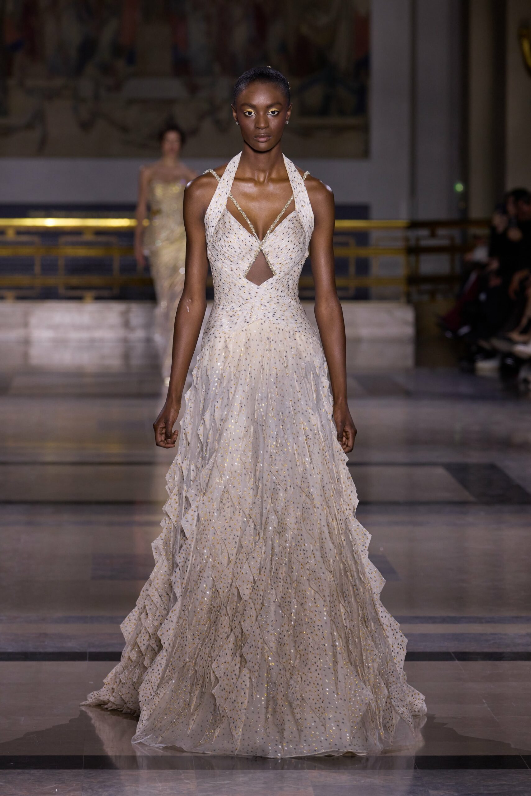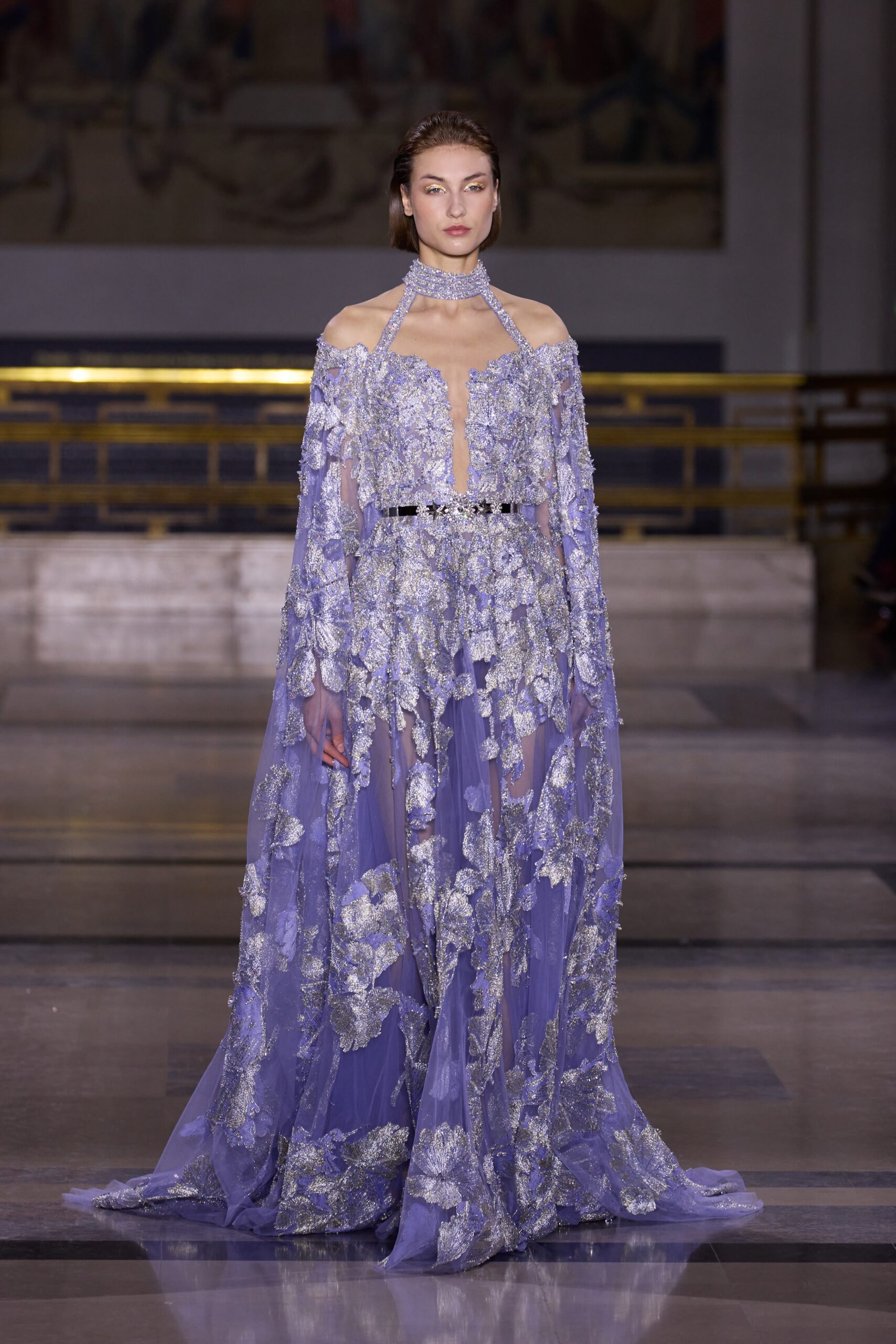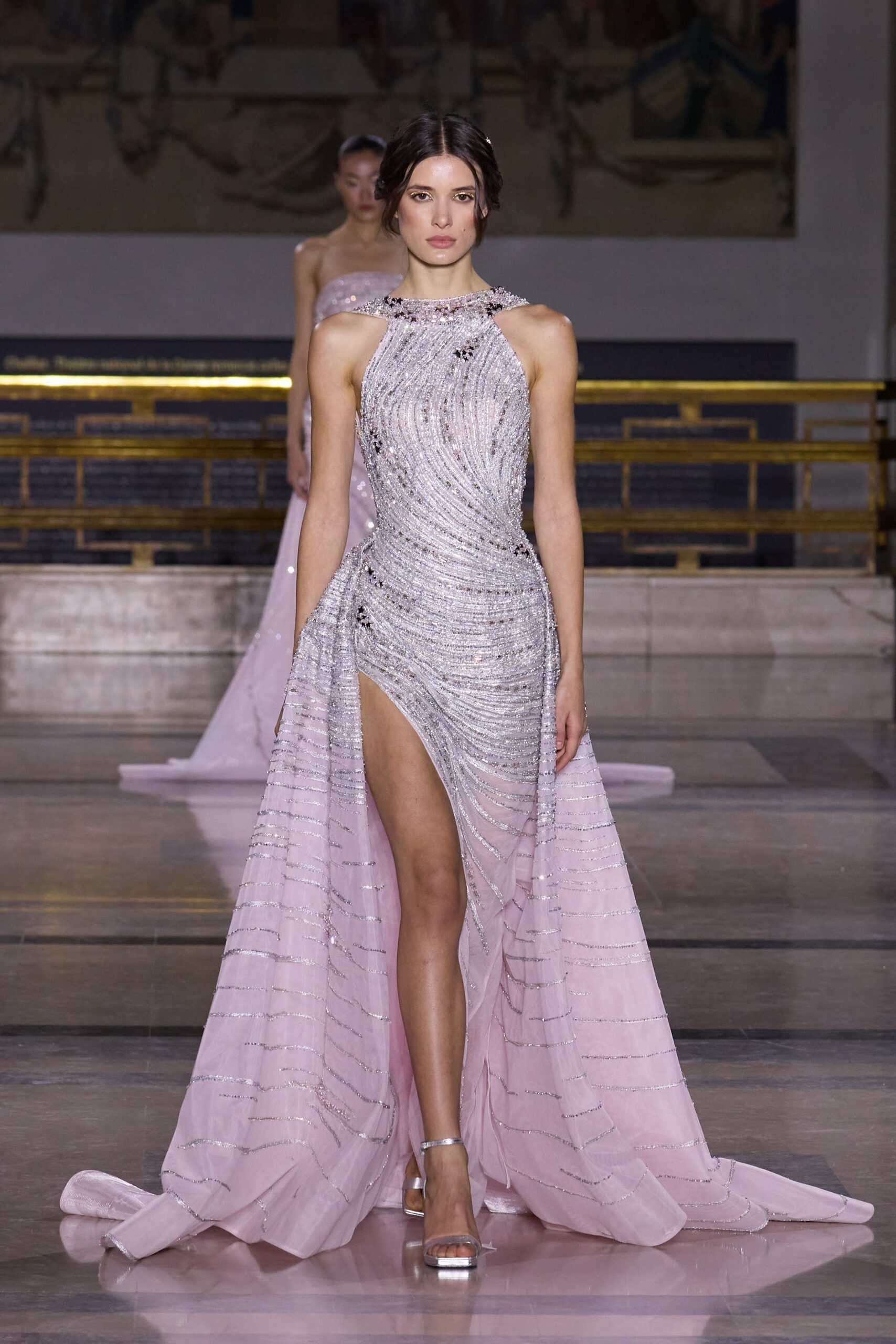 Les couleurs puisent leur inspiration dans les nuances du crépuscule. Des tonalités argentées, vertes, roses et bleues se mêlent aux reflets métalliques, capturant le jeu subtil de l’ombre et de la lumière. La silhouette s’affirme, structurée et flatteuse, oscillant entre majesté et sensualité.