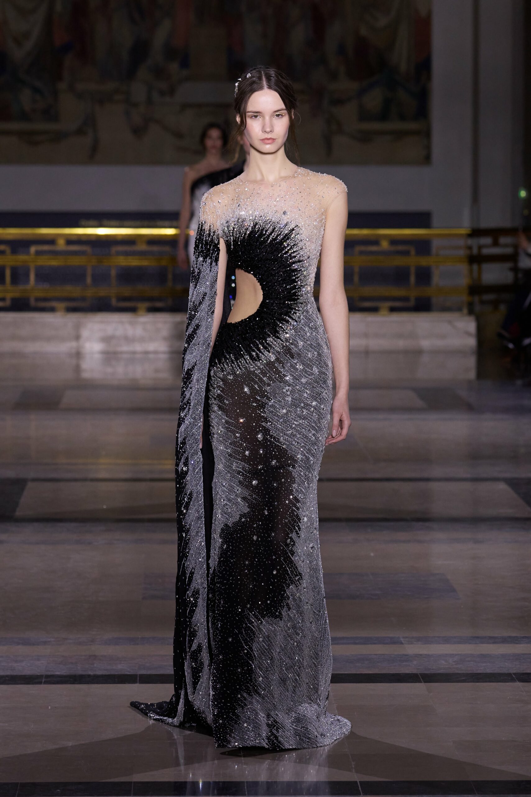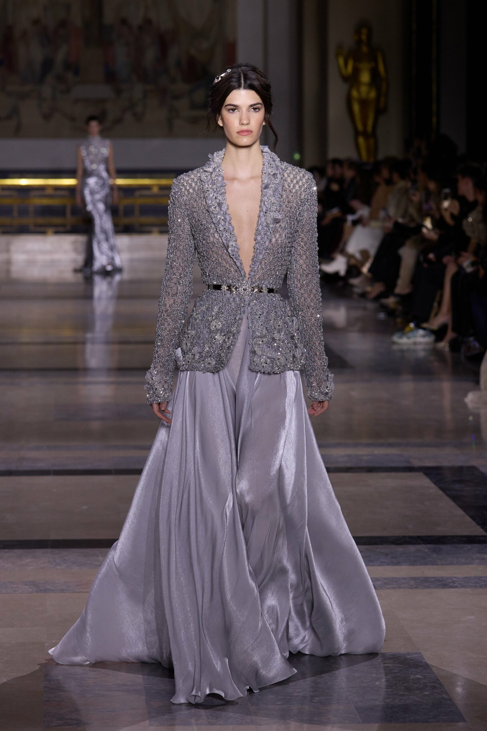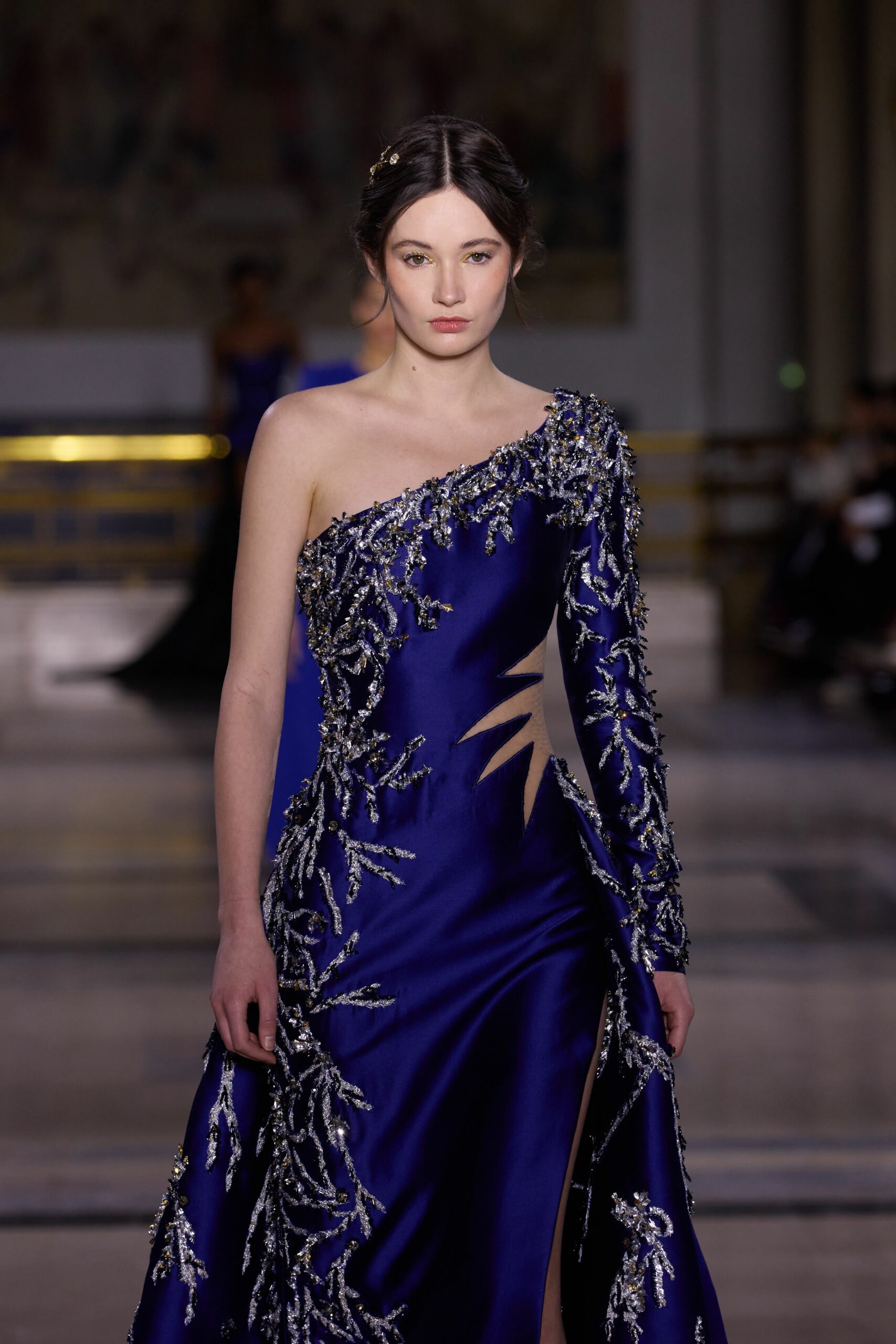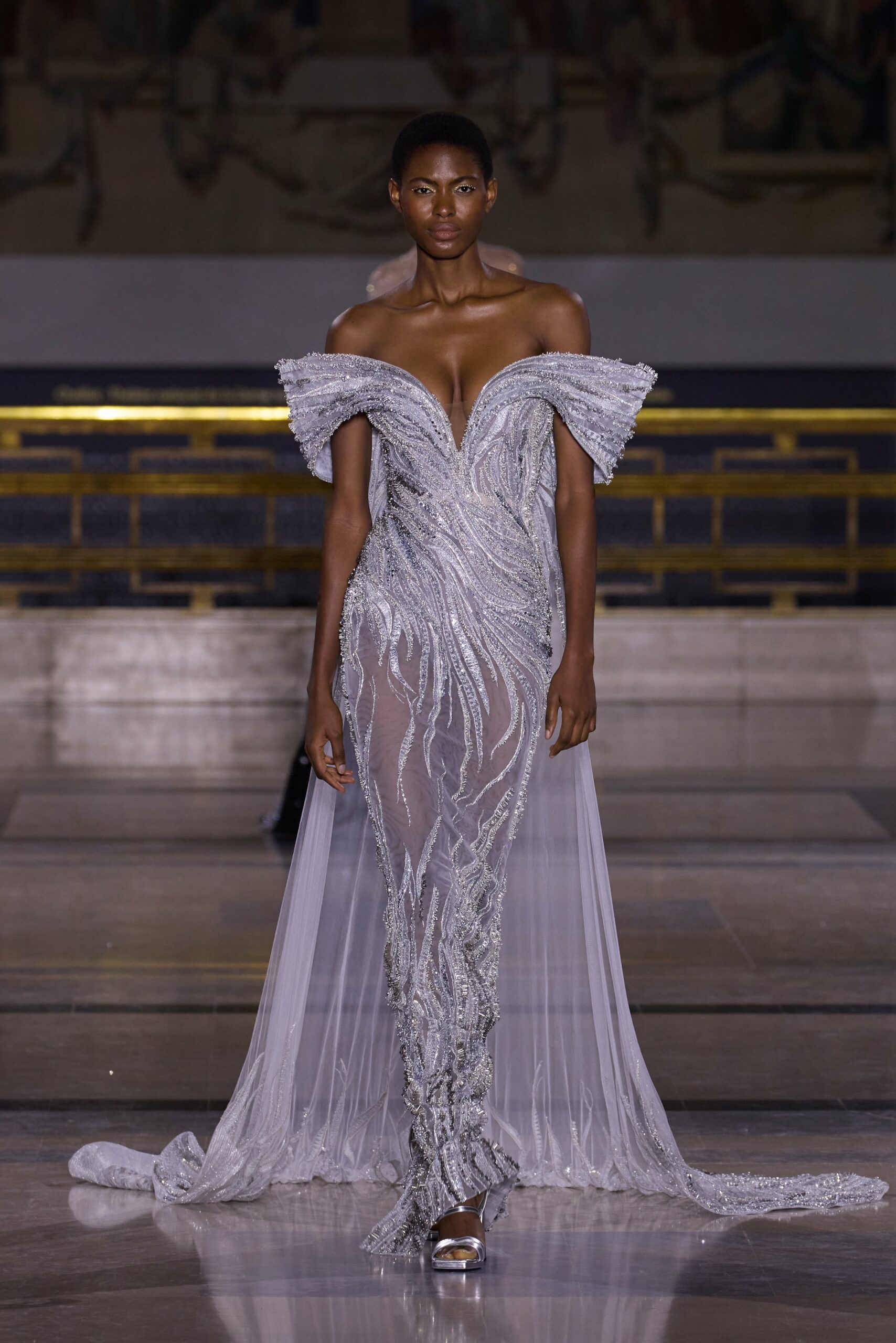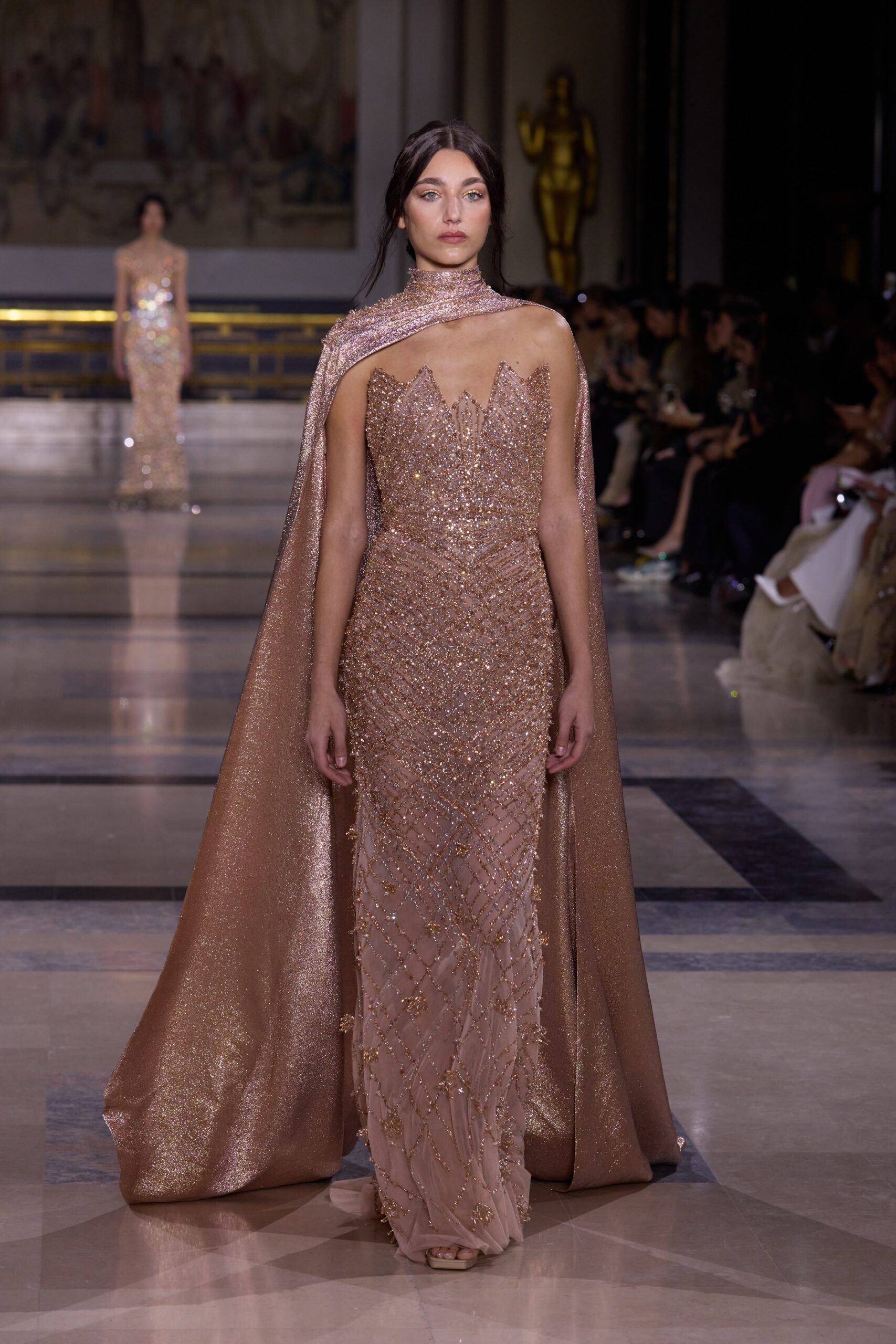 Les couleurs puisent leur inspiration dans les nuances du crépuscule. Des tonalités argentées, vertes, roses et bleues se mêlent aux reflets métalliques, capturant le jeu subtil de l’ombre et de la lumière. La silhouette s’affirme, structurée et flatteuse, oscillant entre majesté et sensualité.