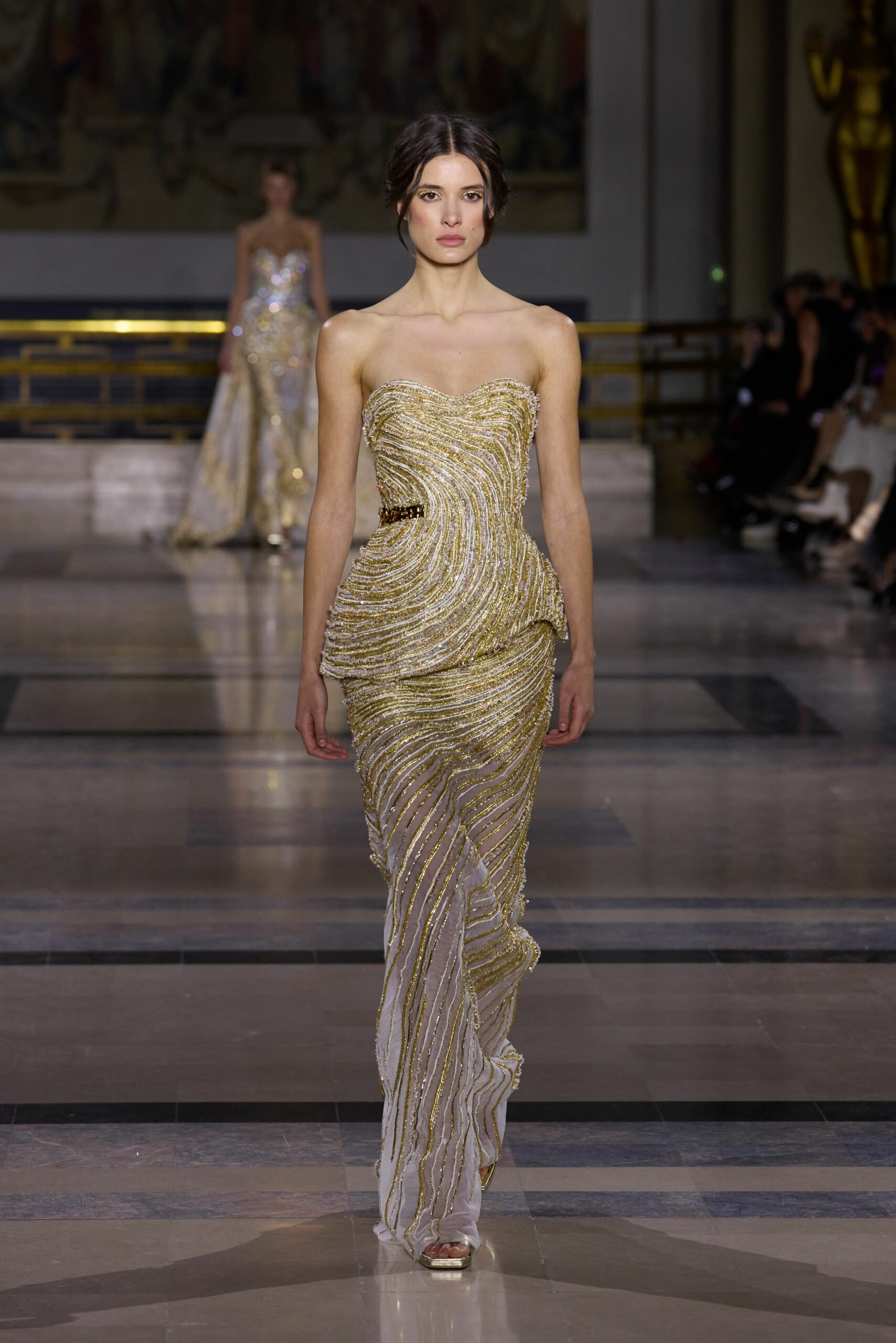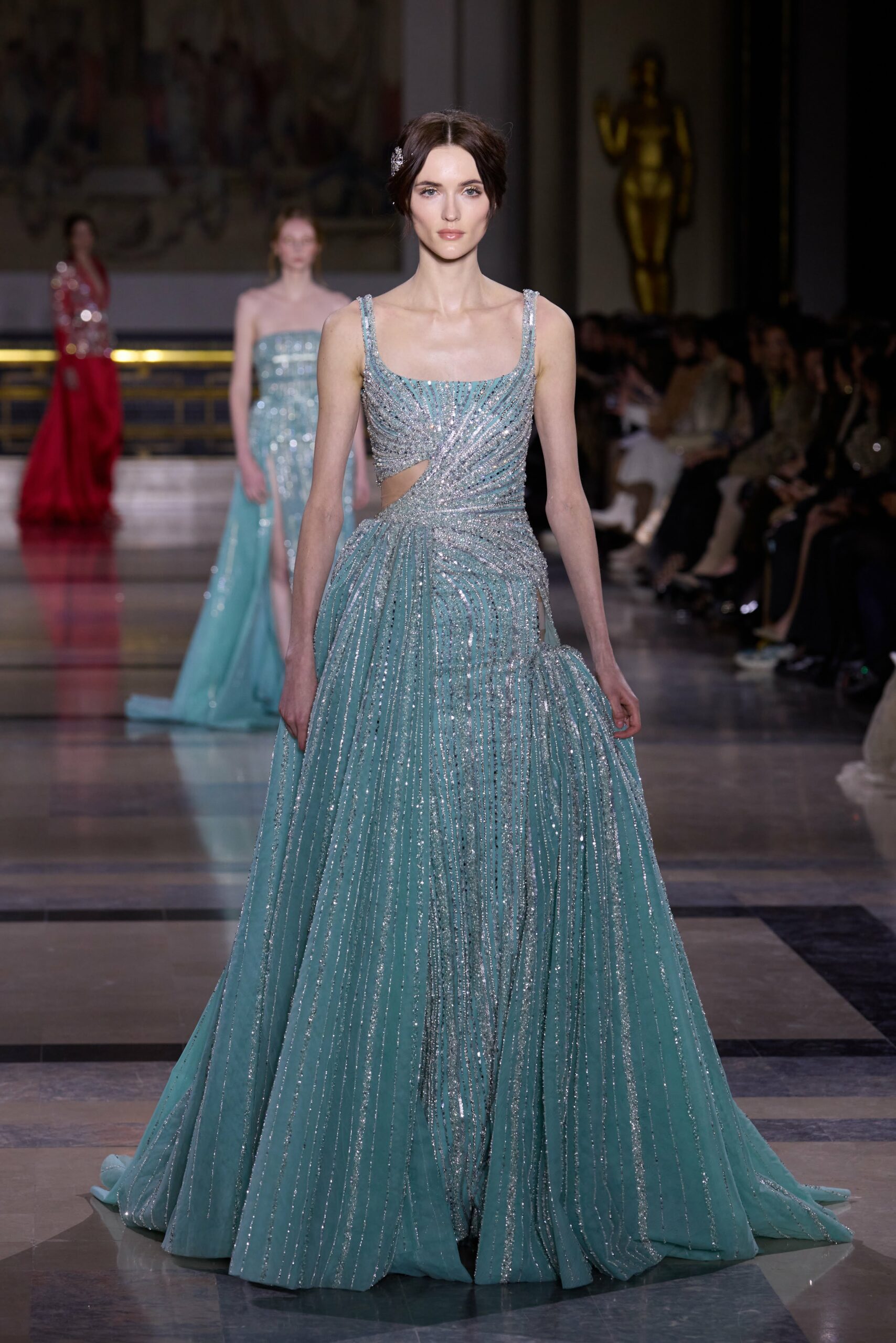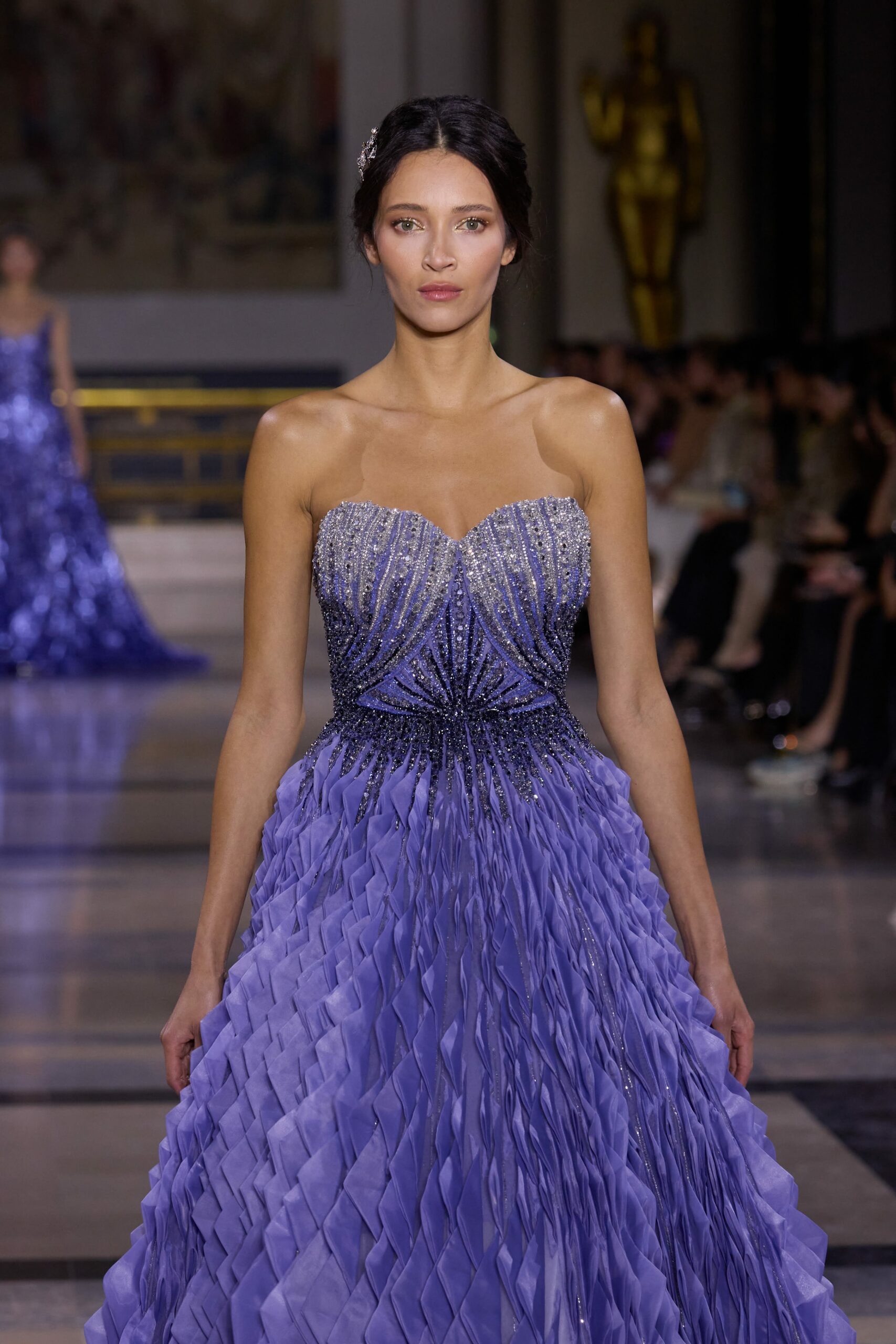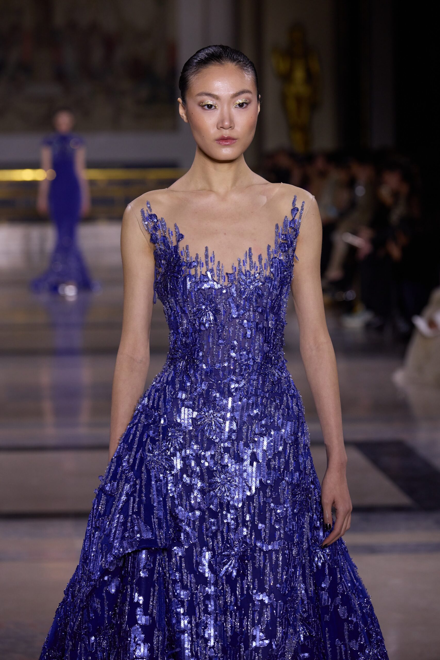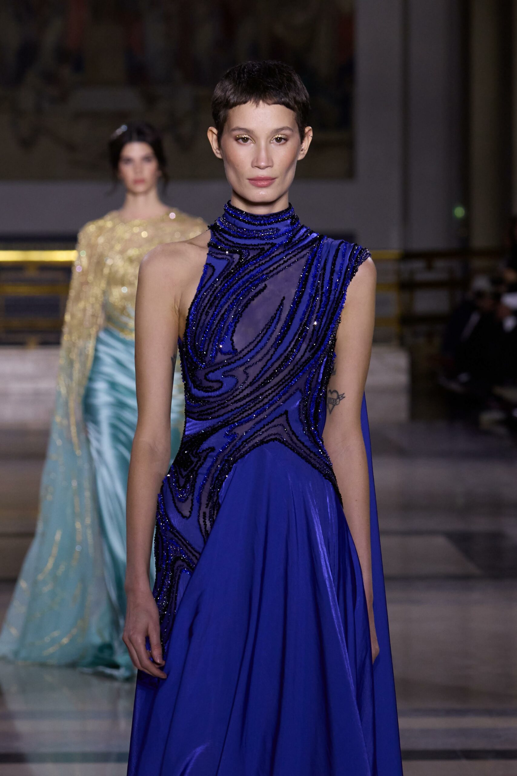 Les couleurs puisent leur inspiration dans les nuances du crépuscule. Des tonalités argentées, vertes, roses et bleues se mêlent aux reflets métalliques, capturant le jeu subtil de l’ombre et de la lumière. La silhouette s’affirme, structurée et flatteuse, oscillant entre majesté et sensualité.