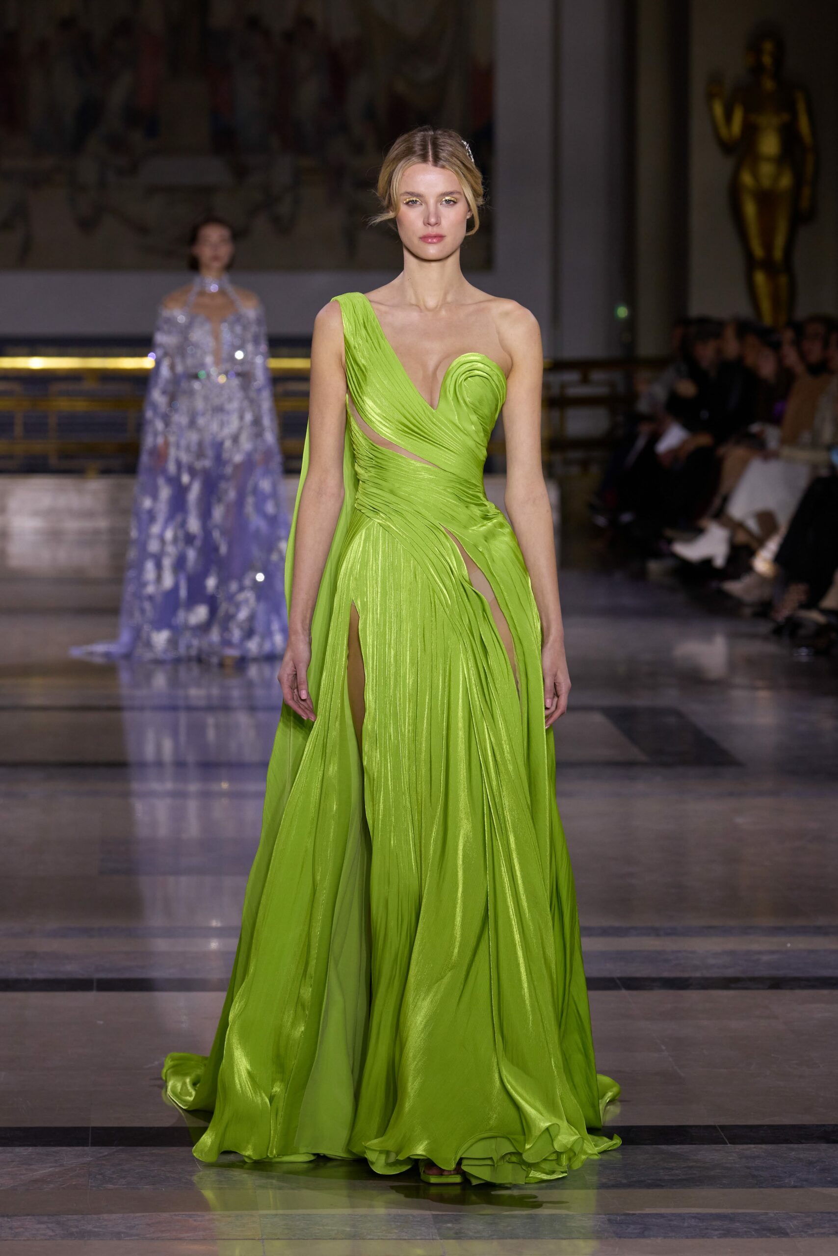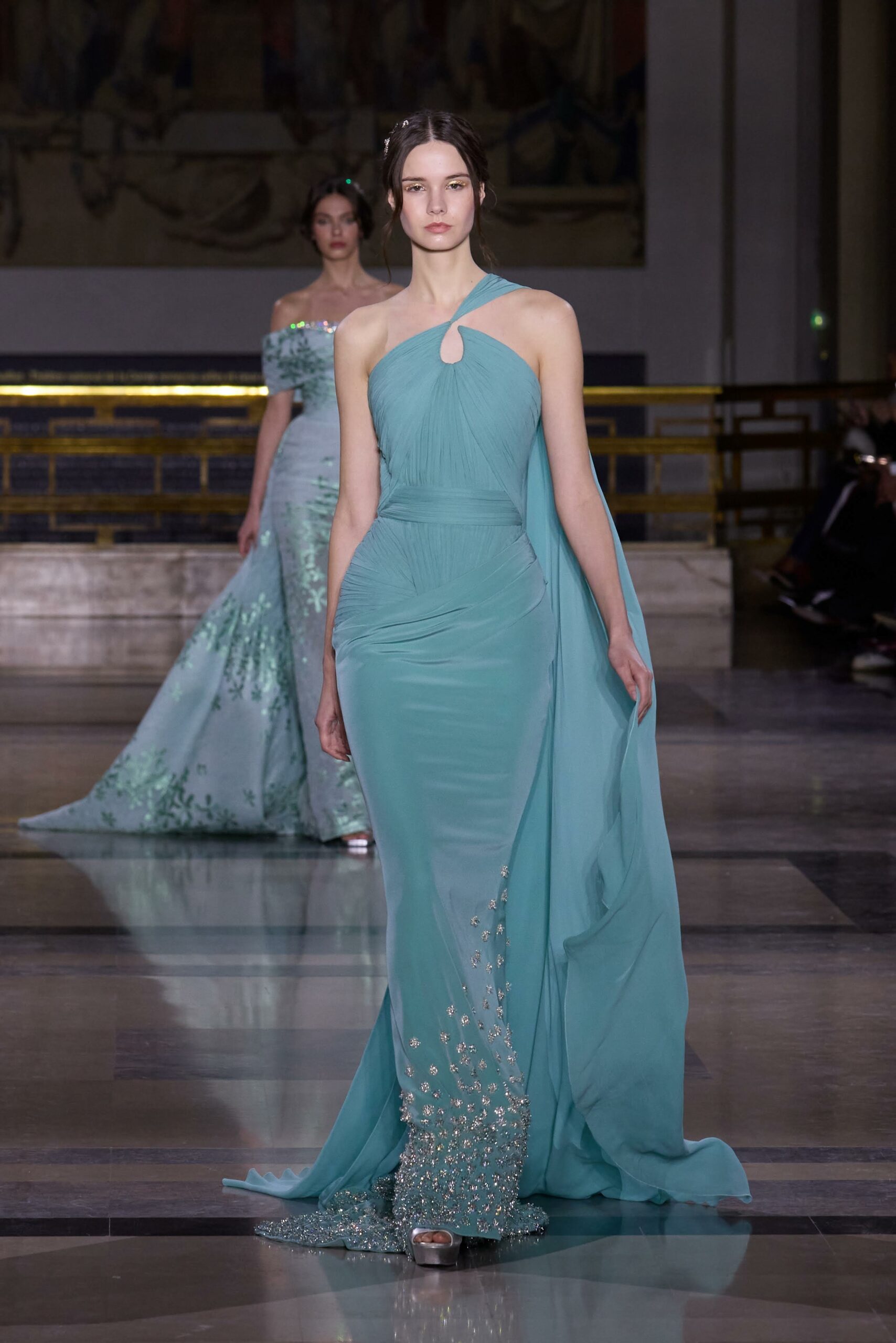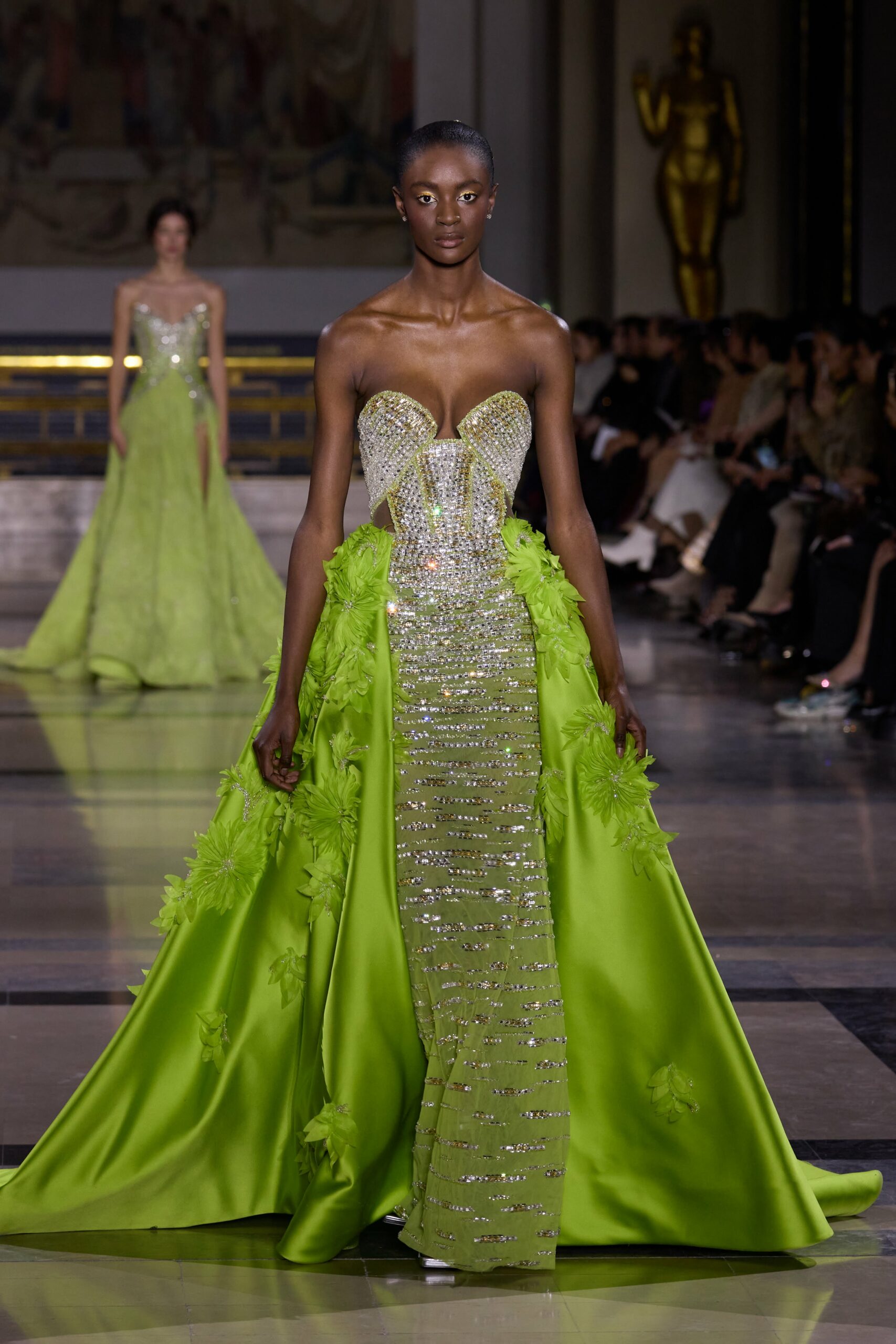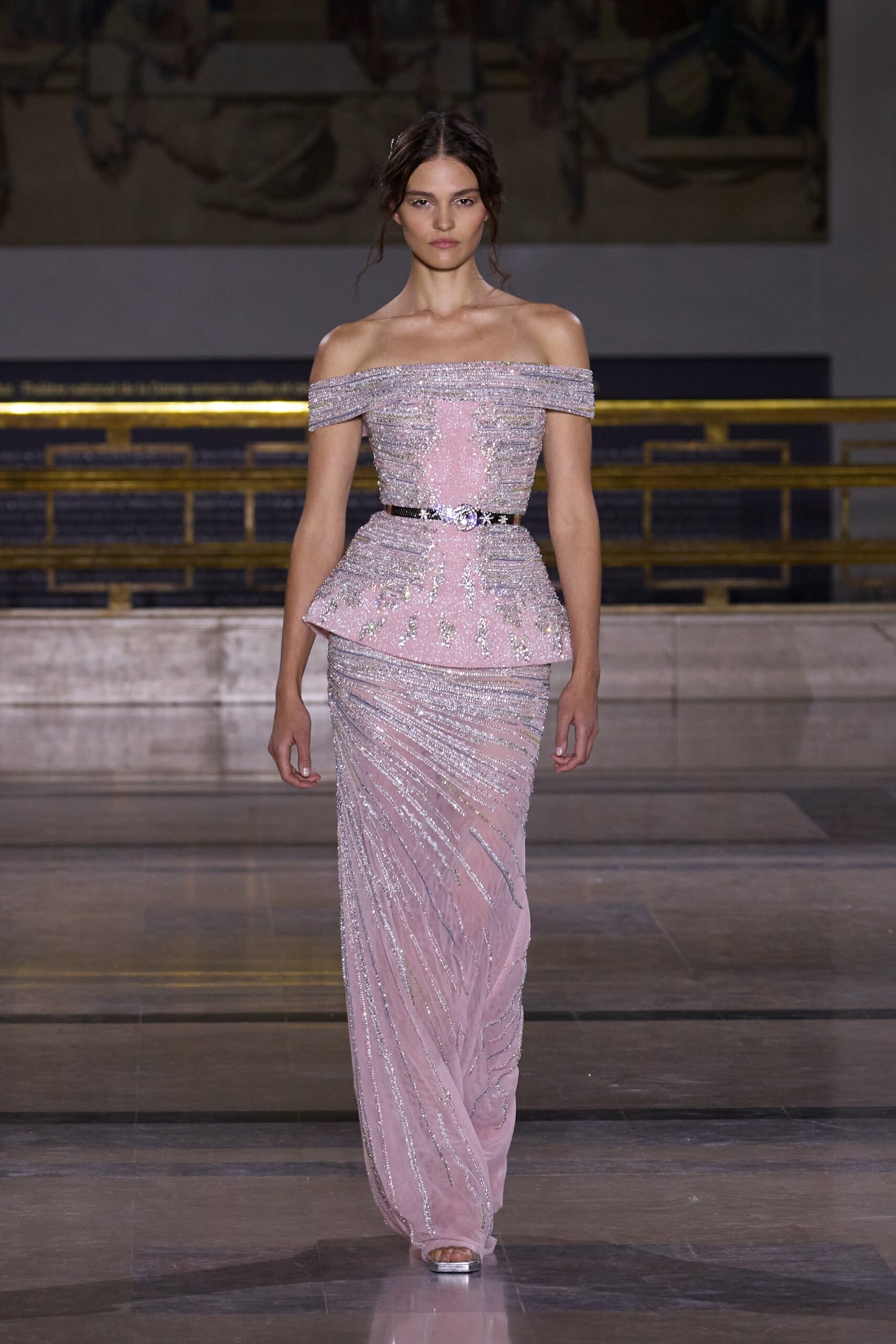 Les couleurs puisent leur inspiration dans les nuances du crépuscule. Des tonalités argentées, vertes, roses et bleues se mêlent aux reflets métalliques, capturant le jeu subtil de l’ombre et de la lumière. La silhouette s’affirme, structurée et flatteuse, oscillant entre majesté et sensualité.