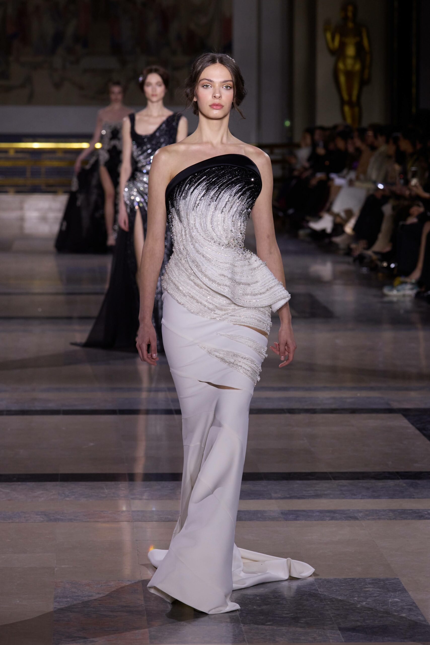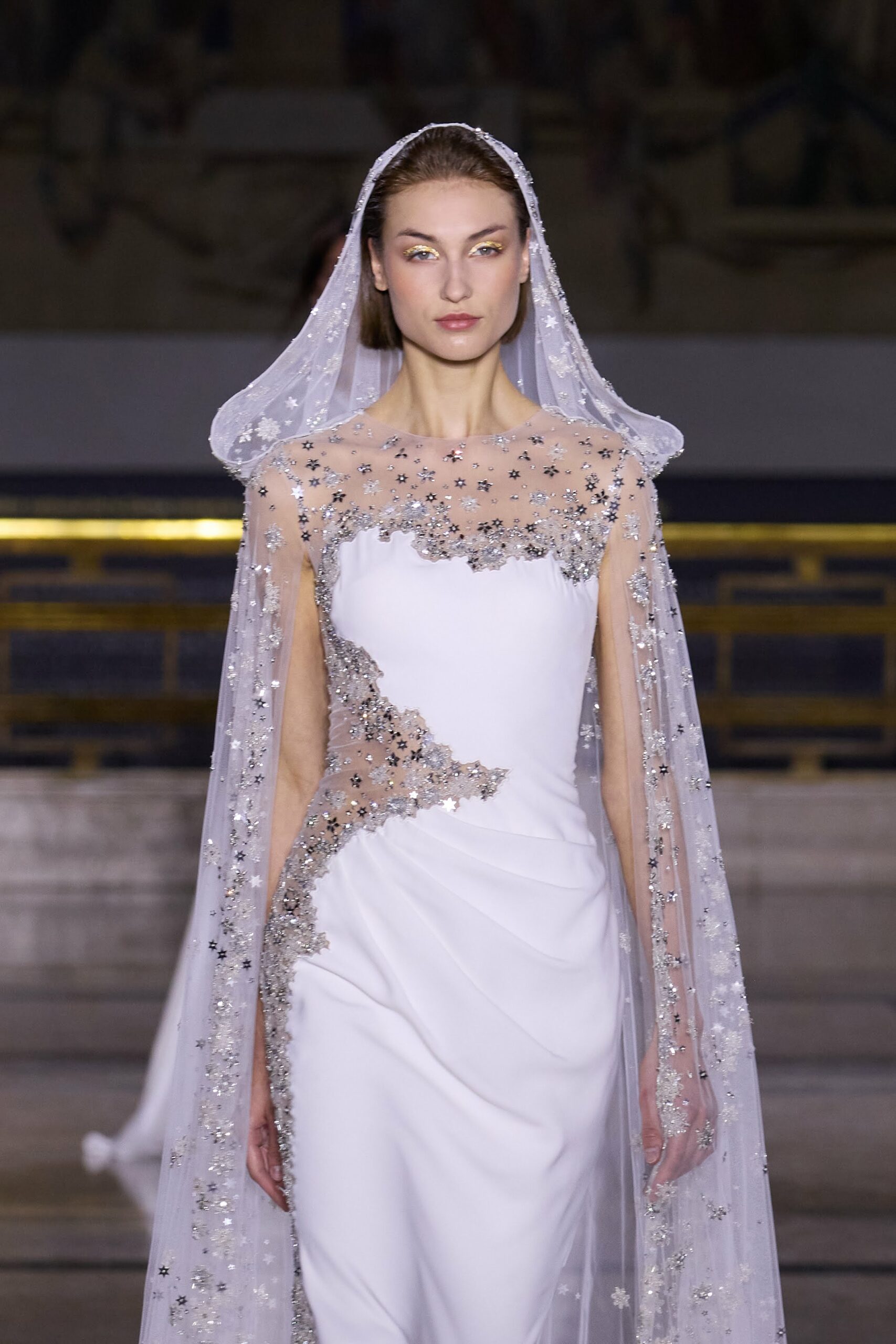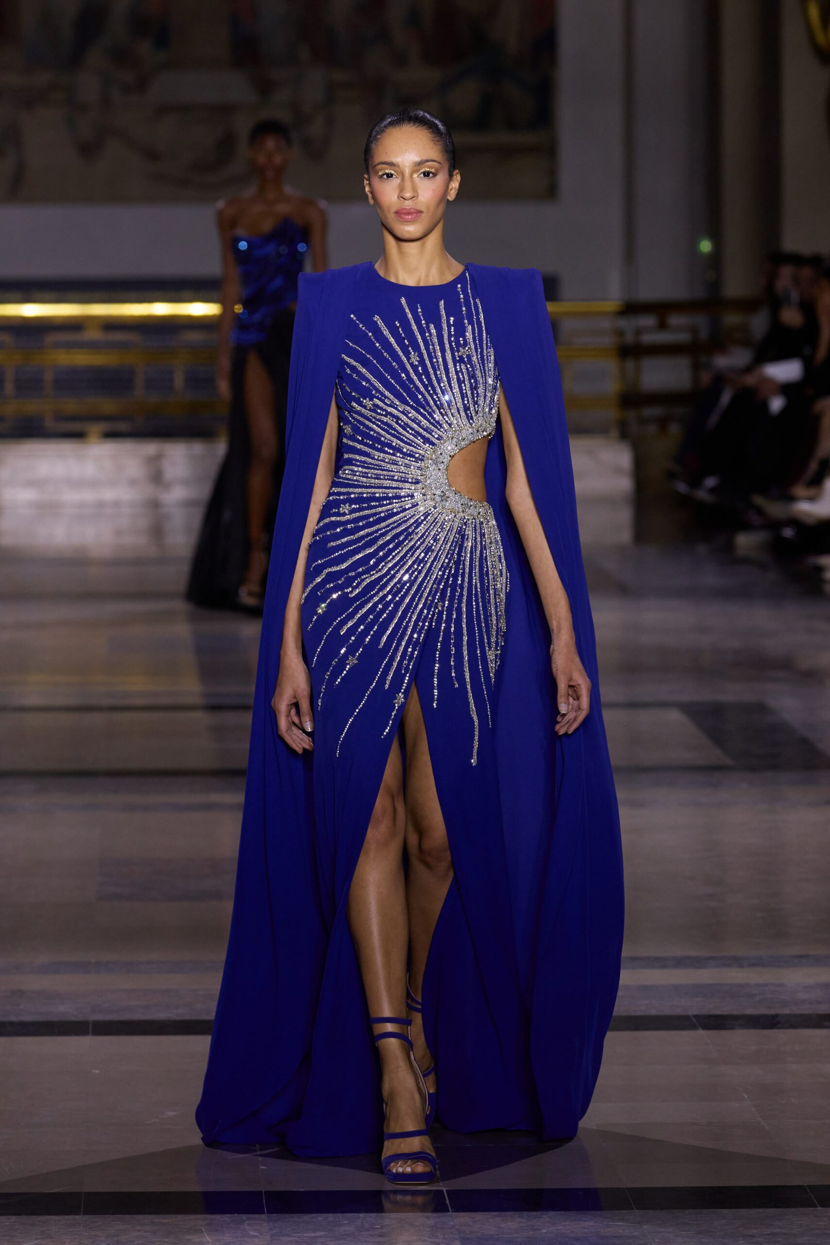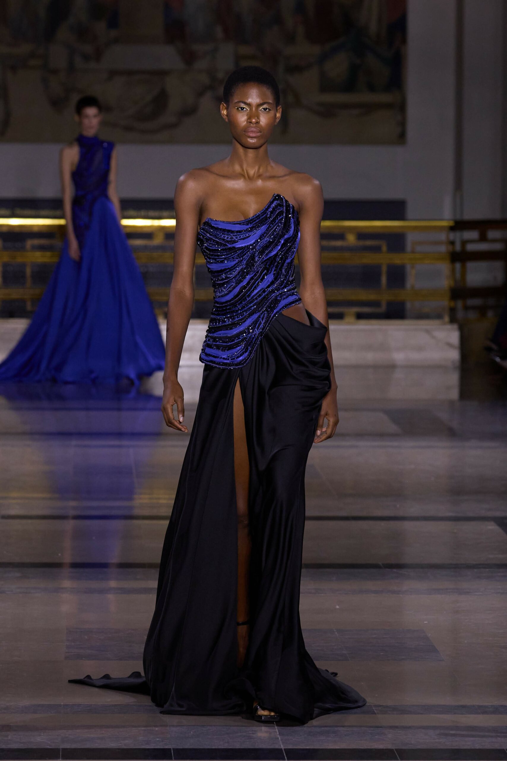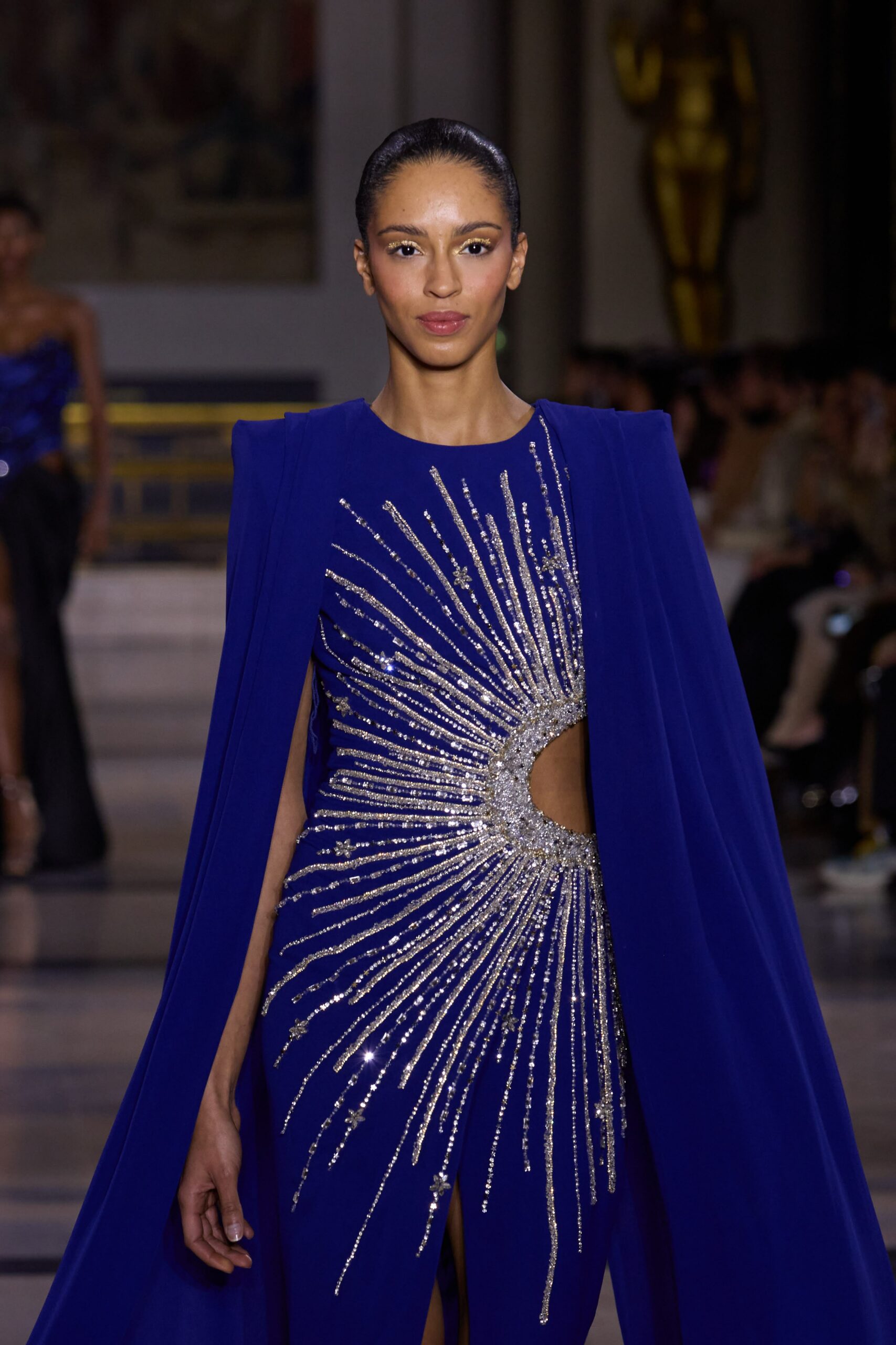 Les couleurs puisent leur inspiration dans les nuances du crépuscule. Des tonalités argentées, vertes, roses et bleues se mêlent aux reflets métalliques, capturant le jeu subtil de l’ombre et de la lumière. La silhouette s’affirme, structurée et flatteuse, oscillant entre majesté et sensualité.