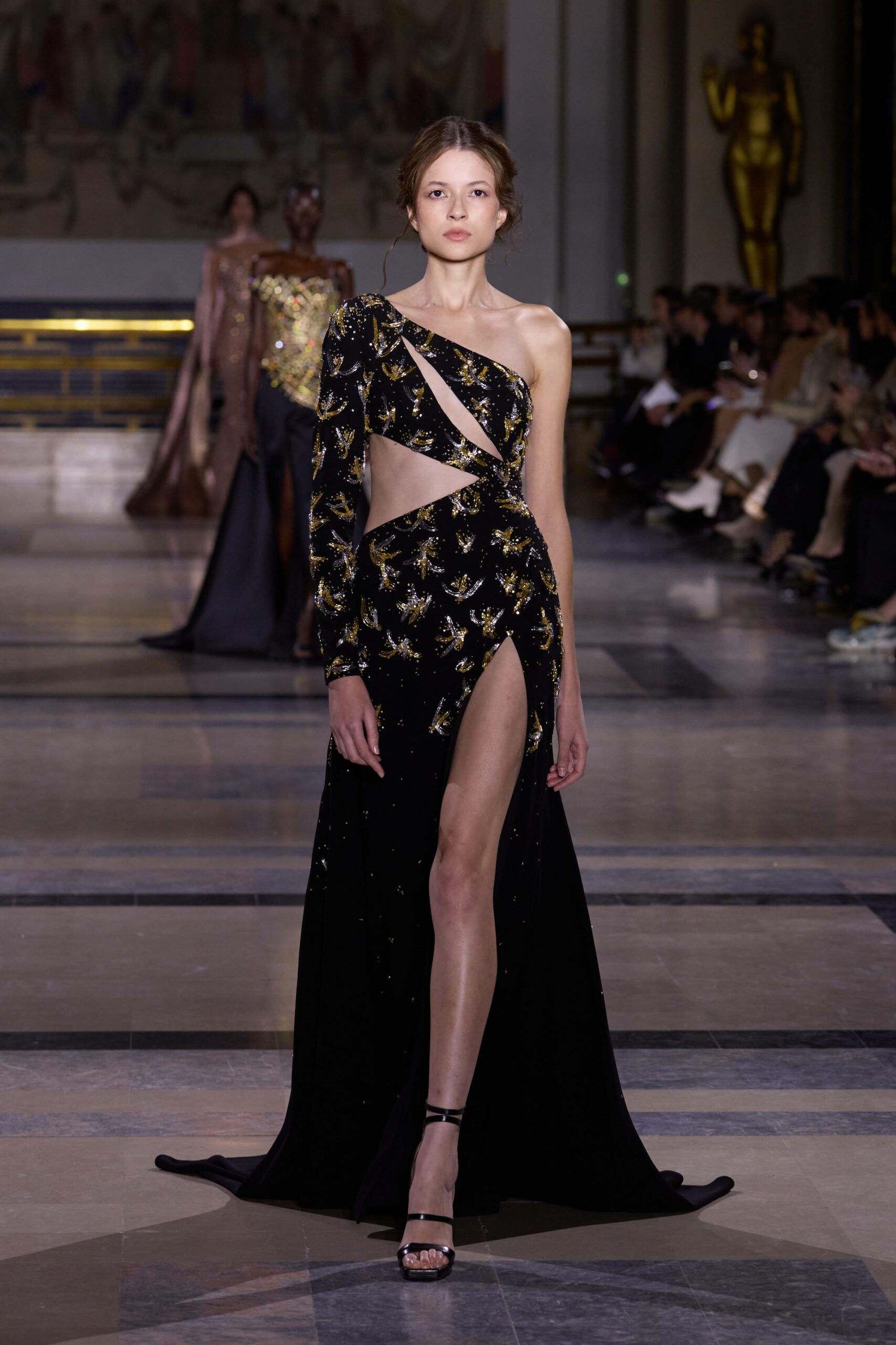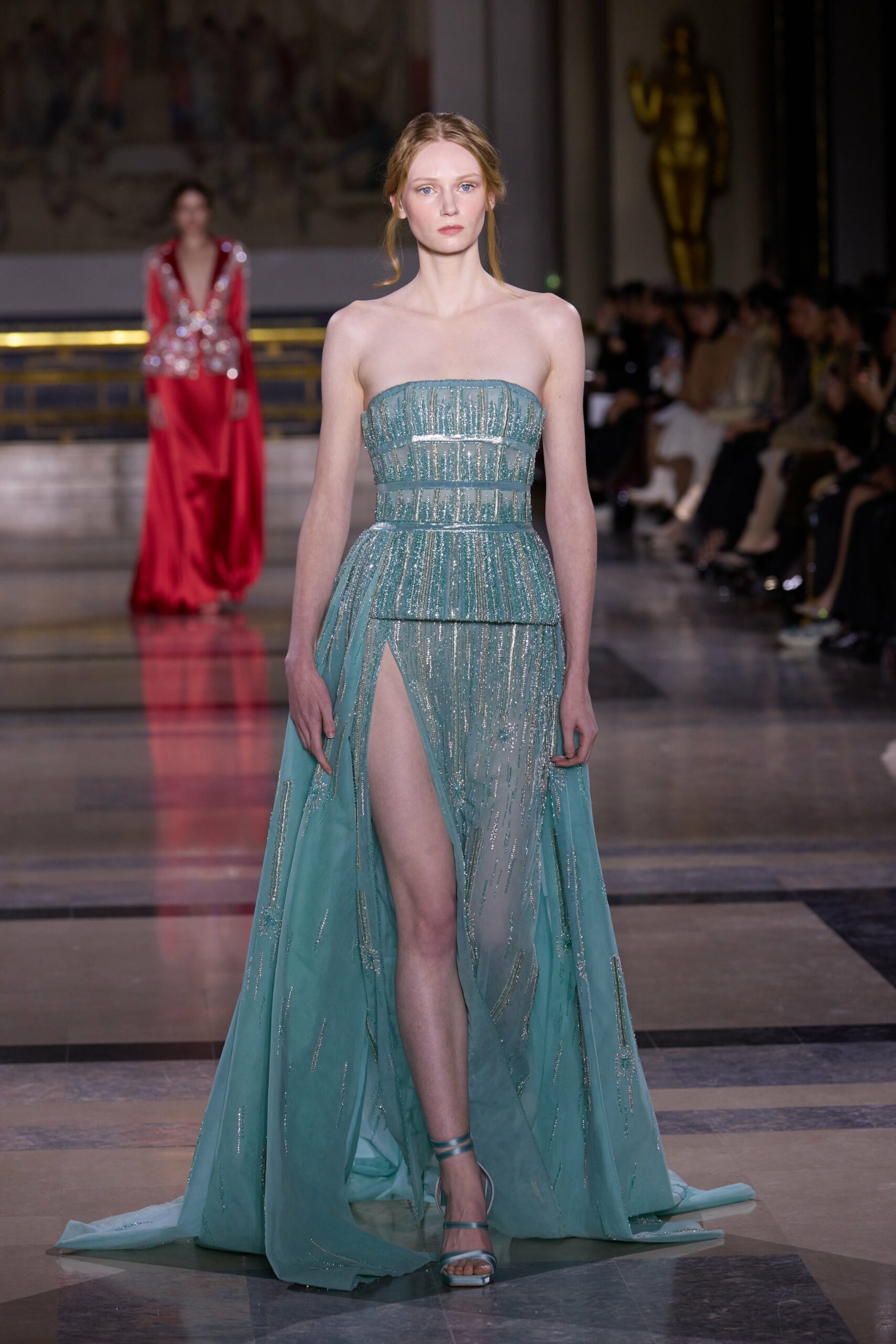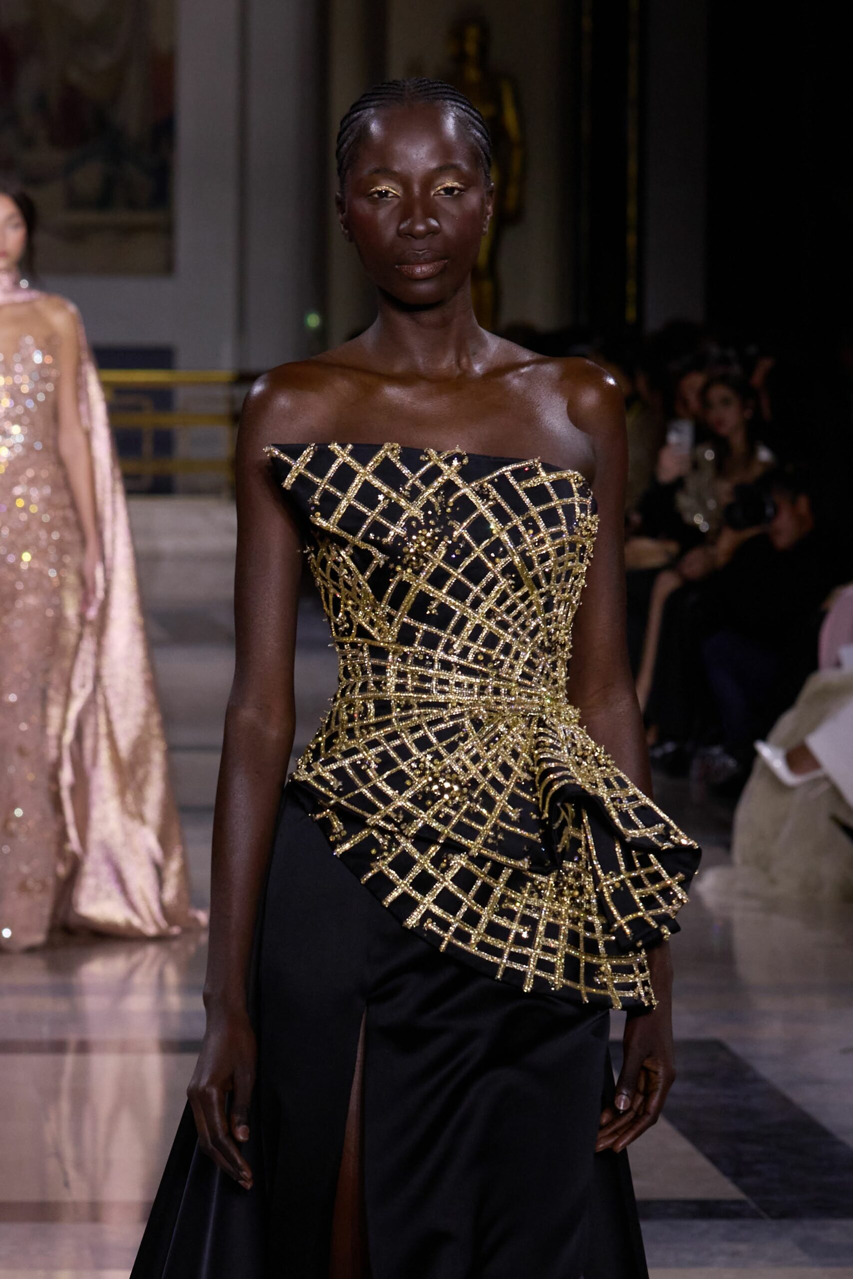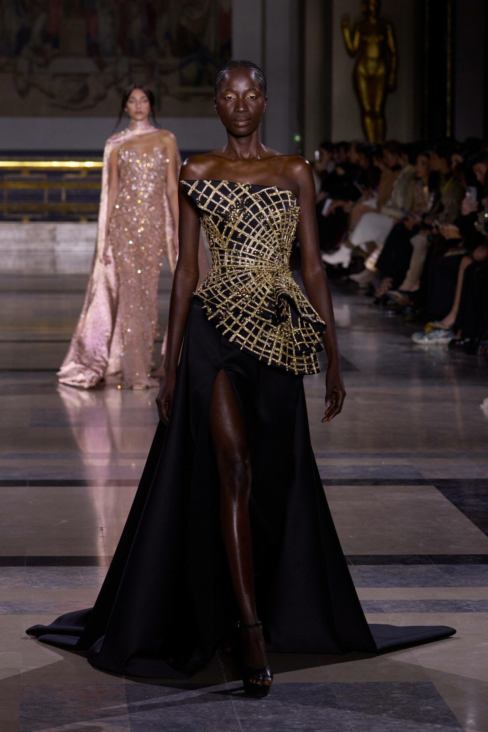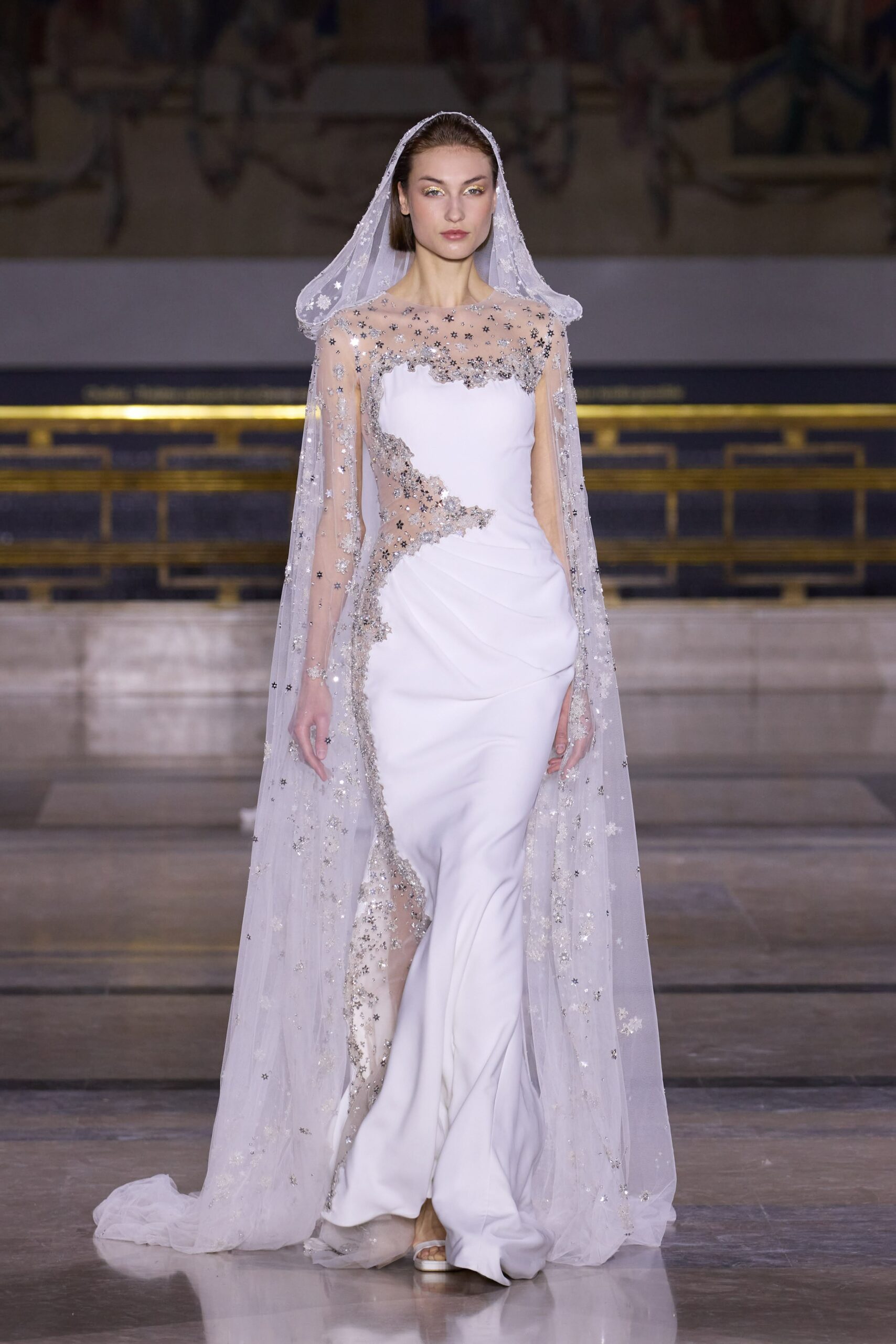 Les couleurs puisent leur inspiration dans les nuances du crépuscule. Des tonalités argentées, vertes, roses et bleues se mêlent aux reflets métalliques, capturant le jeu subtil de l’ombre et de la lumière. La silhouette s’affirme, structurée et flatteuse, oscillant entre majesté et sensualité.