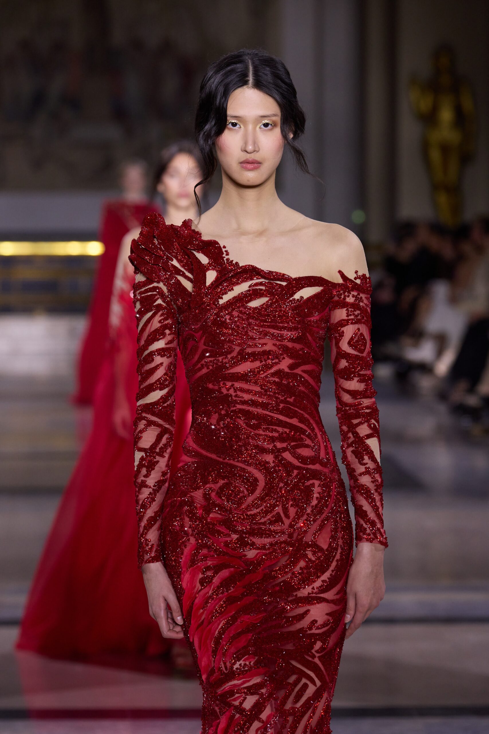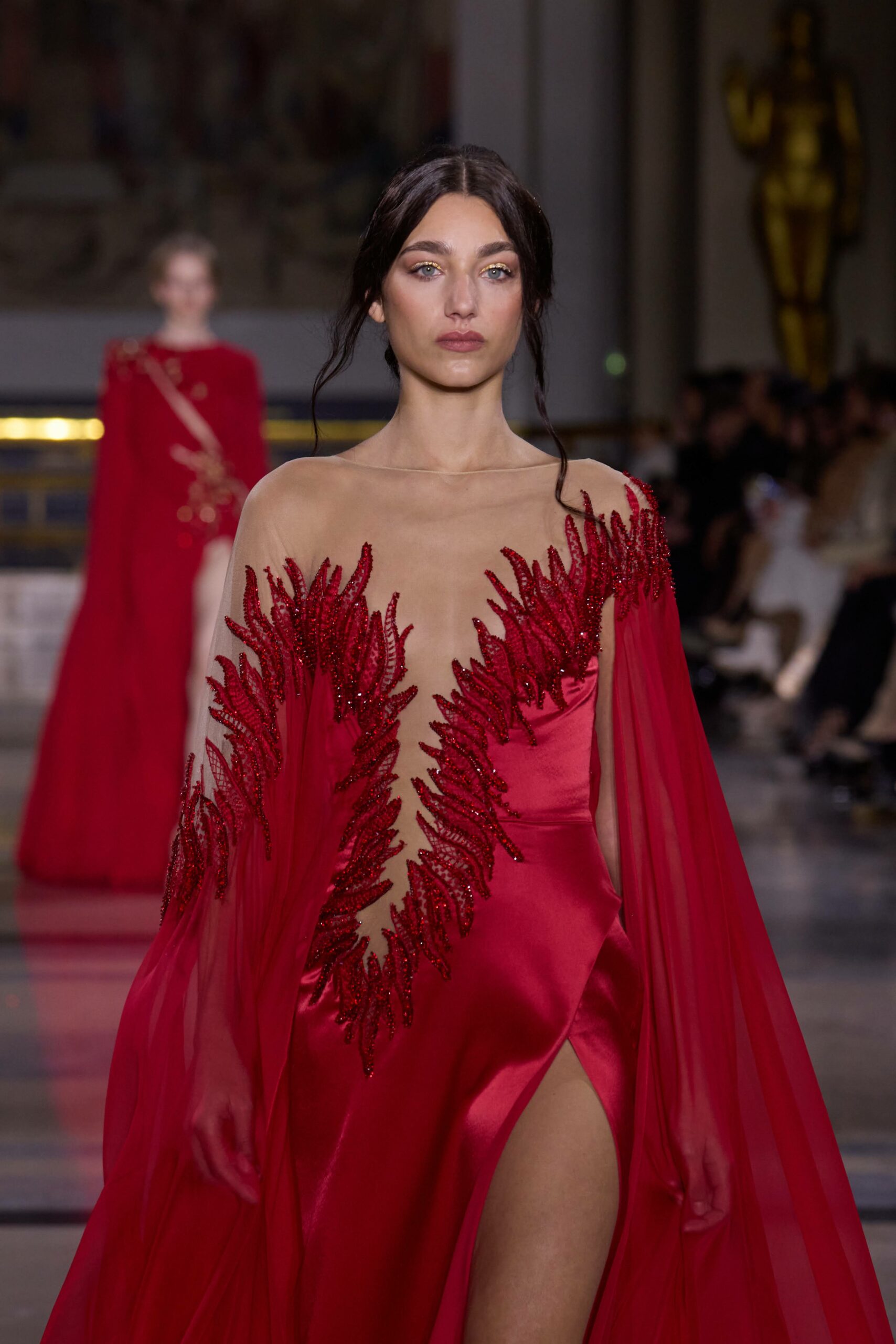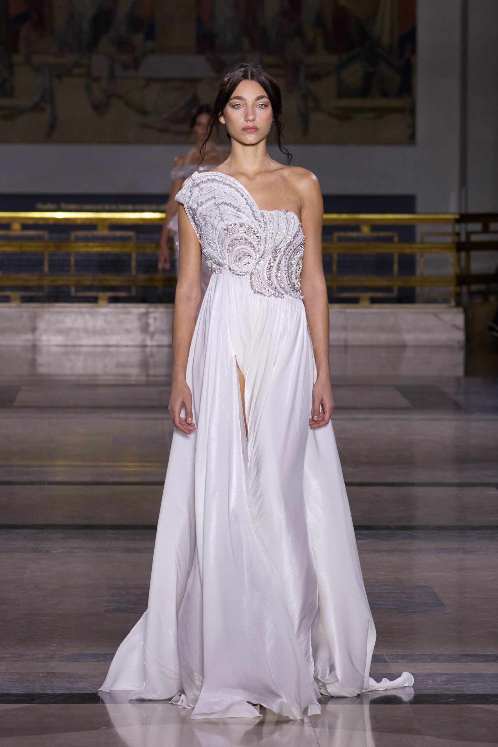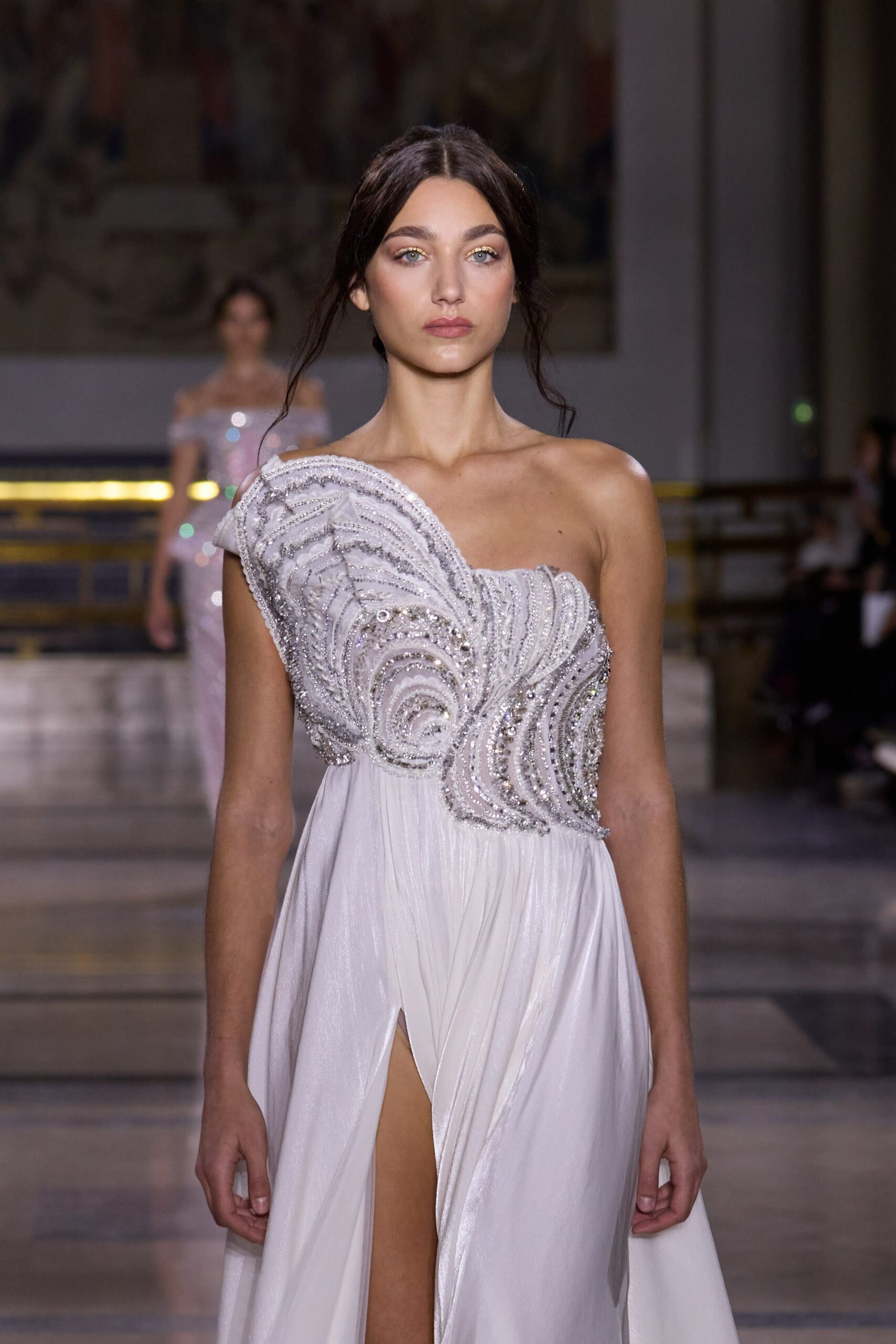 Dans cette collection, chaque création est une œuvre en soi. Les broderies faites main illuminent les robes tandis que l’organza de soie en 3D danse au gré des mouvements. Des pierres rares et des cristaux scintillent sous la lumière, tandis que des techniques innovantes, telles que le plissage minutieux de milliers de feuilles métalliques, redéfinissent les textures.