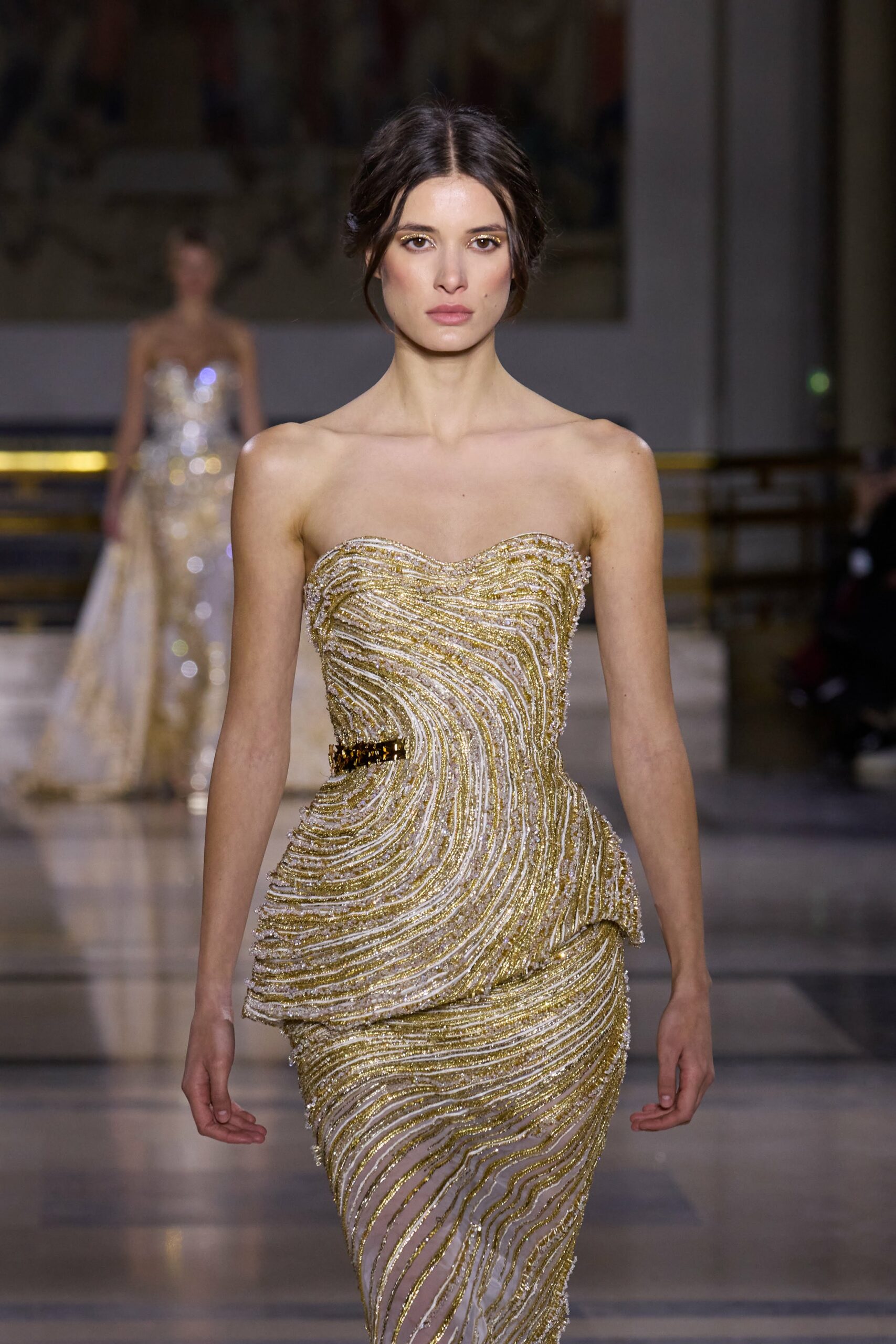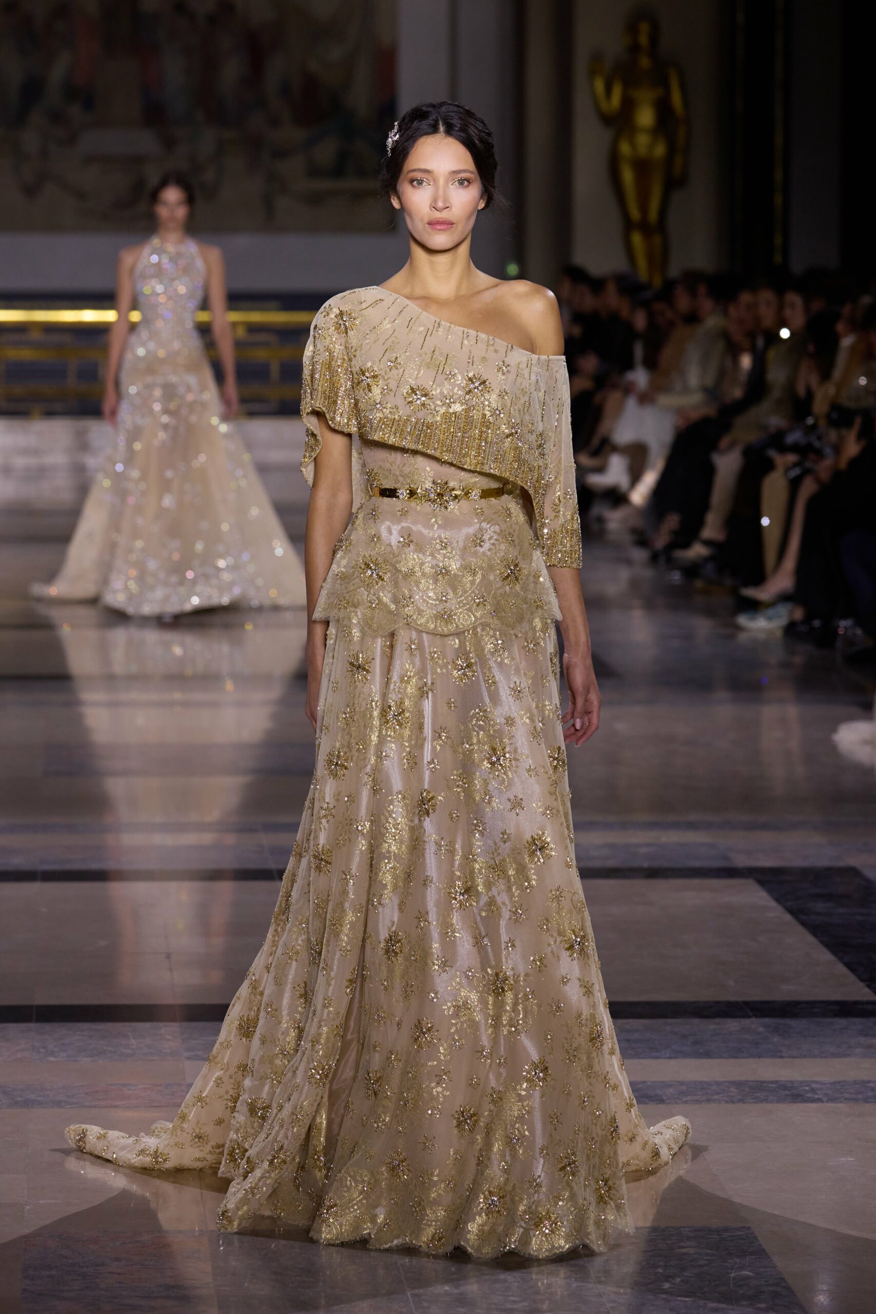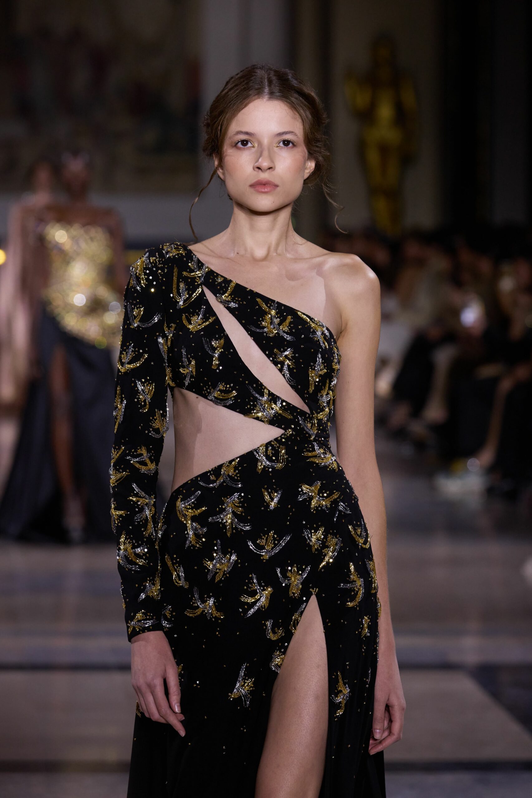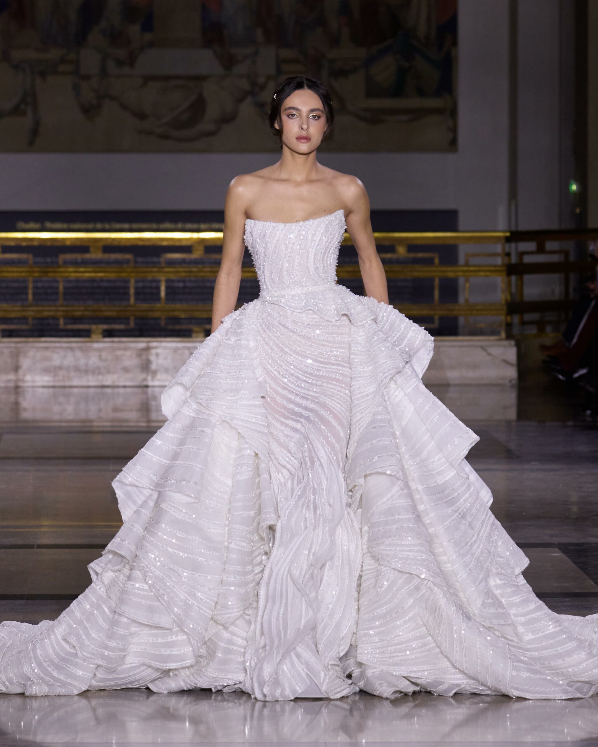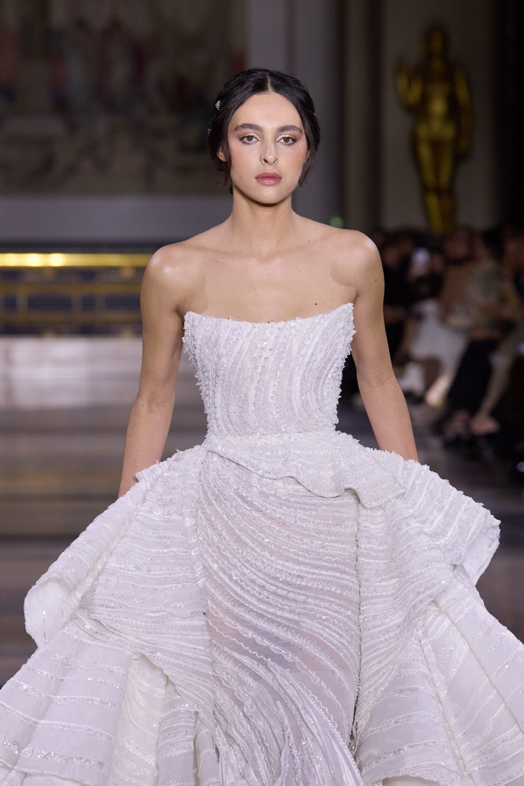 Dans cette collection, chaque création est une œuvre en soi. Les broderies faites main illuminent les robes tandis que l’organza de soie en 3D danse au gré des mouvements. Des pierres rares et des cristaux scintillent sous la lumière, tandis que des techniques innovantes, telles que le plissage minutieux de milliers de feuilles métalliques, redéfinissent les textures.
