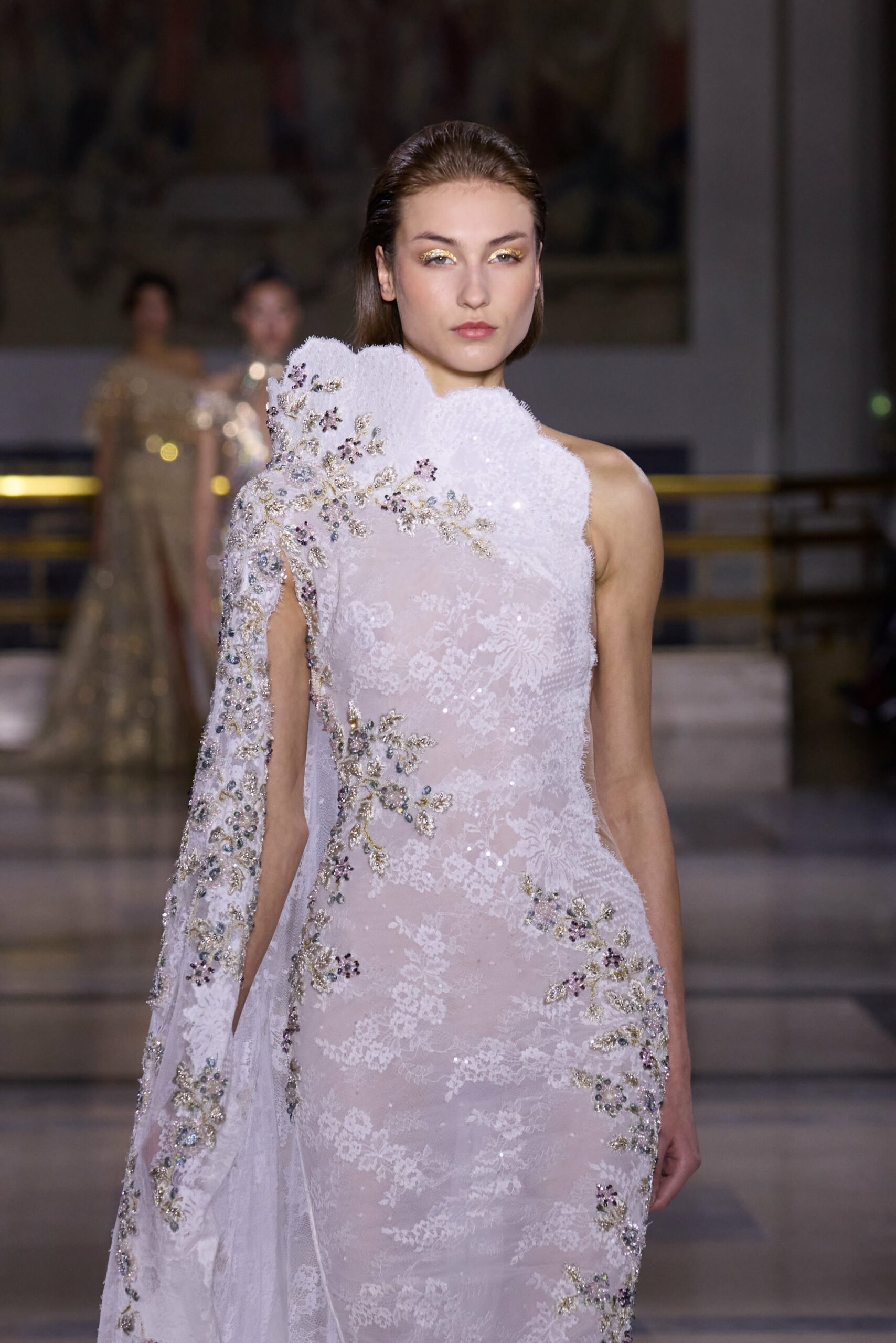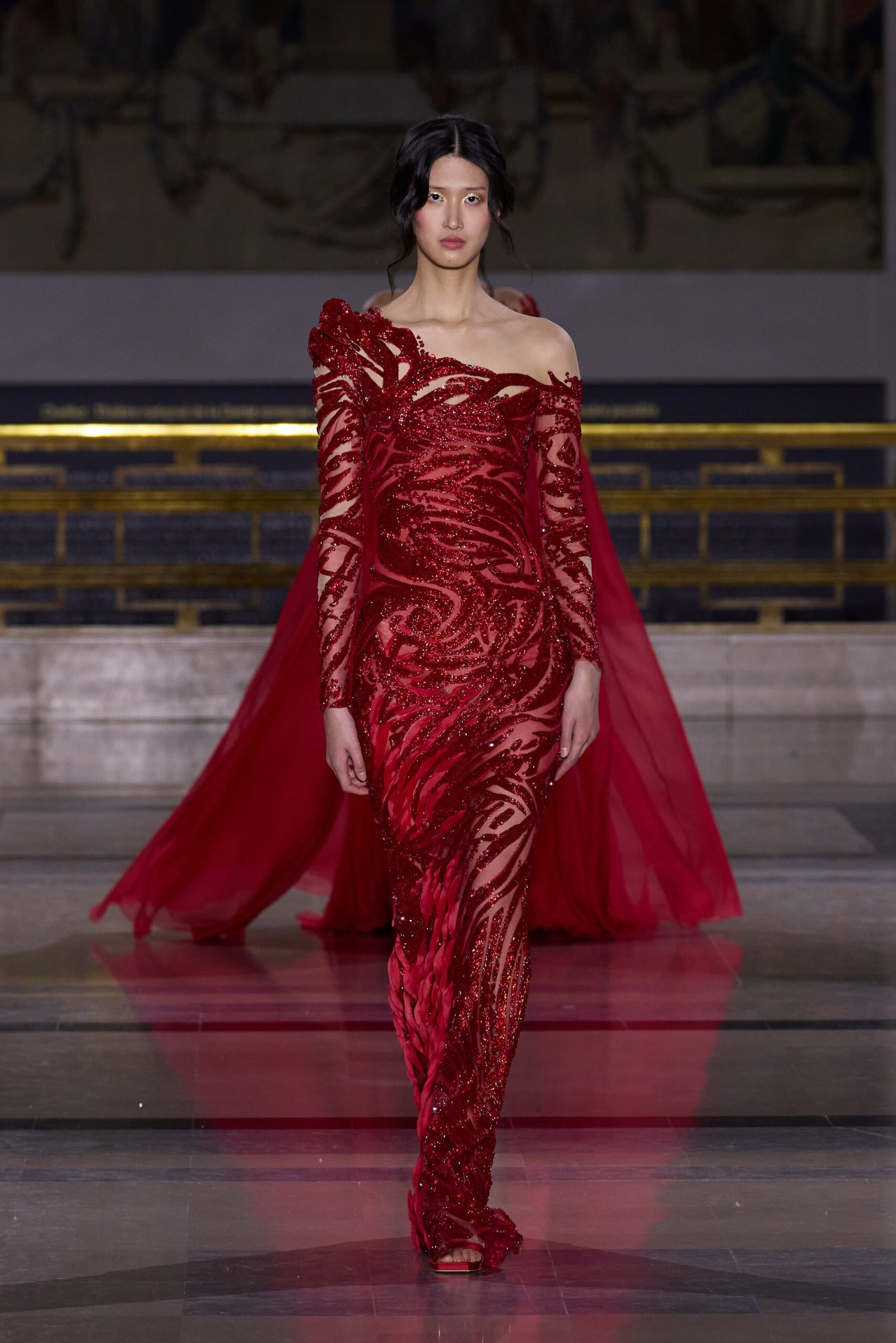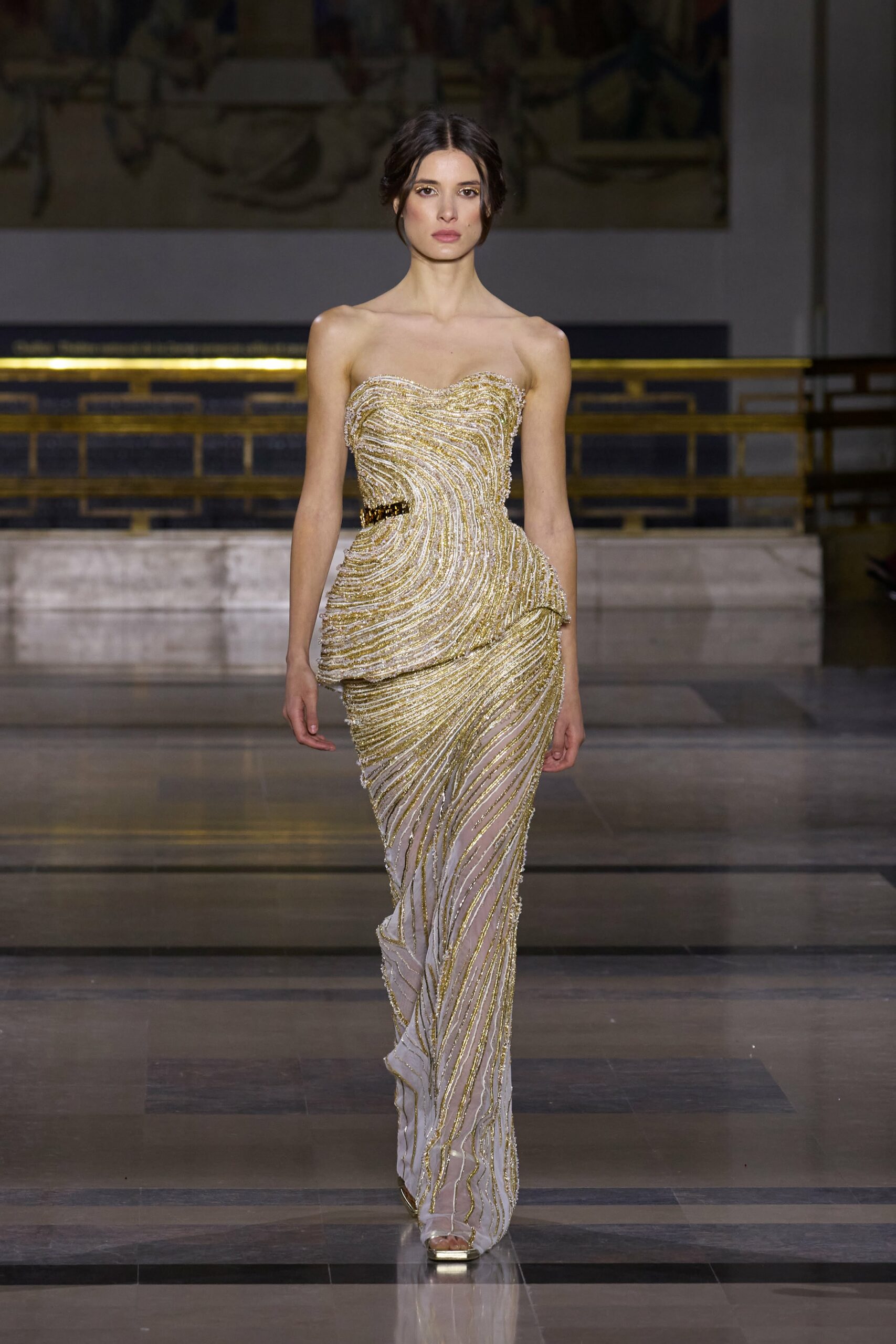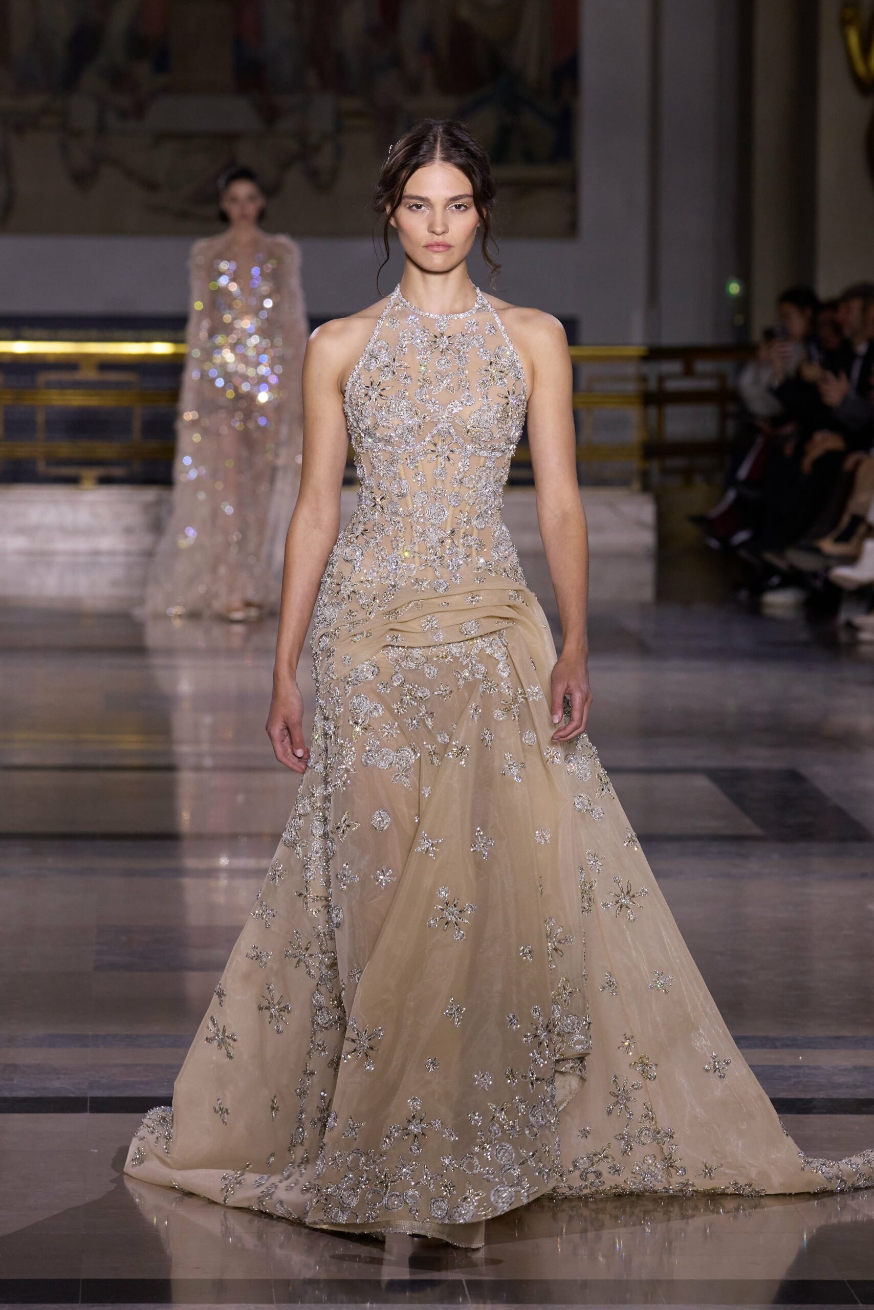 Dans cette collection, chaque création est une œuvre en soi. Les broderies faites main illuminent les robes tandis que l’organza de soie en 3D danse au gré des mouvements. Des pierres rares et des cristaux scintillent sous la lumière, tandis que des techniques innovantes, telles que le plissage minutieux de milliers de feuilles métalliques, redéfinissent les textures.