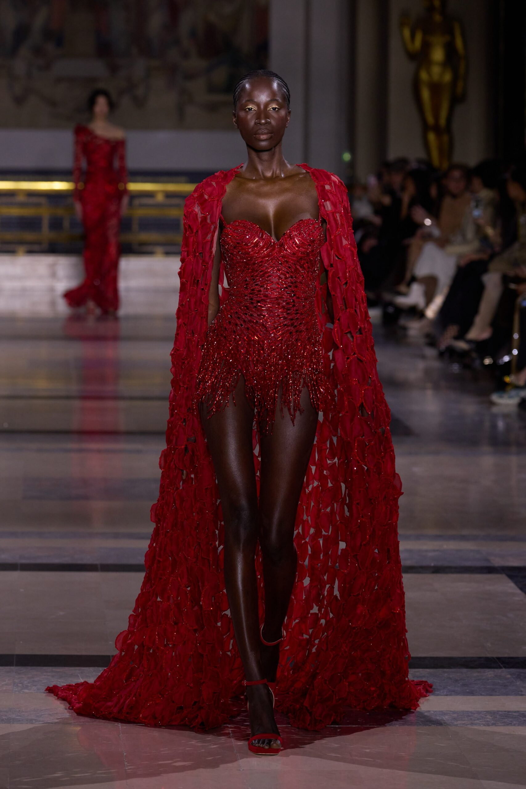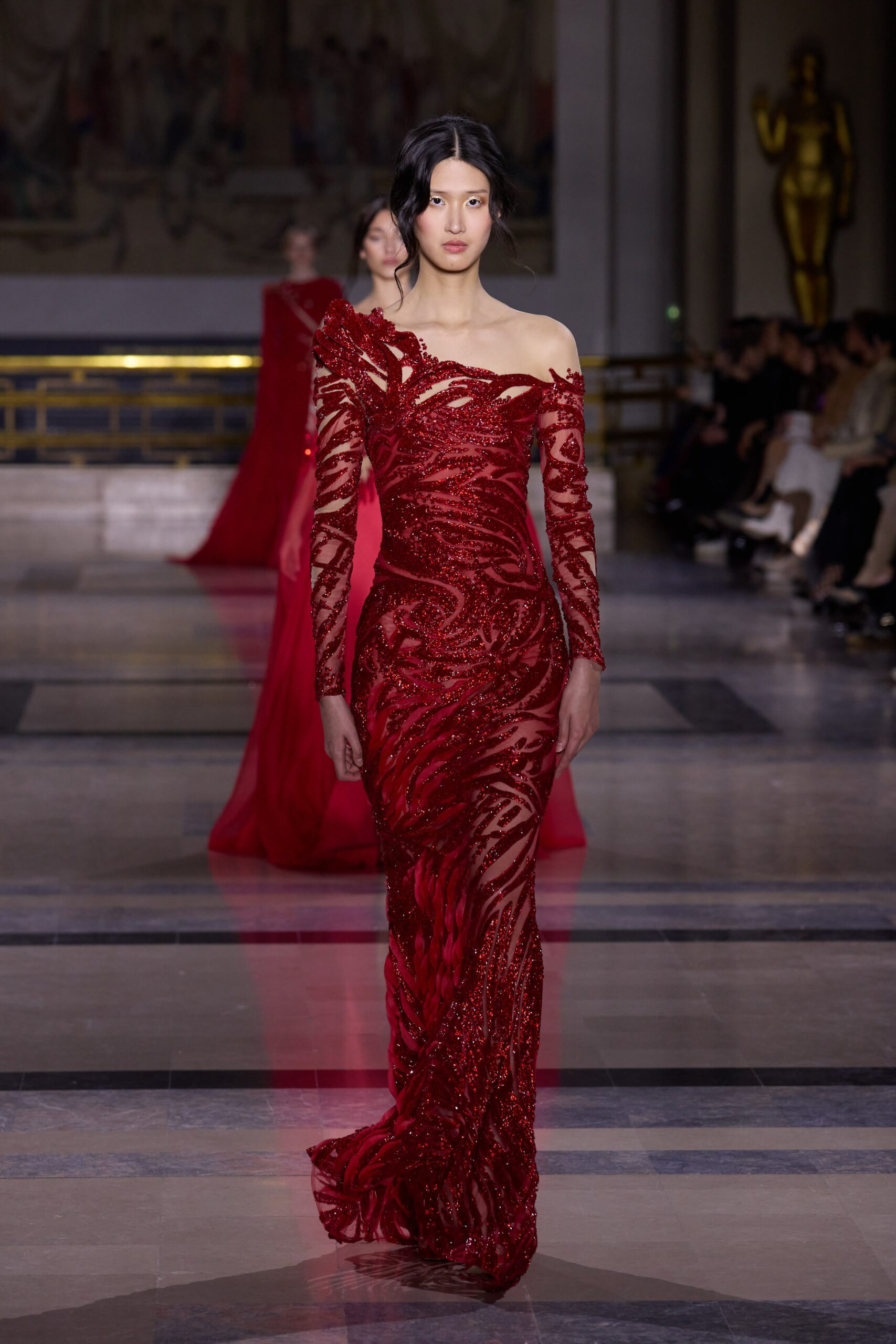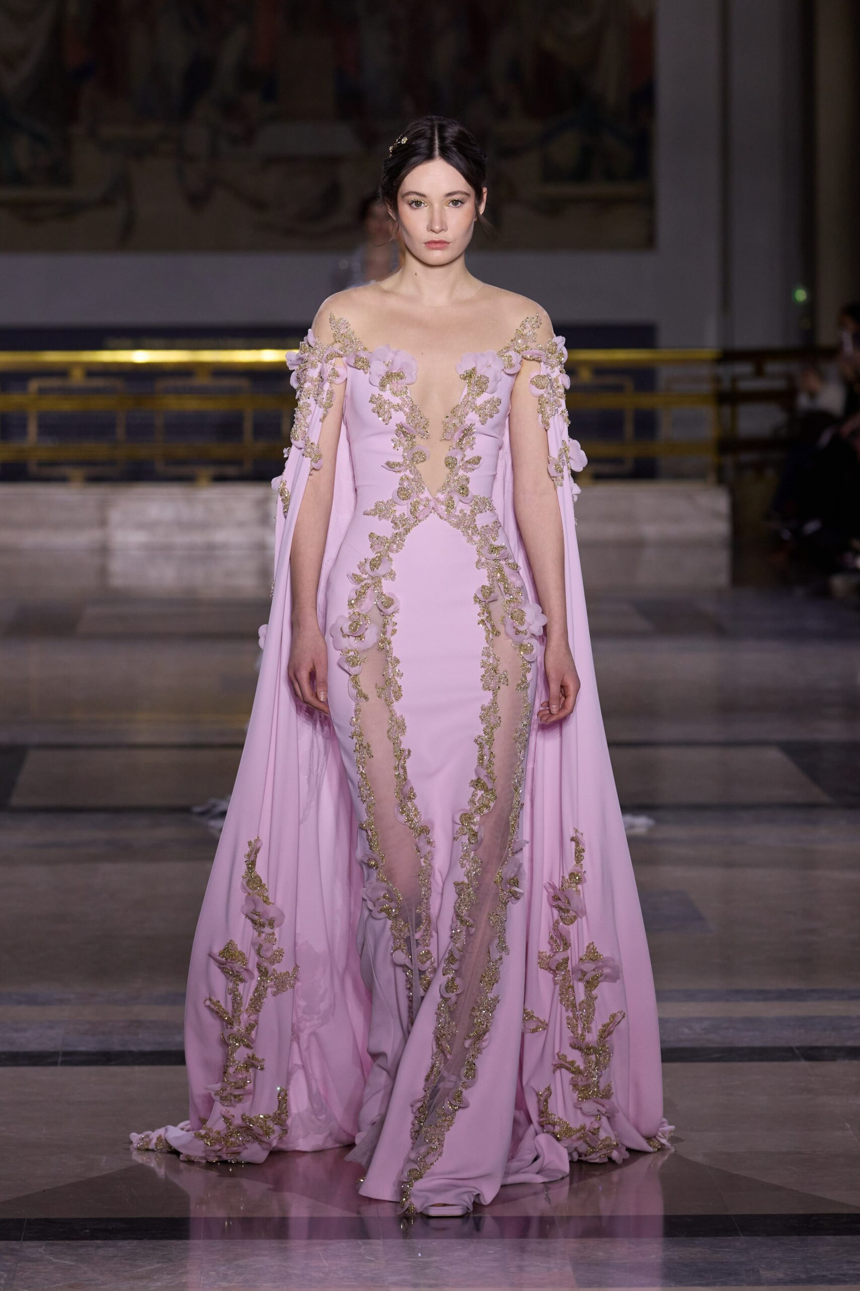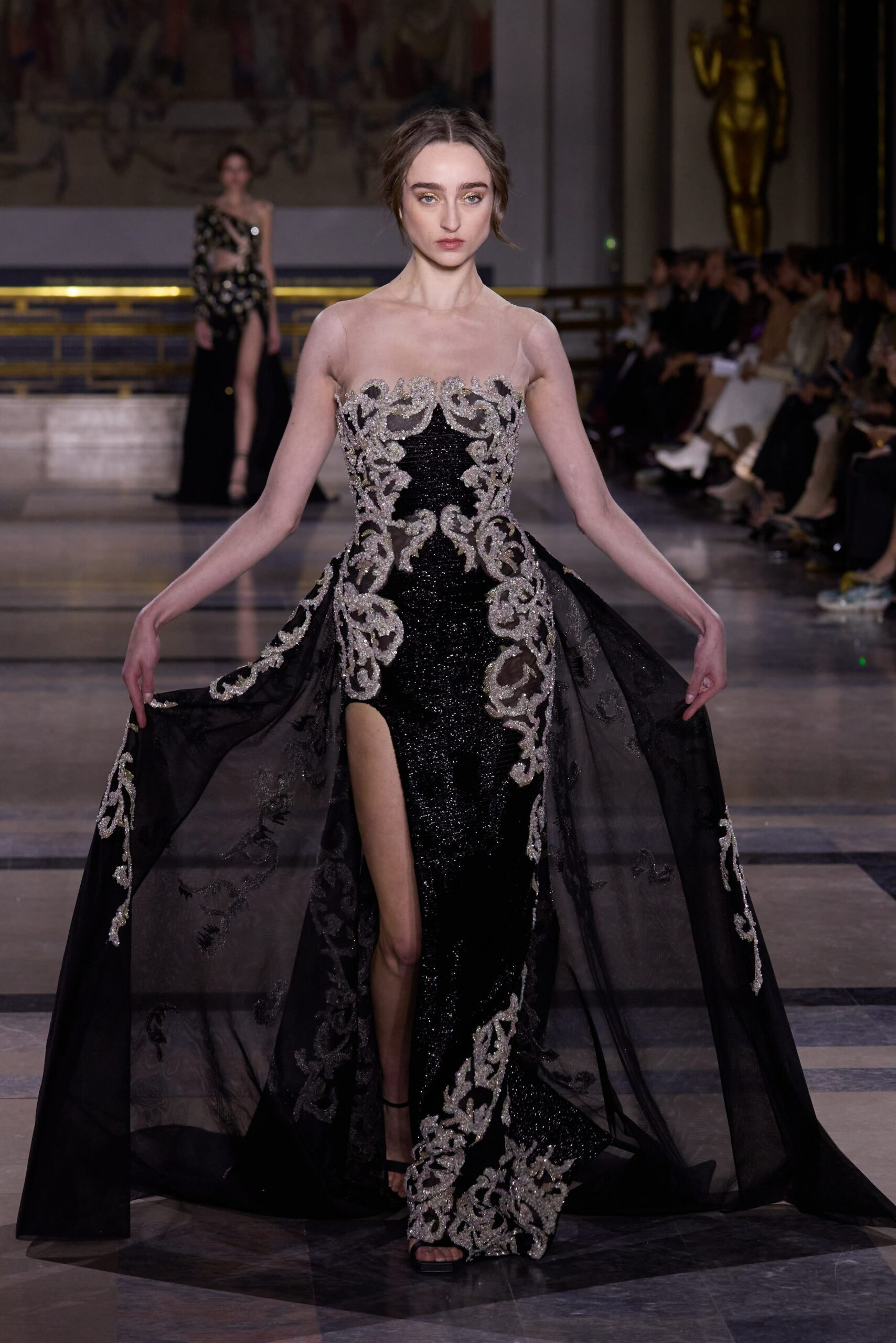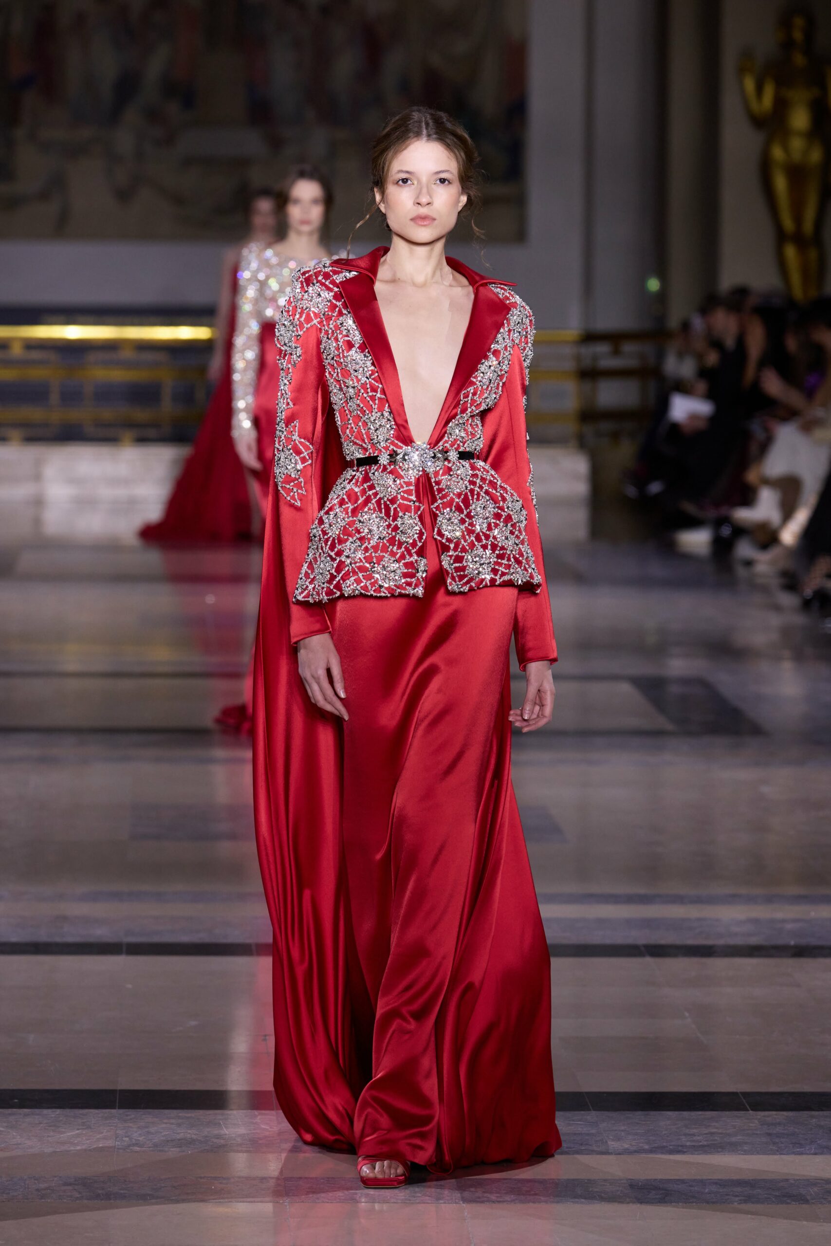 Dans cette collection, chaque création est une œuvre en soi. Les broderies faites main illuminent les robes tandis que l’organza de soie en 3D danse au gré des mouvements. Des pierres rares et des cristaux scintillent sous la lumière, tandis que des techniques innovantes, telles que le plissage minutieux de milliers de feuilles métalliques, redéfinissent les textures.