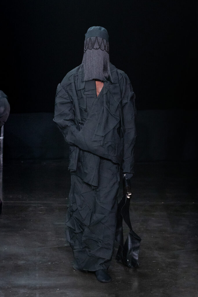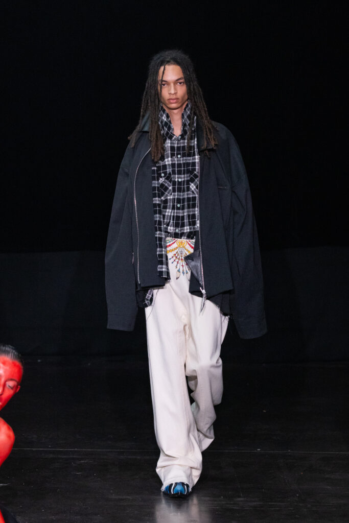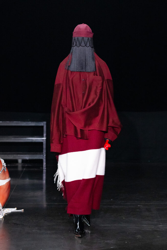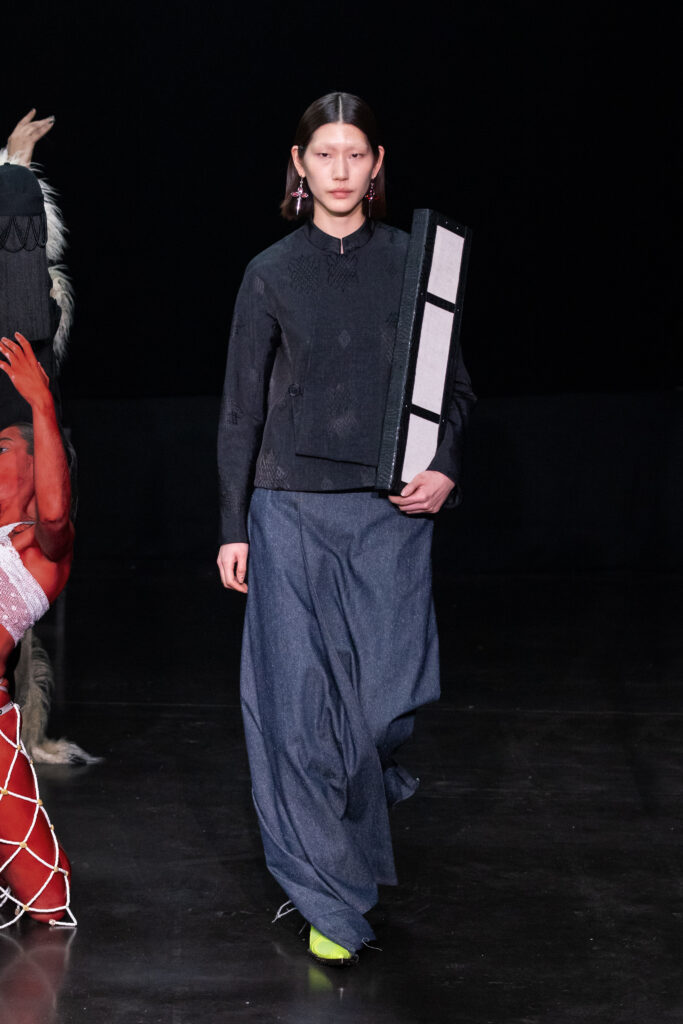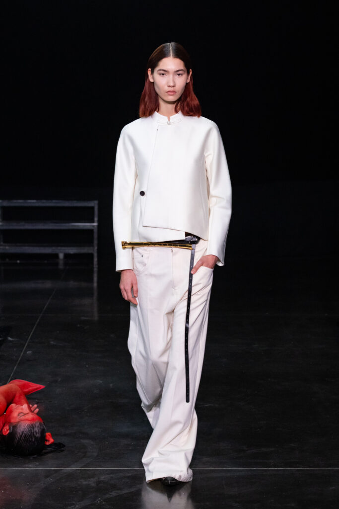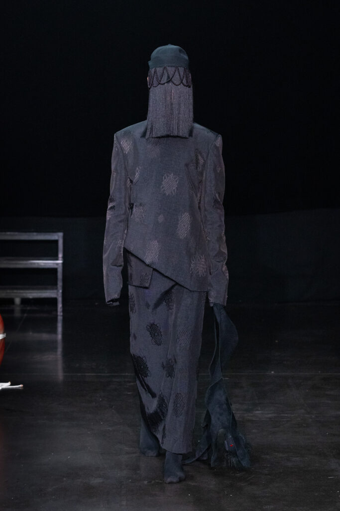 Dans une mise en scène où les danseurs peints en rouge évoquent la puissance primitive des rituels bouddhistes, SANKUANZ brouille les frontières entre art et vêtement. Accompagnée d’une bande-son expérimentale, cette collection devient un acte spirituel, une exploration où la mode devient un médium entre visible et invisible.