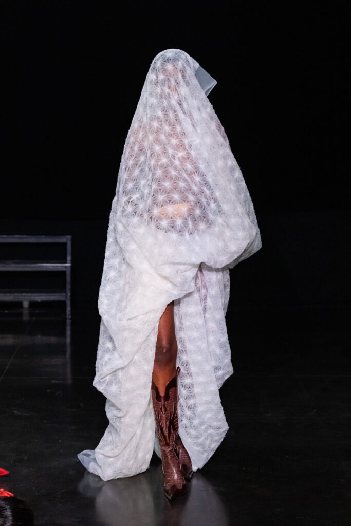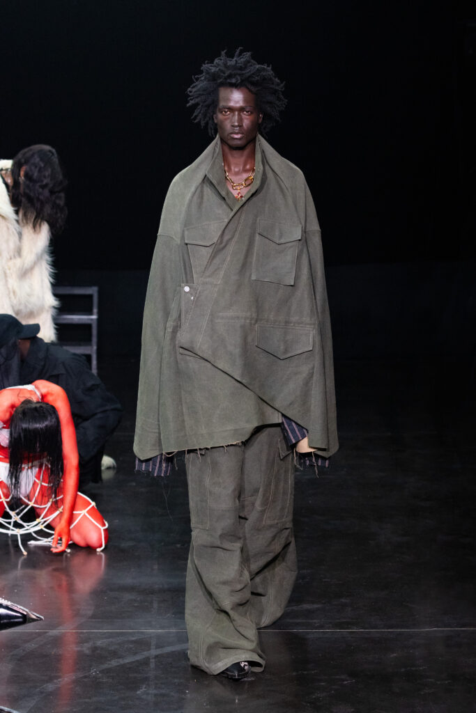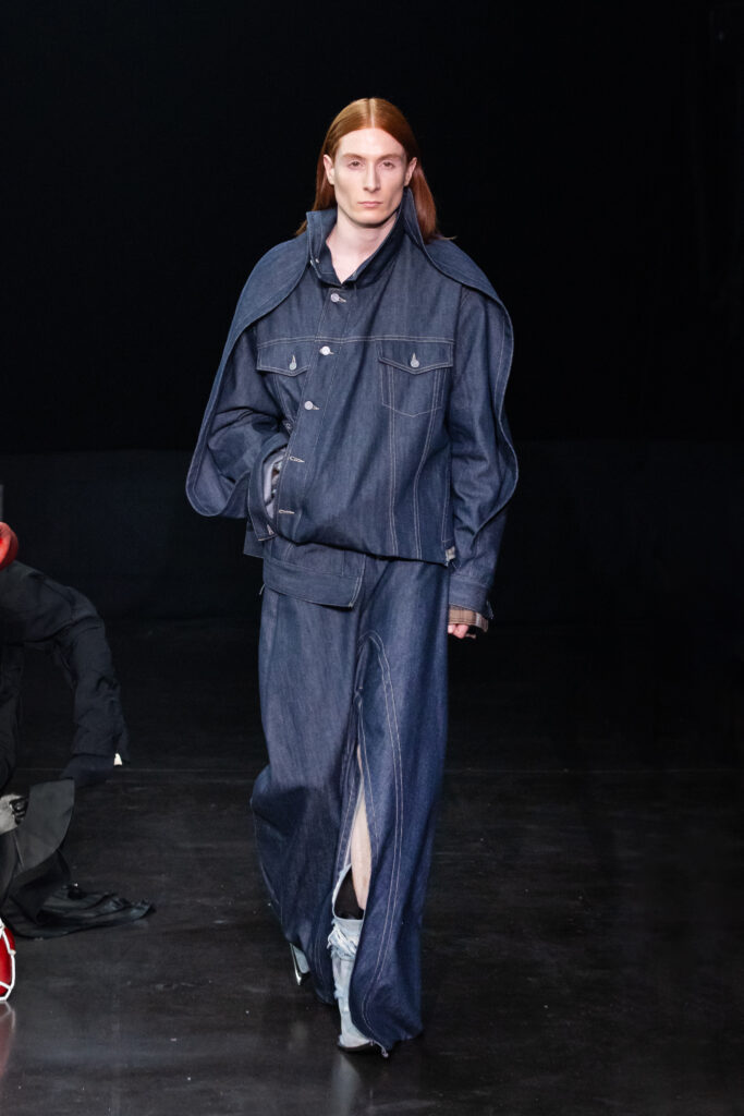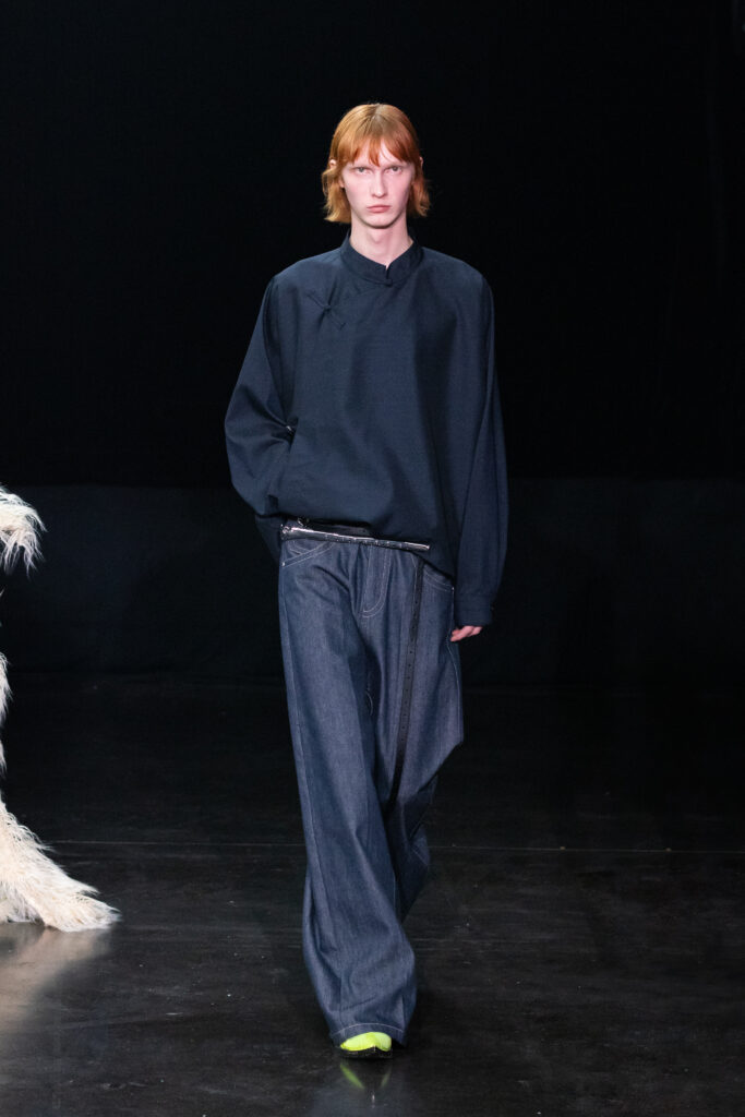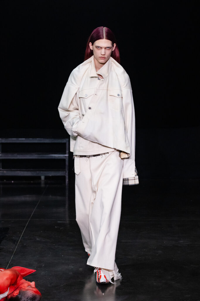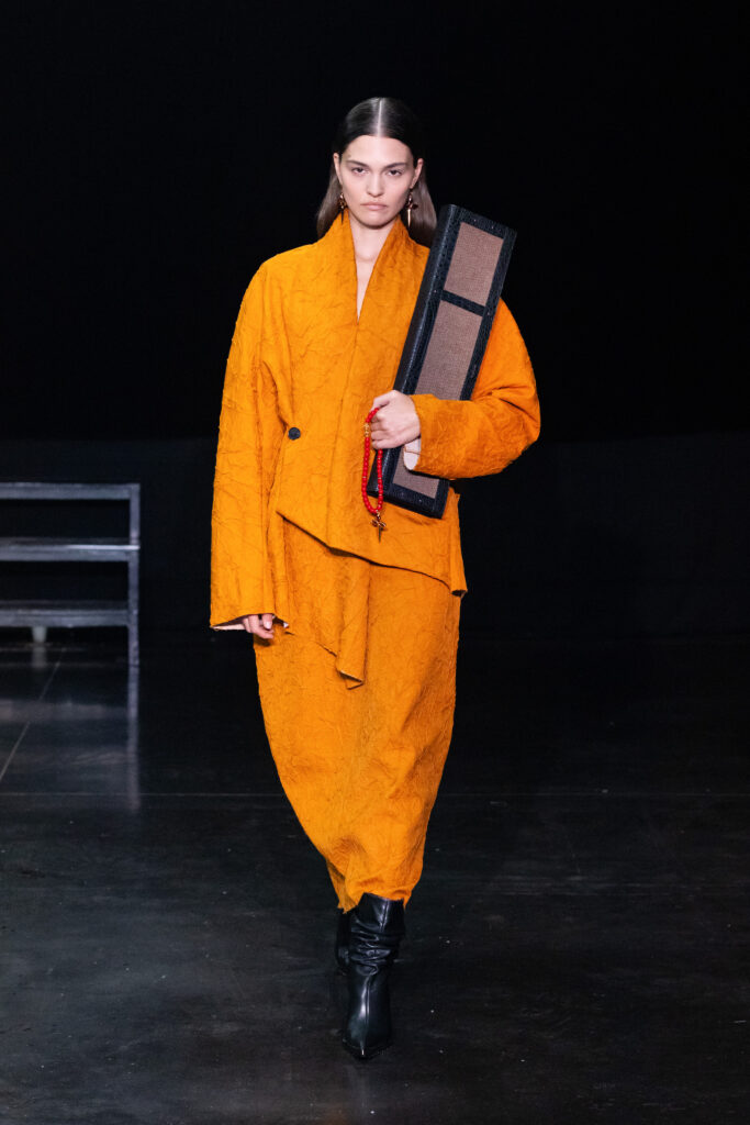 Dans une mise en scène où les danseurs peints en rouge évoquent la puissance primitive des rituels bouddhistes, SANKUANZ brouille les frontières entre art et vêtement. Accompagnée d’une bande-son expérimentale, cette collection devient un acte spirituel, une exploration où la mode devient un médium entre visible et invisible.