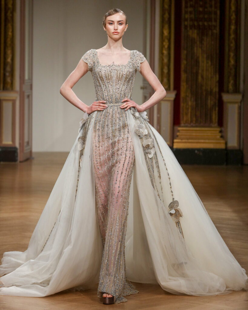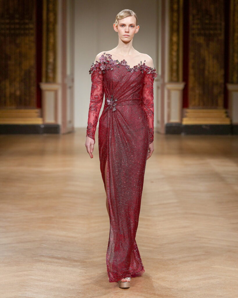 L’une des créations les plus marquantes de cette saison reste la robe de mariée. Sa silhouette théâtrale, avec une traîne majestueuse et des détails réfléchissants, incarne l’essence même de la Haute Couture. Cette pièce singulière, par sa grandeur et ses détails minutieux, traduit l’aboutissement de l’expertise de Nakad, qui a su marier l’audace à la pureté de la couture traditionnelle.