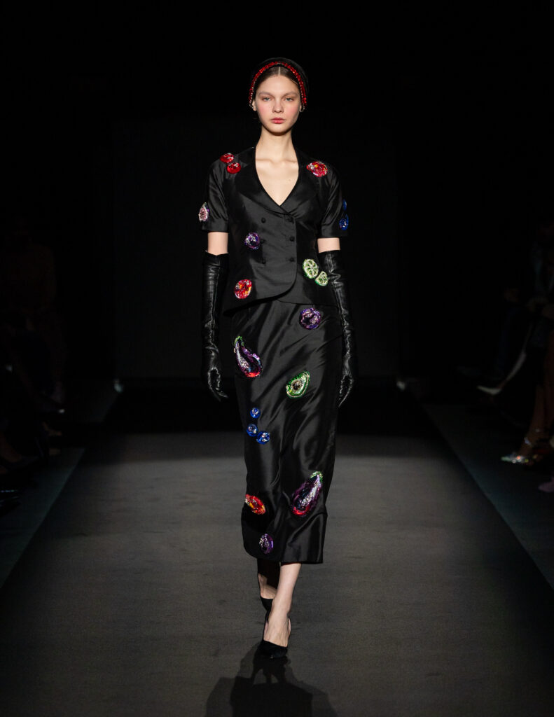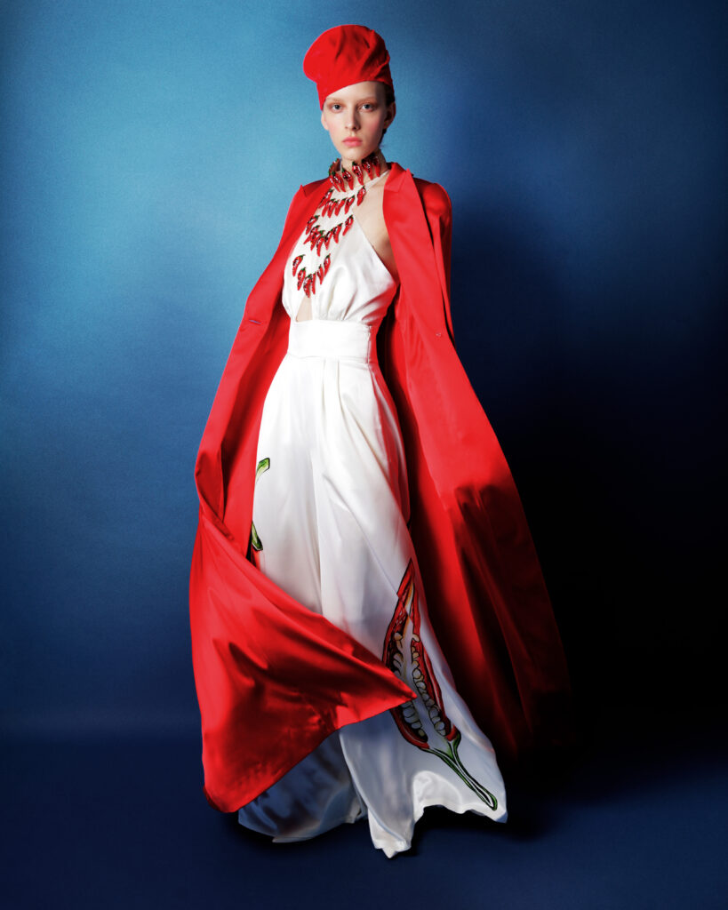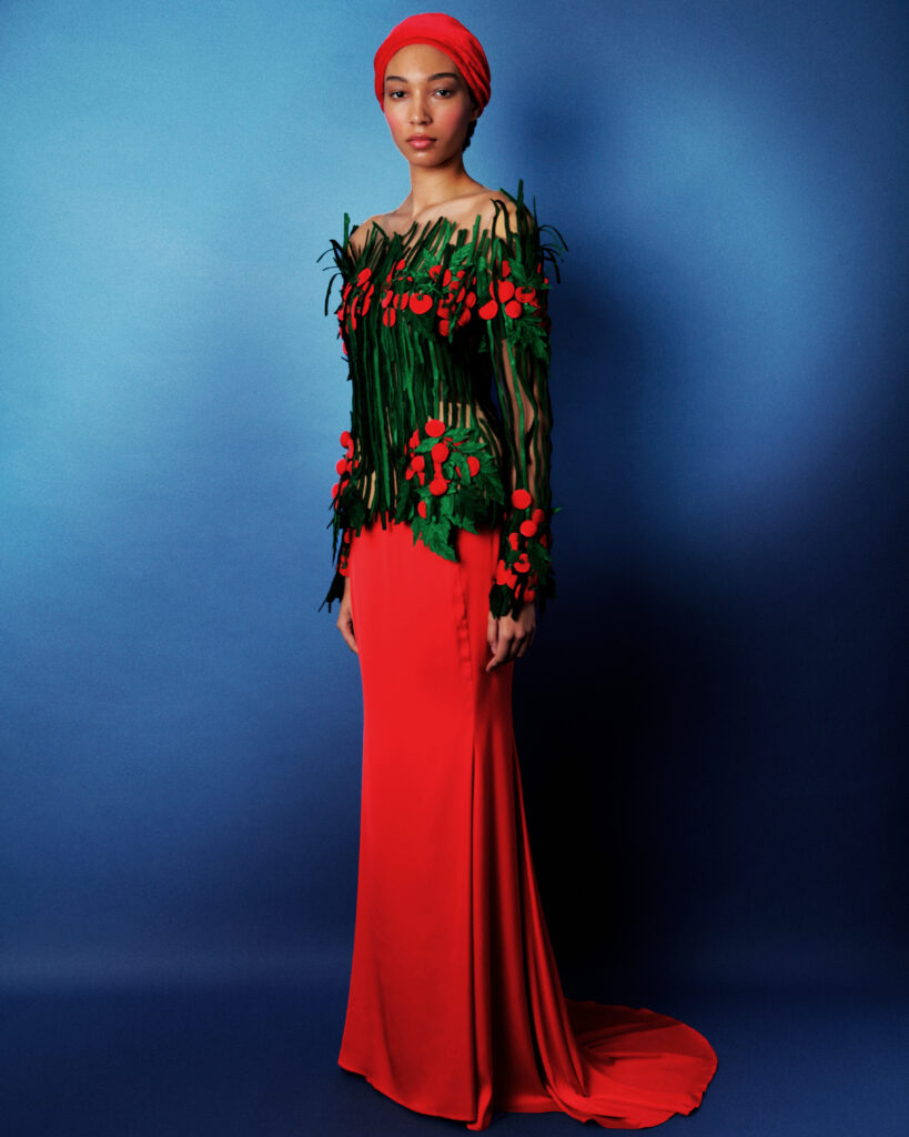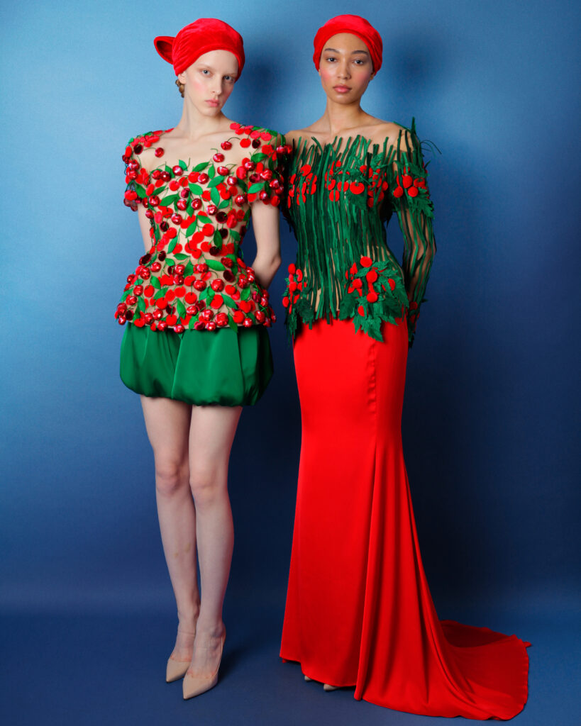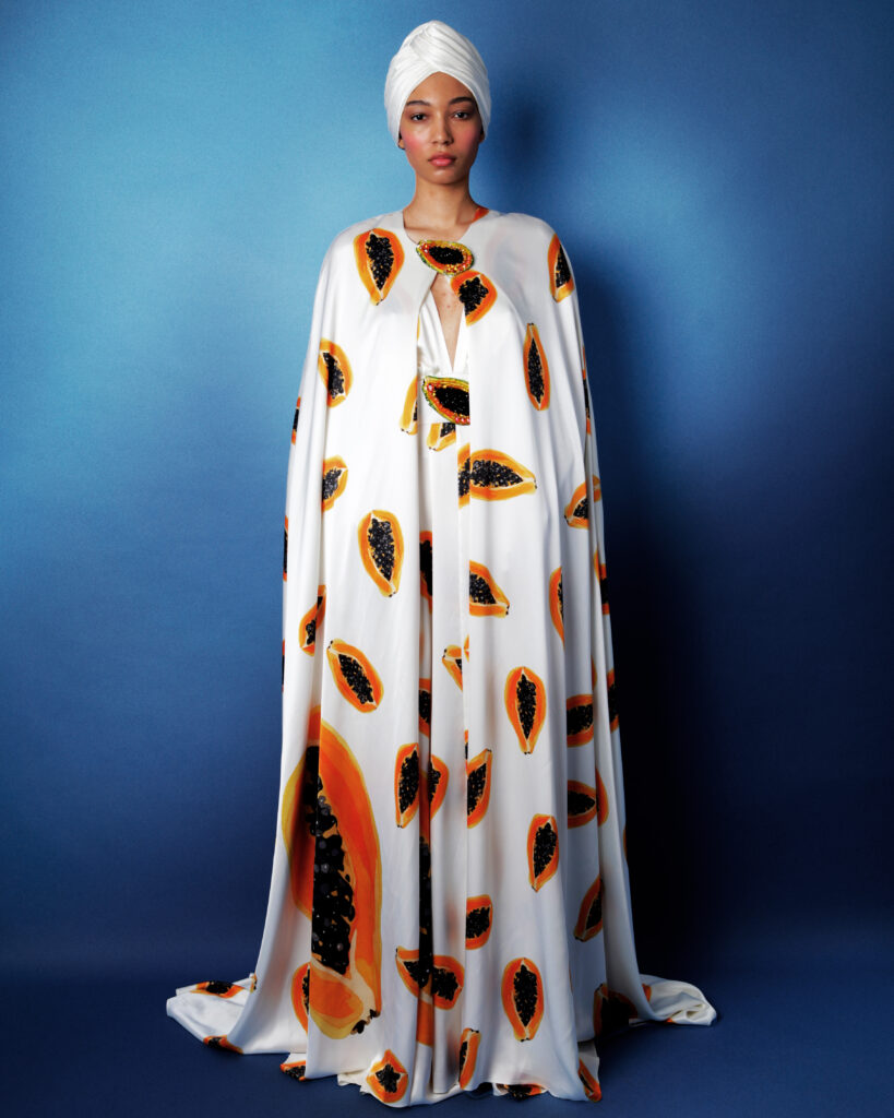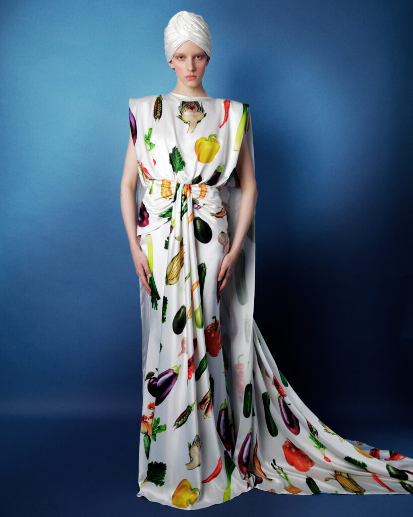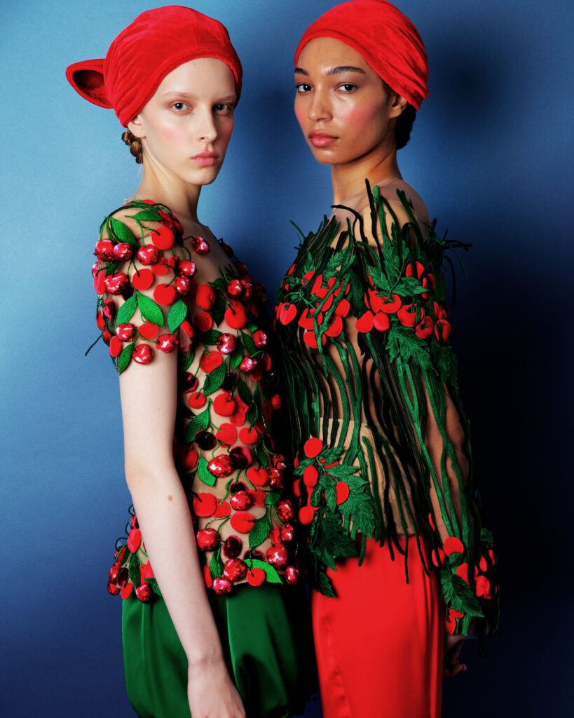 La collection met en avant les coupes emblématiques de la maison : robes fluides en soie et mousseline, tailleurs en velours et en soie tussah, sublimés par des imprimés peints à la main représentant baies, fruits et légumes. Chaque pièce célèbre la féminité sous toutes ses formes, reflétant l’élégance naturelle de celle qui la porte.