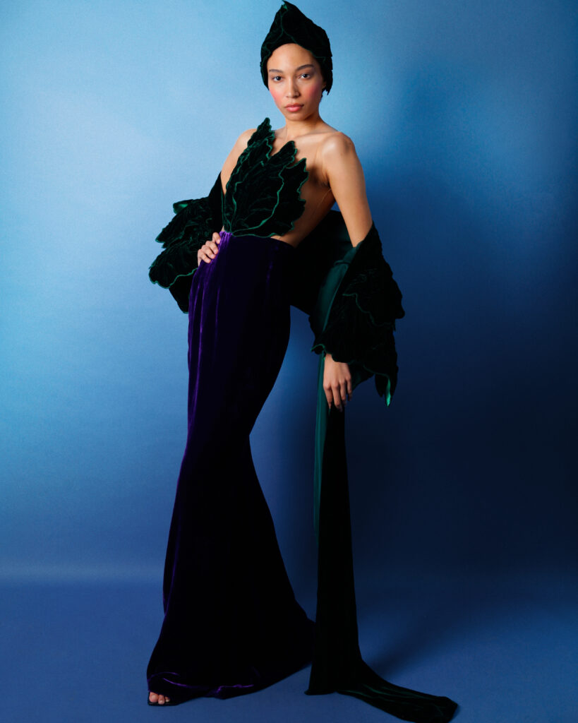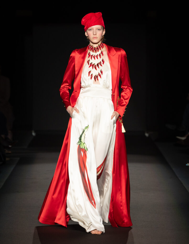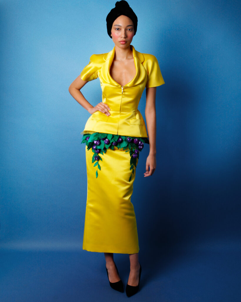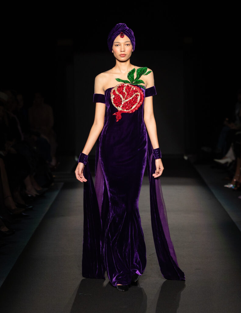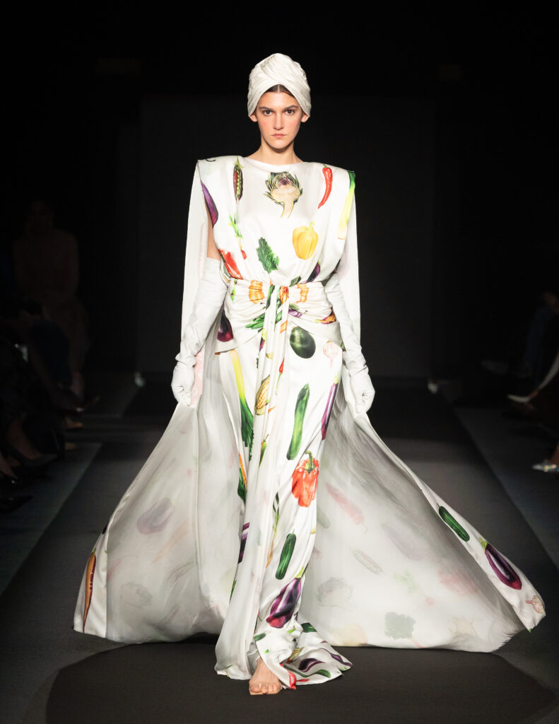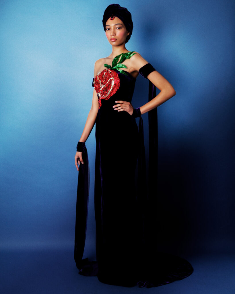 La collection met en avant les coupes emblématiques de la maison : robes fluides en soie et mousseline, tailleurs en velours et en soie tussah, sublimés par des imprimés peints à la main représentant baies, fruits et légumes. Chaque pièce célèbre la féminité sous toutes ses formes, reflétant l’élégance naturelle de celle qui la porte.