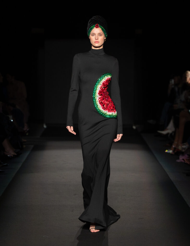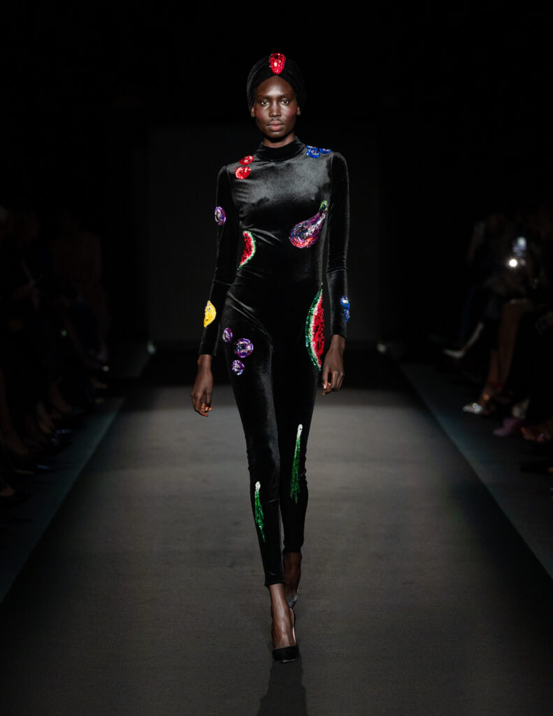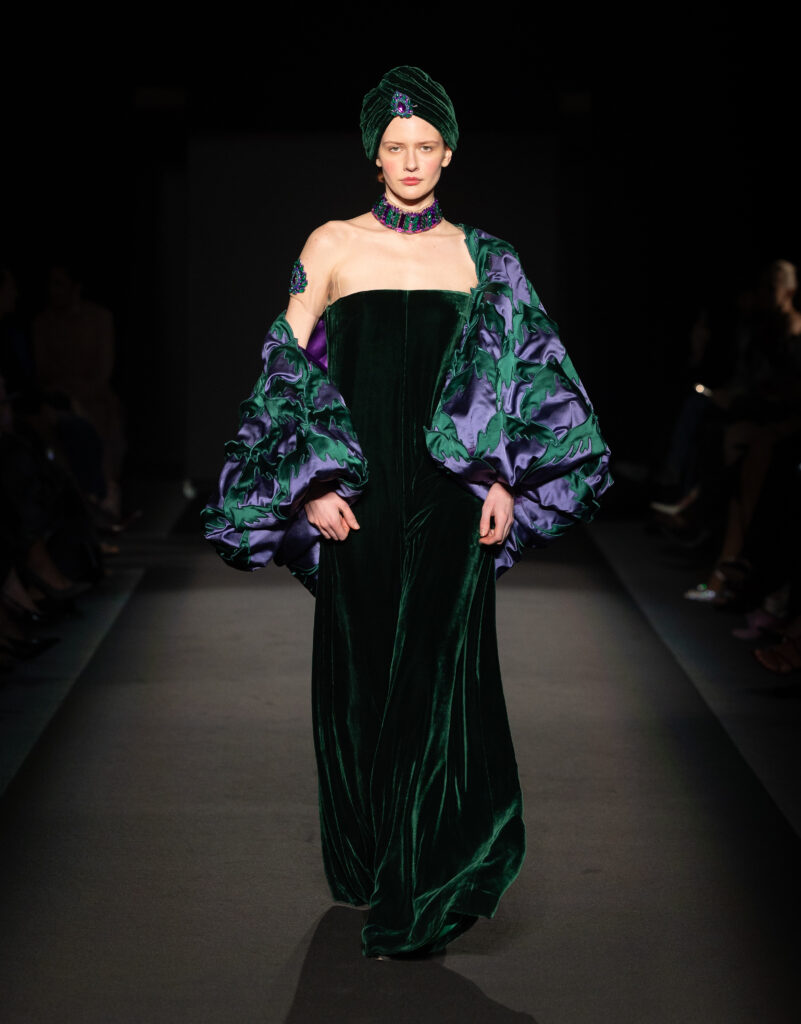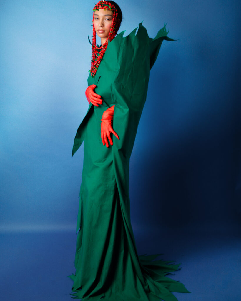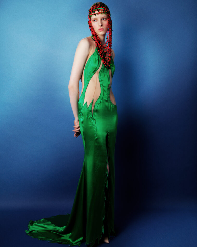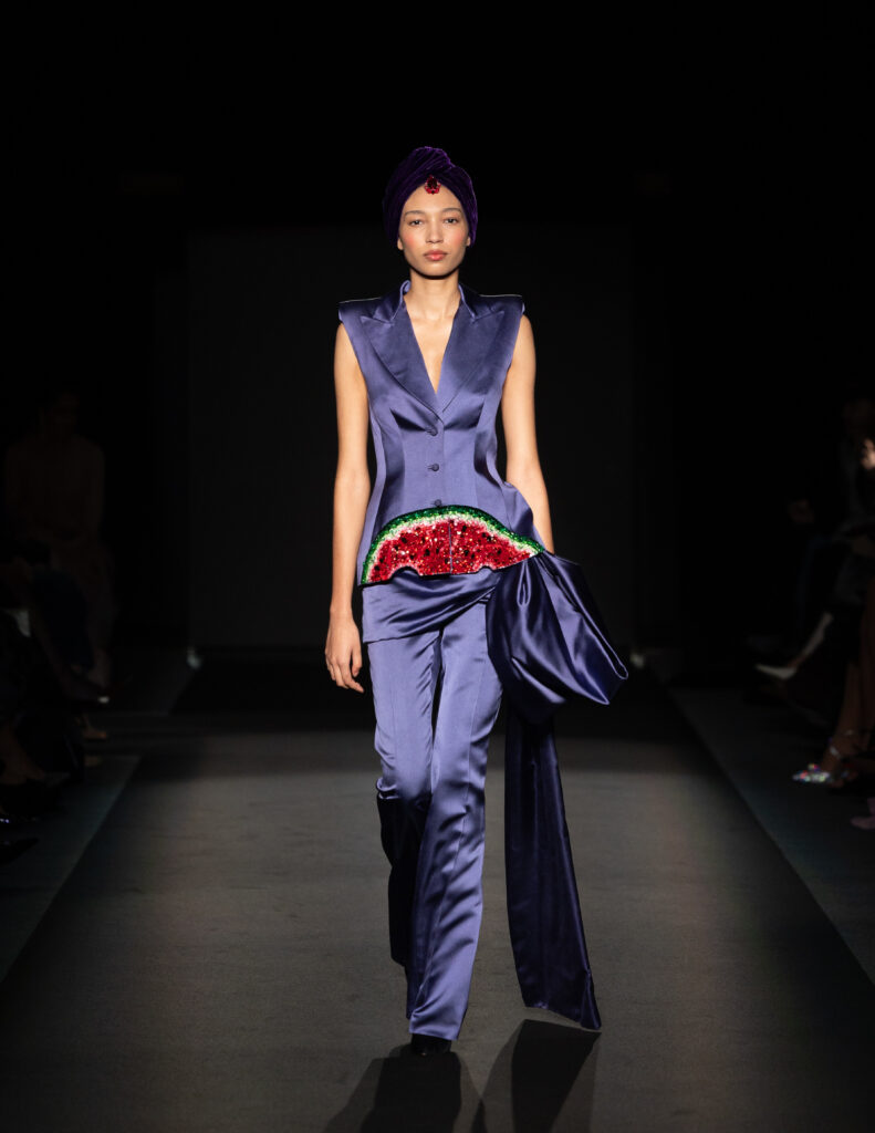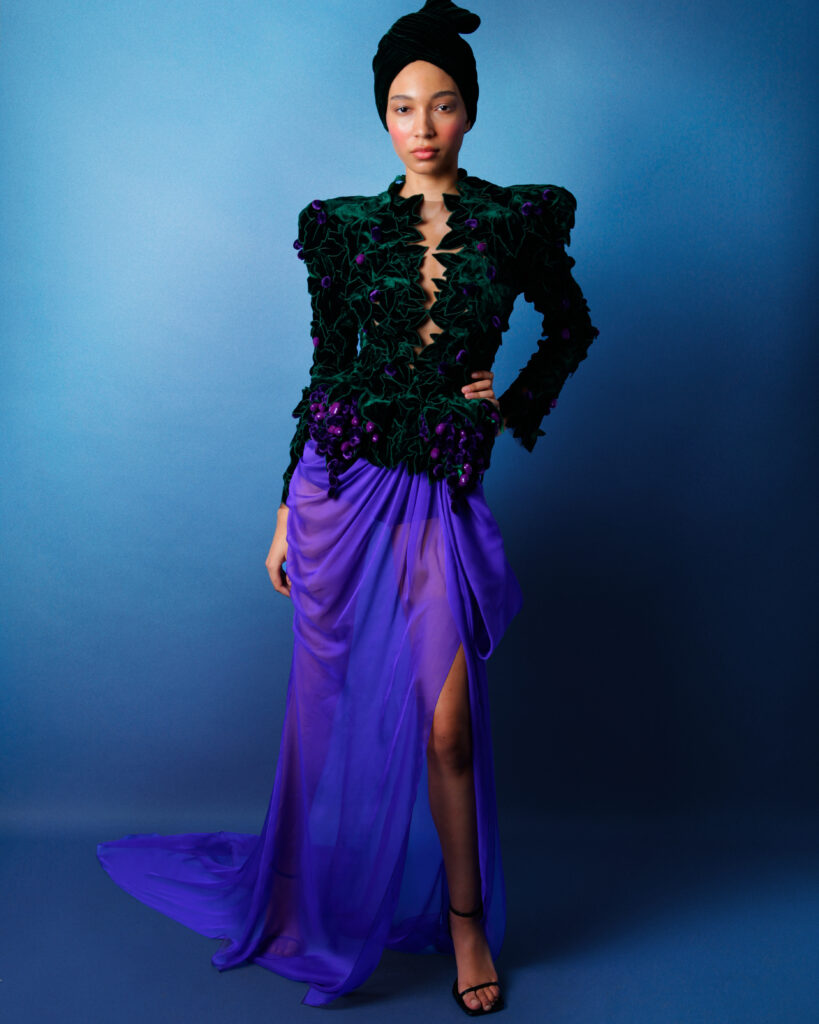 La collection met en avant les coupes emblématiques de la maison : robes fluides en soie et mousseline, tailleurs en velours et en soie tussah, sublimés par des imprimés peints à la main représentant baies, fruits et légumes. Chaque pièce célèbre la féminité sous toutes ses formes, reflétant l’élégance naturelle de celle qui la porte.