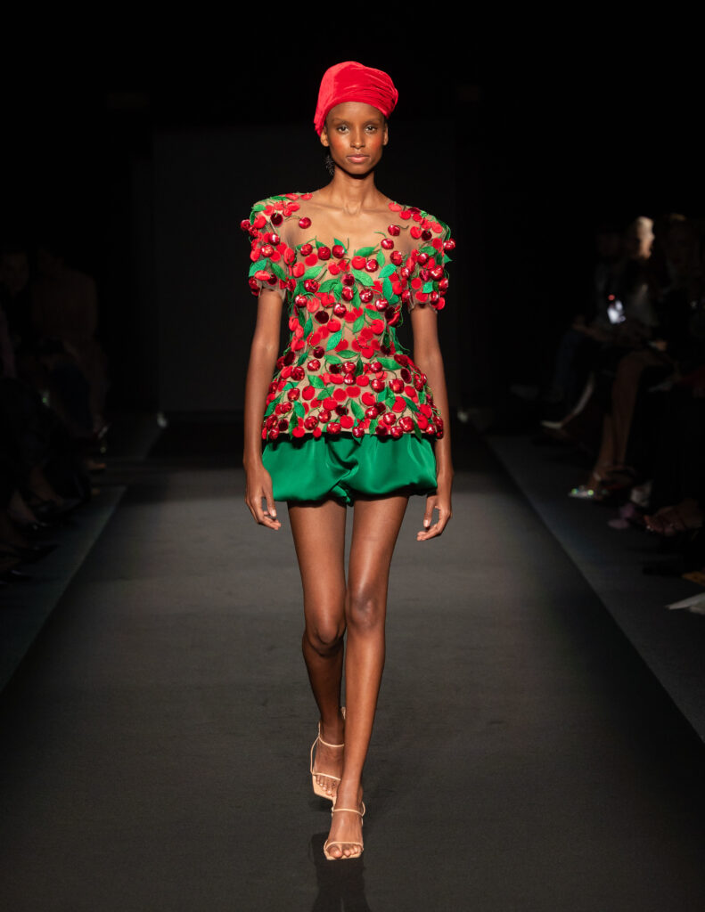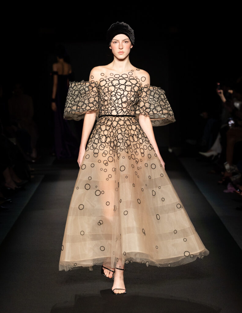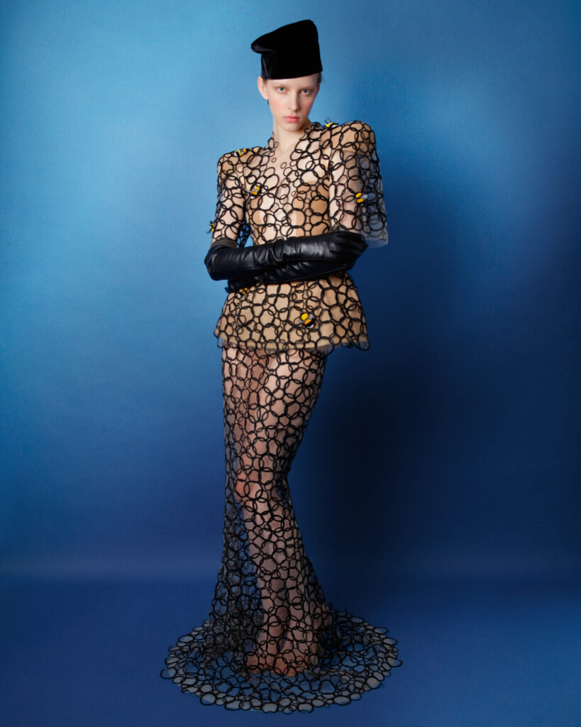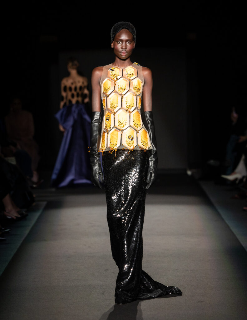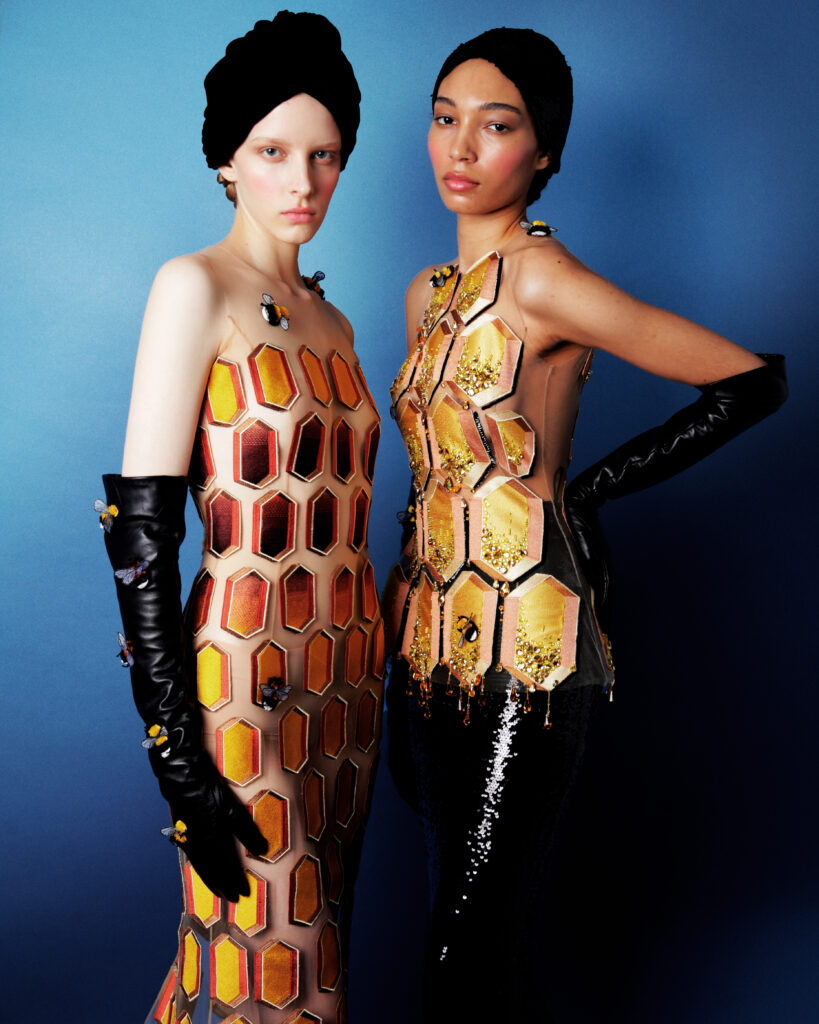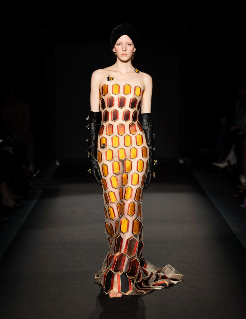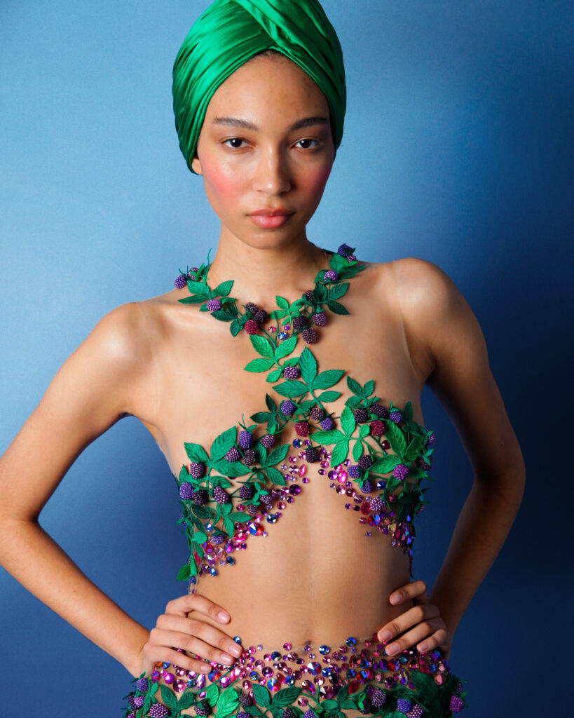 Les broderies exclusives transforment les tissus en jardins enchantés : motifs floraux en relief, grappes de baies et abeilles en trois dimensions évoquent un monde onirique. La minutie des appliqués et des décors en volume fait de chaque tenue une œuvre d’art, entre sophistication et poésie.
