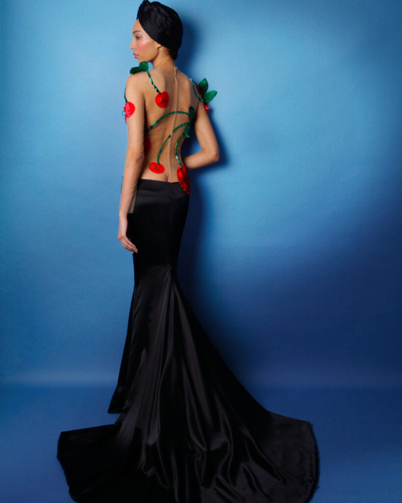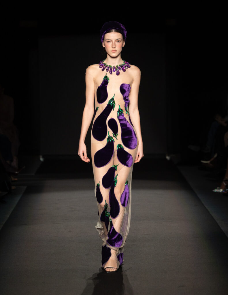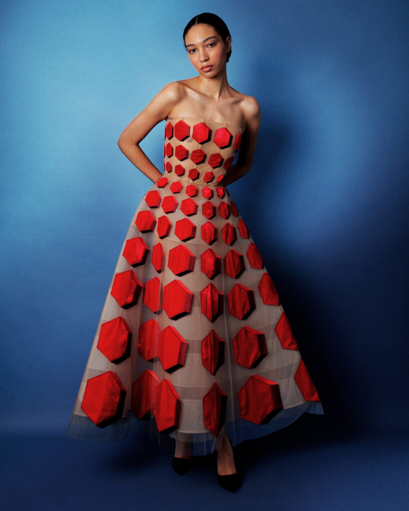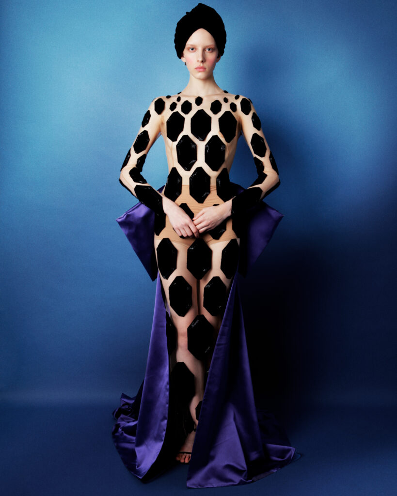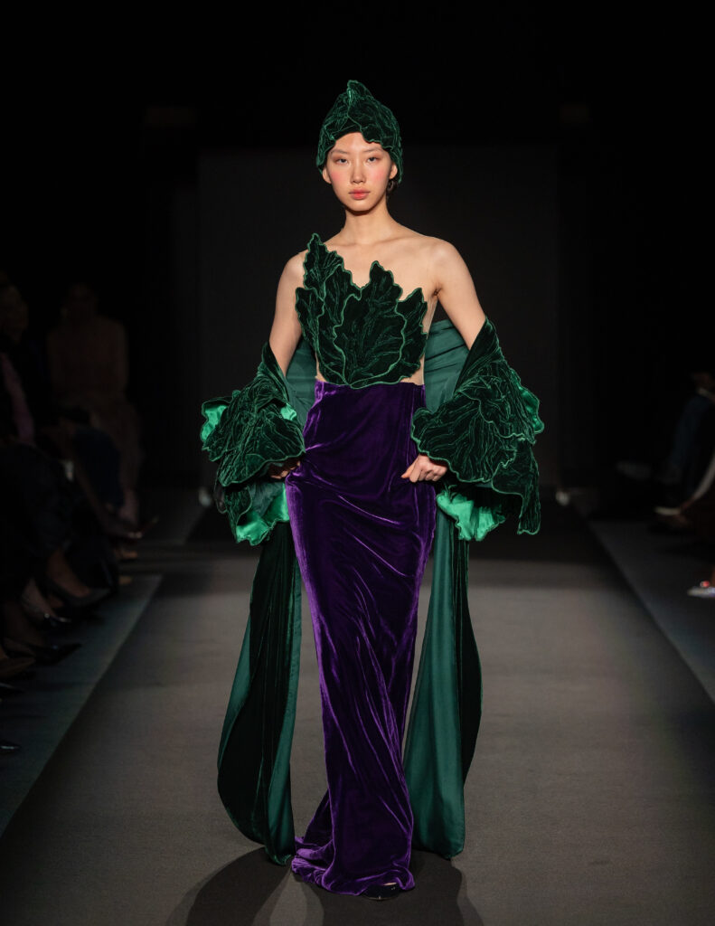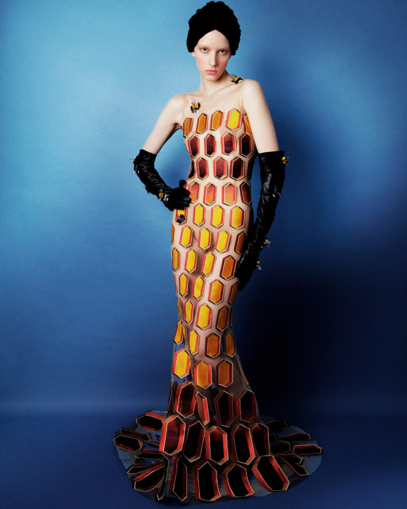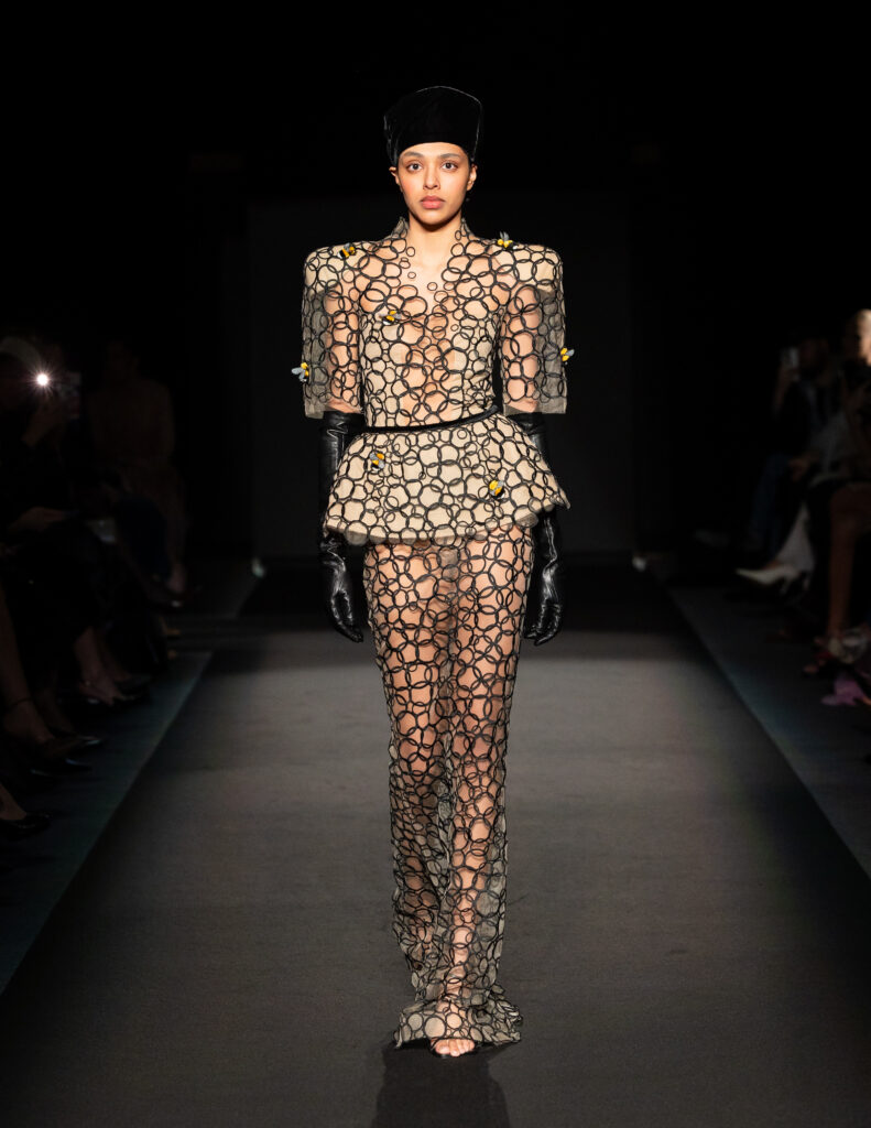 Les broderies exclusives transforment les tissus en jardins enchantés : motifs floraux en relief, grappes de baies et abeilles en trois dimensions évoquent un monde onirique. La minutie des appliqués et des décors en volume fait de chaque tenue une œuvre d’art, entre sophistication et poésie.